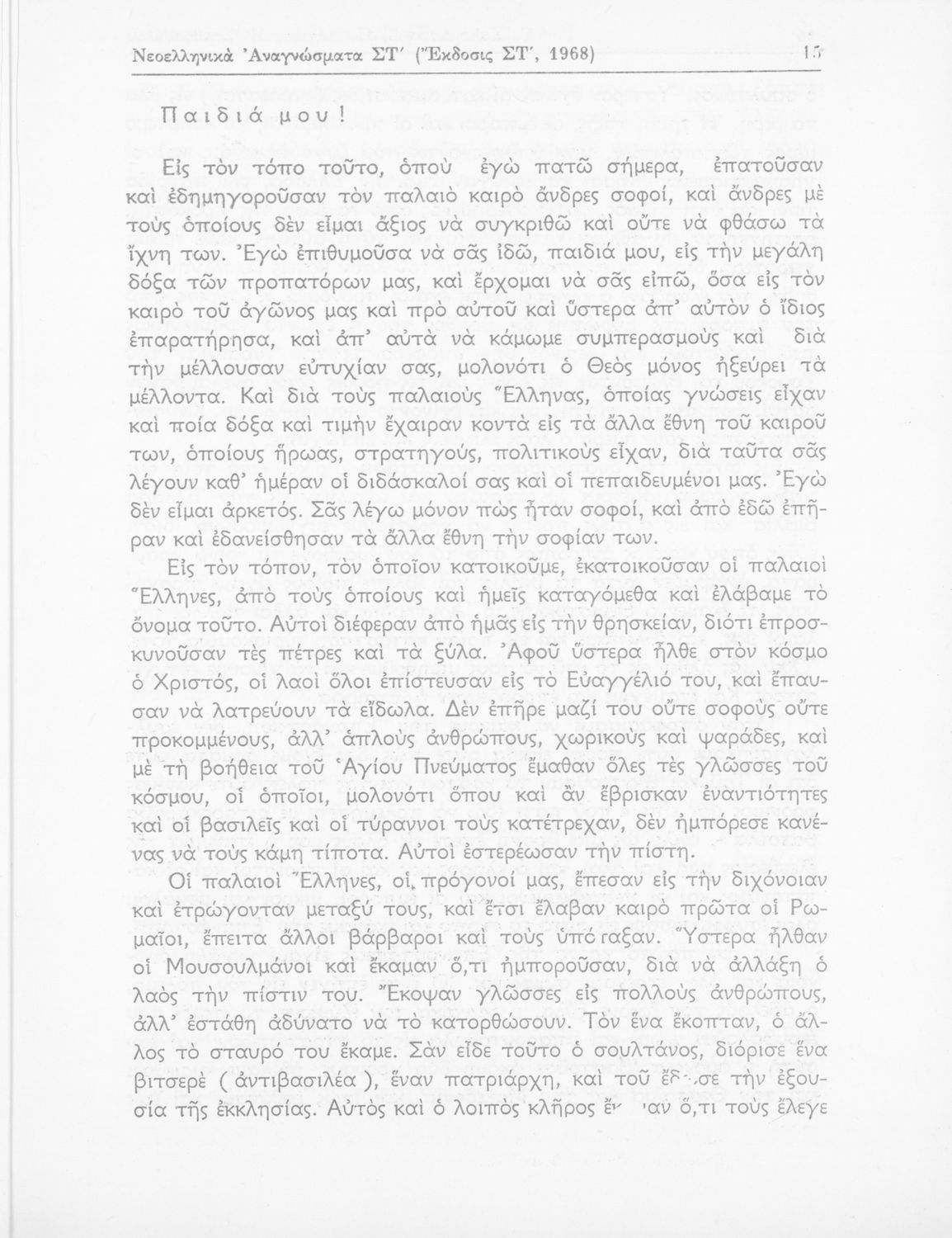 Σχολικό εγχειρίδιο Νέων Ελληνικών ΣΤ΄ Γυμνασίου που περιέχει πεζά και ποιήματα συγγραφέων της βυζαντινής και μεταβυζαντινής περιόδου πατριωτικού και θρησκευτικού περιεχομένου και δημοτικά τραγούδια. ...