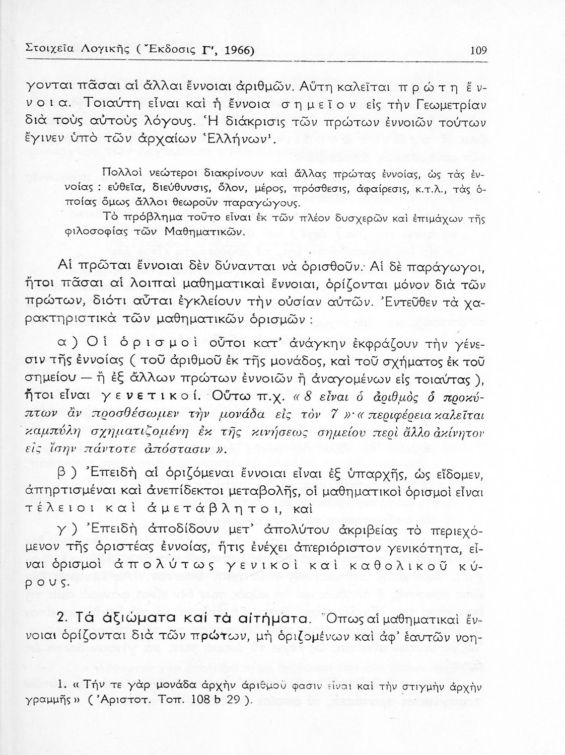 Βαθμίδα εκπαίδευσης: Δευτεροβάθμια Τάξη: ΣΤ' Γυμνασίου Μάθημα: Λογική Γλώσσα: Απλή καθαρεύουσα Παρουσίαση περιεχομένου: Σχολικό εγχειρίδιο Λογικής ΣΤ΄ Γυμνασίου που είναι δομημένο θεματικά και περιλαμβάνει ζητήματα τυπικής λογικής, μεθοδολογίας και γνωσιολογίας. Περιέχει παράρτημα με ασκήσεις λογικής. |