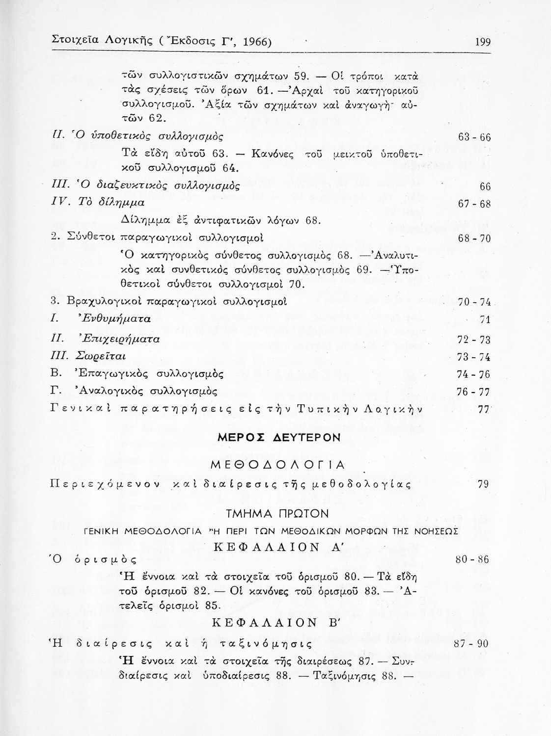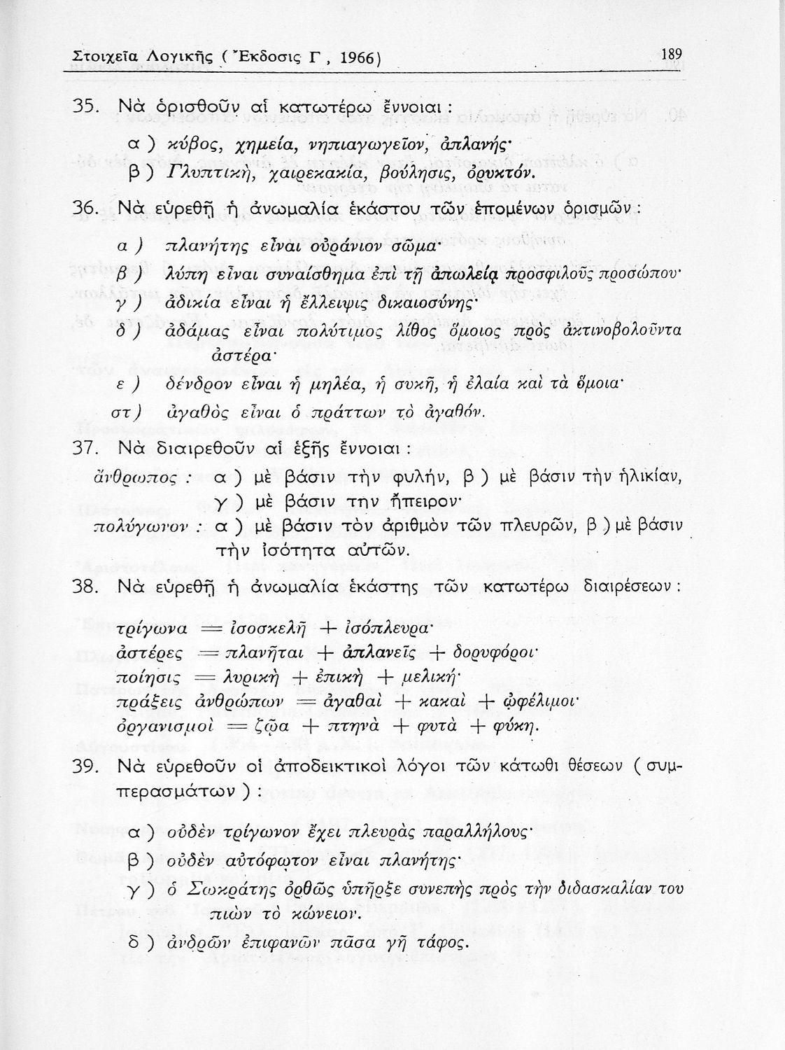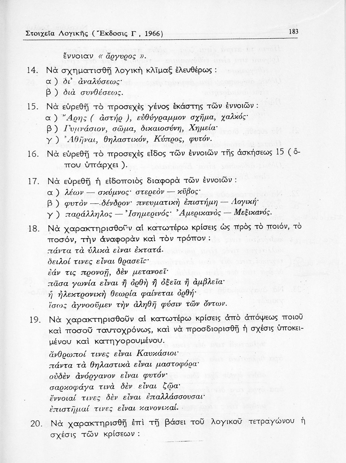 Σχολικό εγχειρίδιο Λογικής για τη ΣΤ΄ Γυμνασίου που είναι χωρισμένο σε στοιχειολογία ή τυπική λογική, μεθοδολογία και γνωσιολογία. Περιέχει ασκήσεις λογικής.