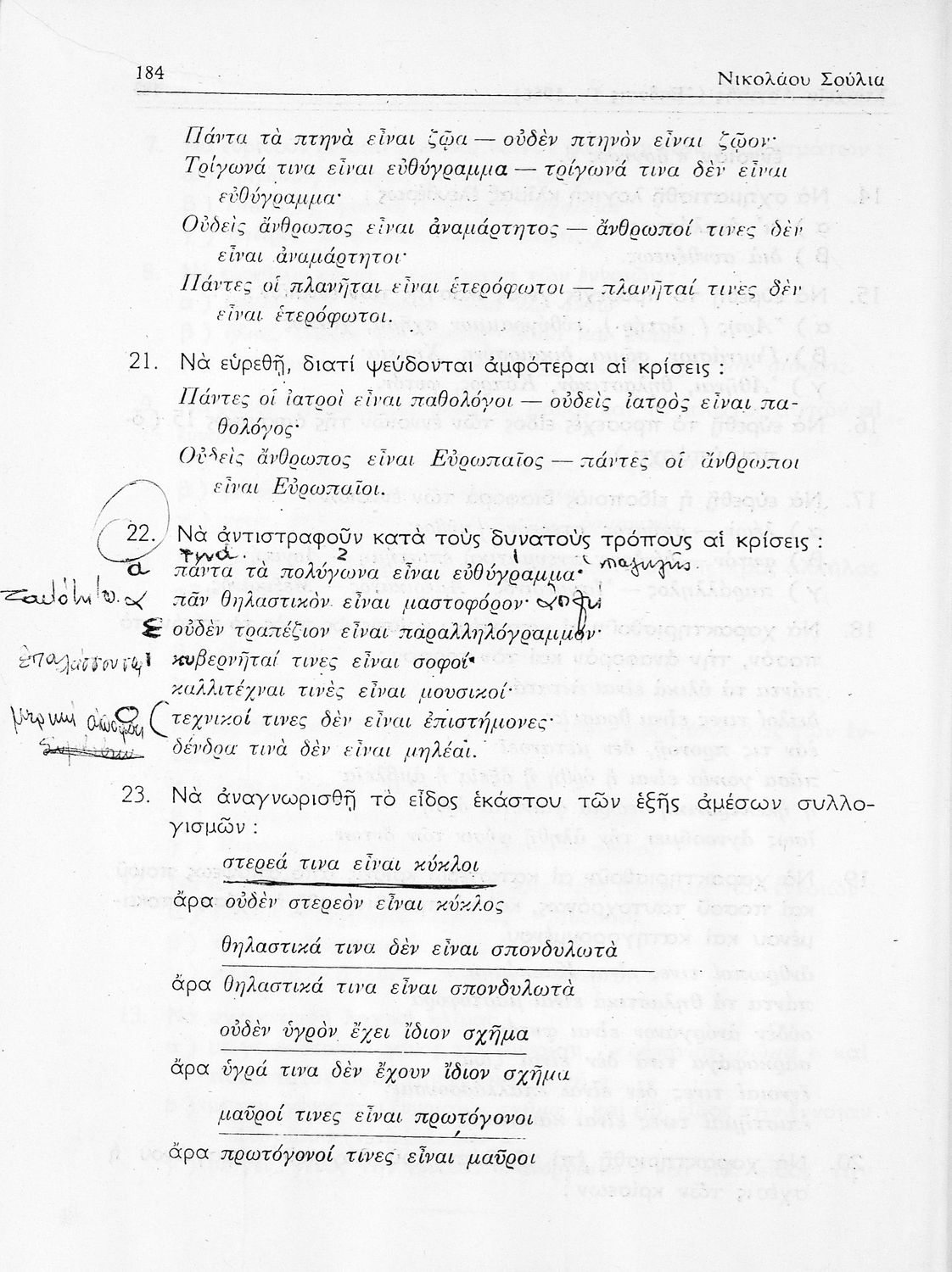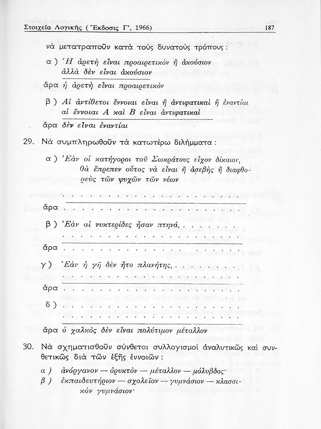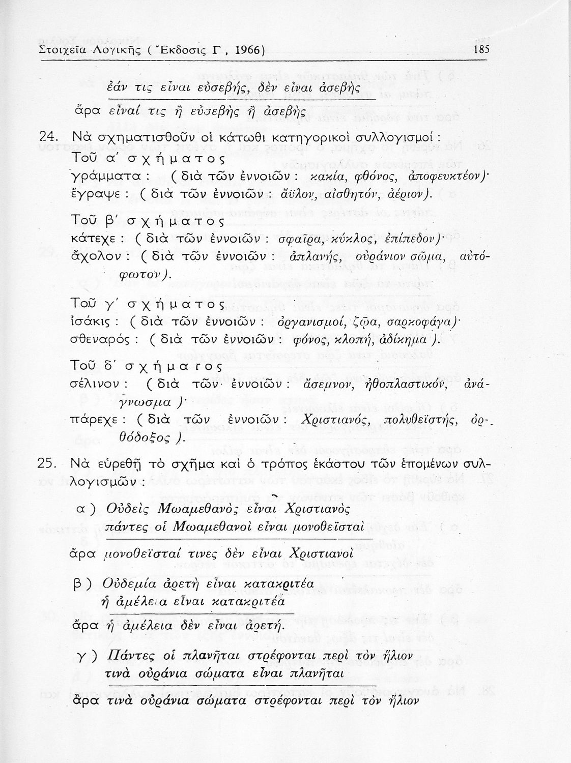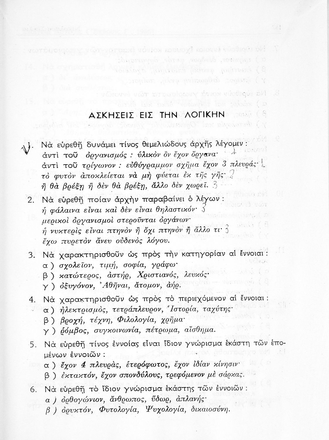 Σχολικό εγχειρίδιο Λογικής για τη ΣΤ΄ Γυμνασίου που είναι χωρισμένο σε στοιχειολογία ή τυπική λογική, μεθοδολογία και γνωσιολογία. Περιέχει ασκήσεις λογικής.