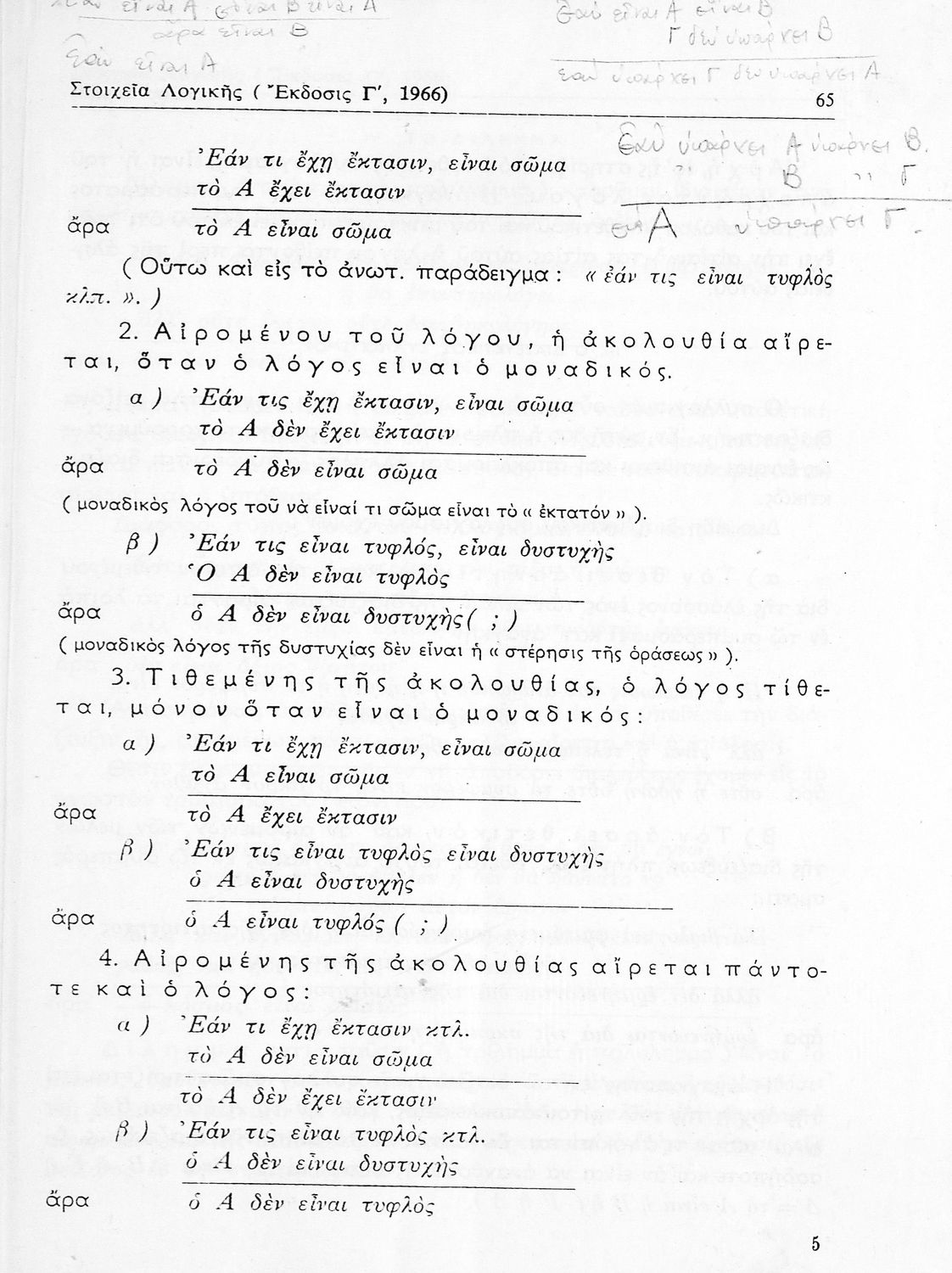 Βαθμίδα εκπαίδευσης: Δευτεροβάθμια Τάξη: ΣΤ' Γυμνασίου Μάθημα: Λογική Γλώσσα: Απλή καθαρεύουσα Παρουσίαση περιεχομένου: Σχολικό εγχειρίδιο Λογικής ΣΤ΄ Γυμνασίου που είναι δομημένο θεματικά και περιλαμβάνει ζητήματα τυπικής λογικής, μεθοδολογίας και γνωσιολογίας. Περιέχει παράρτημα με ασκήσεις λογικής. |