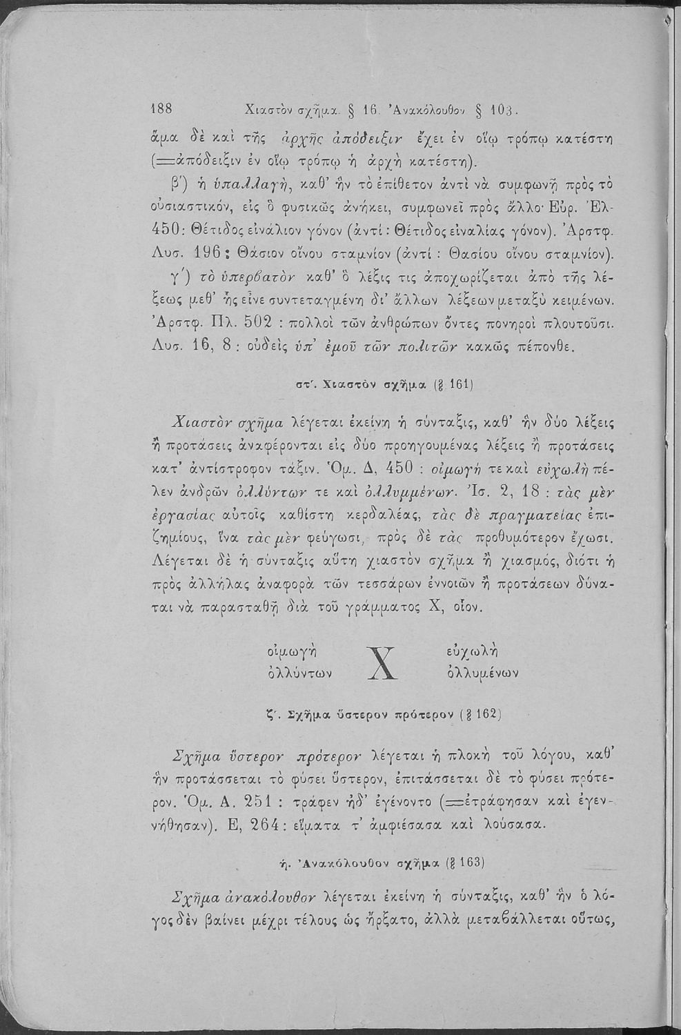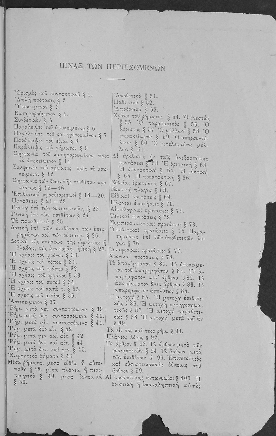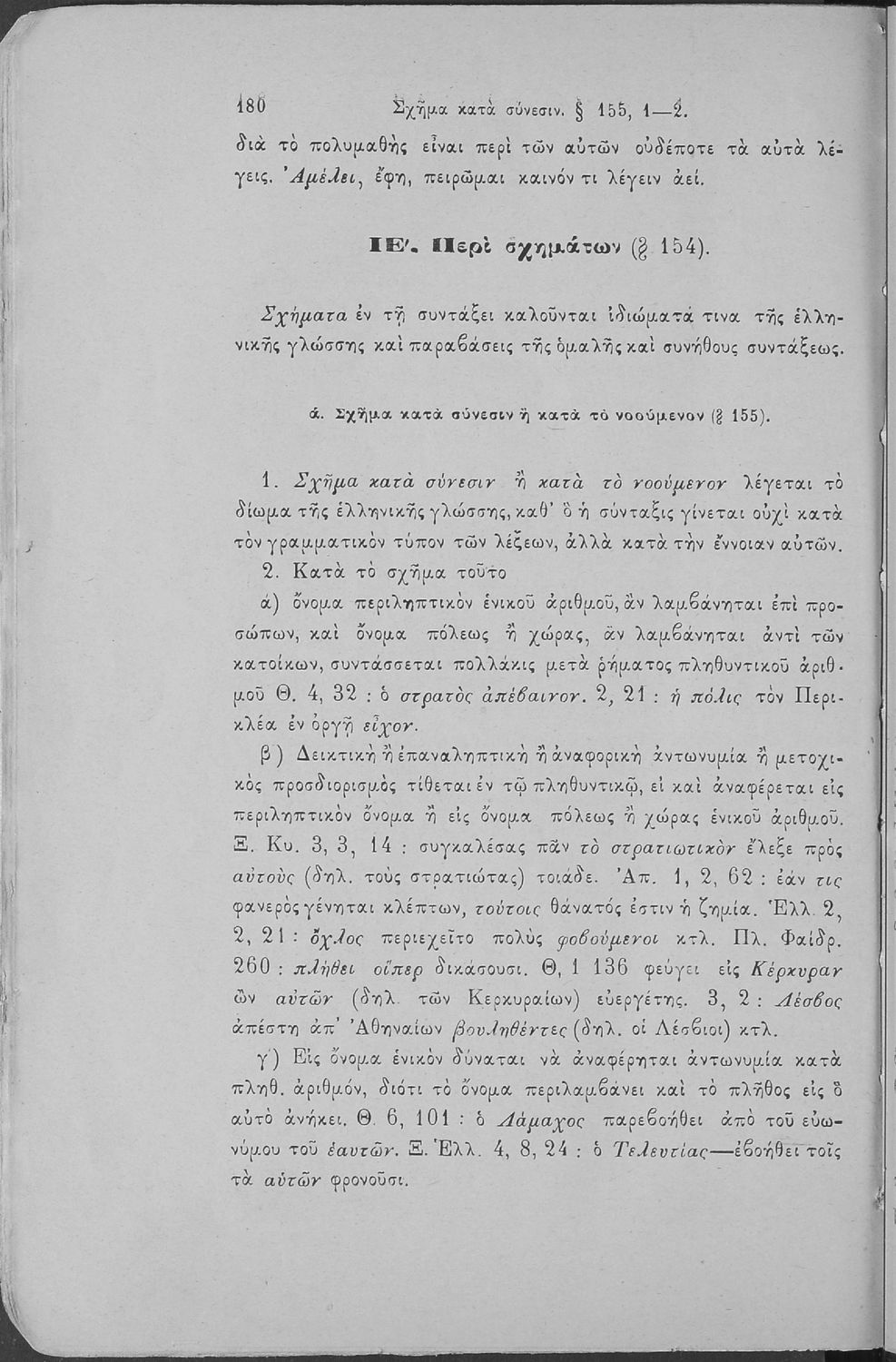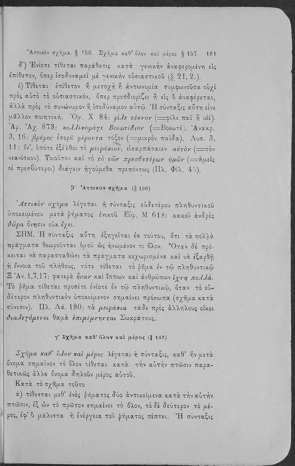 Σχολικό εγχειρίδιο Αρχαίων Ελληνικών για τα Ελληνικά Σχολεία και τα Ανώτερα Παρθεναγωγεία που εξετάζει τα μέρη του λόγου και την σύνταξή τους.