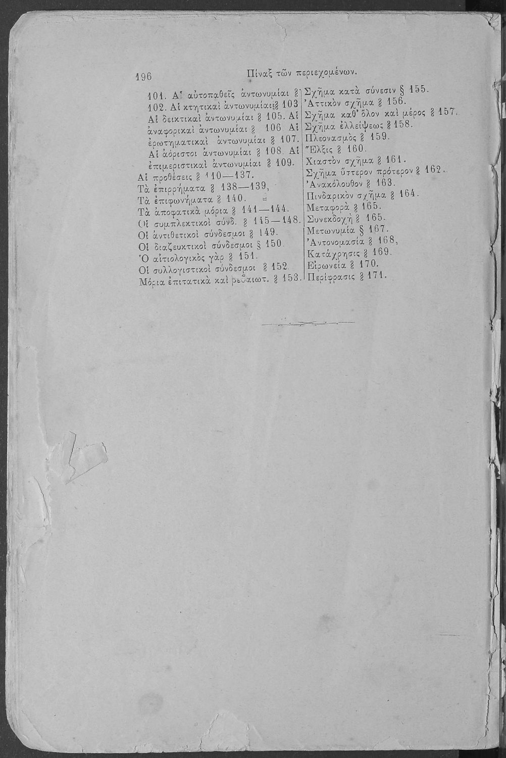 Μαθητικό βοήθημα Αρχαίων Ελληνικών για τα Ελληνικά Σχολεία, Παρθεναγωγεία και Γυμνάσια που περιλαμβάνει γραμματική της αρχαίας ελληνικής και κατάλογο ανωμάλων ρημάτων.