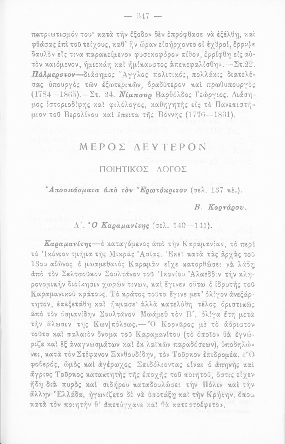 Σχετιζόμενοι όροι:  Κορνάρος, Κάλβος, Κοραής, Παλαμάς
