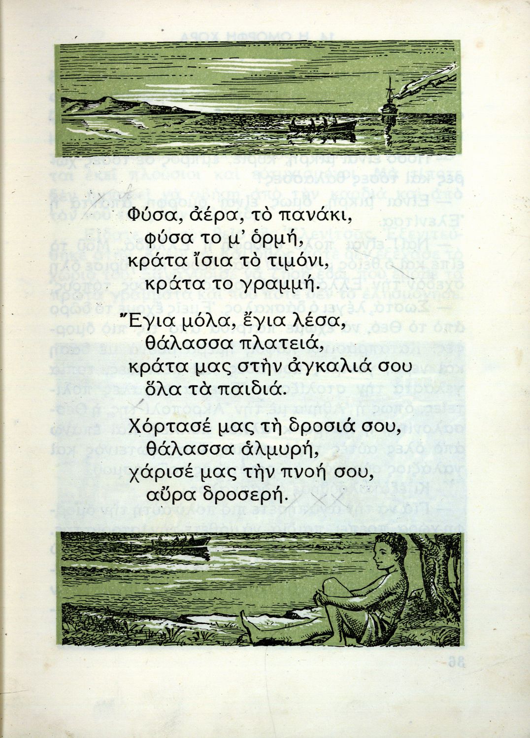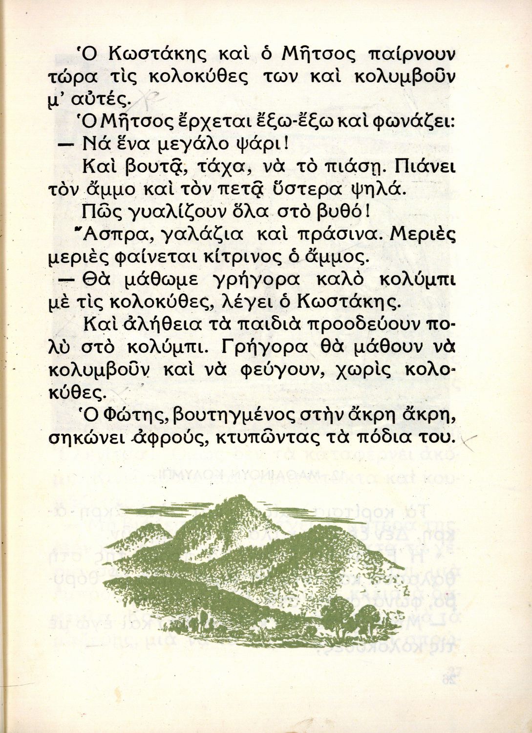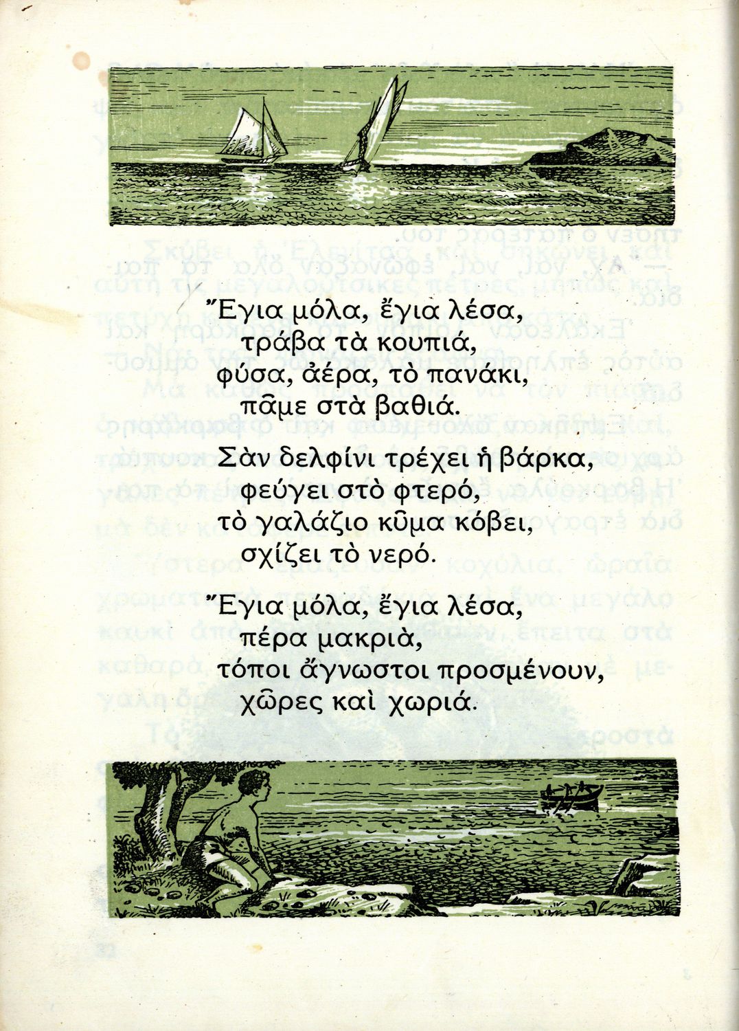 Αναγνωστικό Γ΄ Δημοτικού που περιλαμβάνει ποιήματα και πεζά εμπνευσμένα από την ελληνική φύση, τις ασχολίες των κατοίκων, την σύγχρονη ελληνική ιστορία, την ελληνική μυθολογία και τις θρησκευτικές γιορτές.
