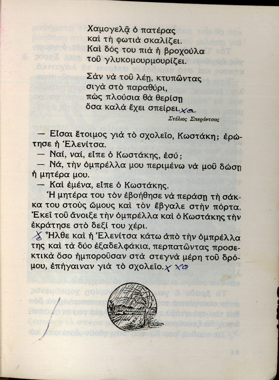 Αναγνωστικό Γ' Δημοτικού που είναι χωρισμένο σύμφωνα με τις εποχές του χρόνου και περιλαμβάνει ποιήματα και πεζά εμπνευσμένα από τη ζωή στην ύπαιθρο, την εθνική, οικογενειακή και κοινωνική ζωή, τη θρησκευτική παράδοση, τις ασχολίες των ανθρώπων, και την ελληνική φύση.