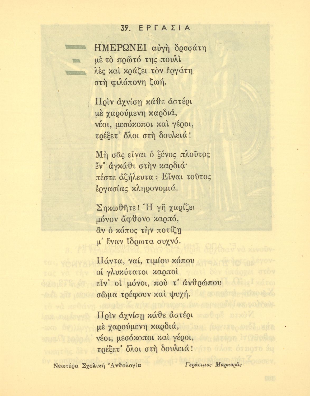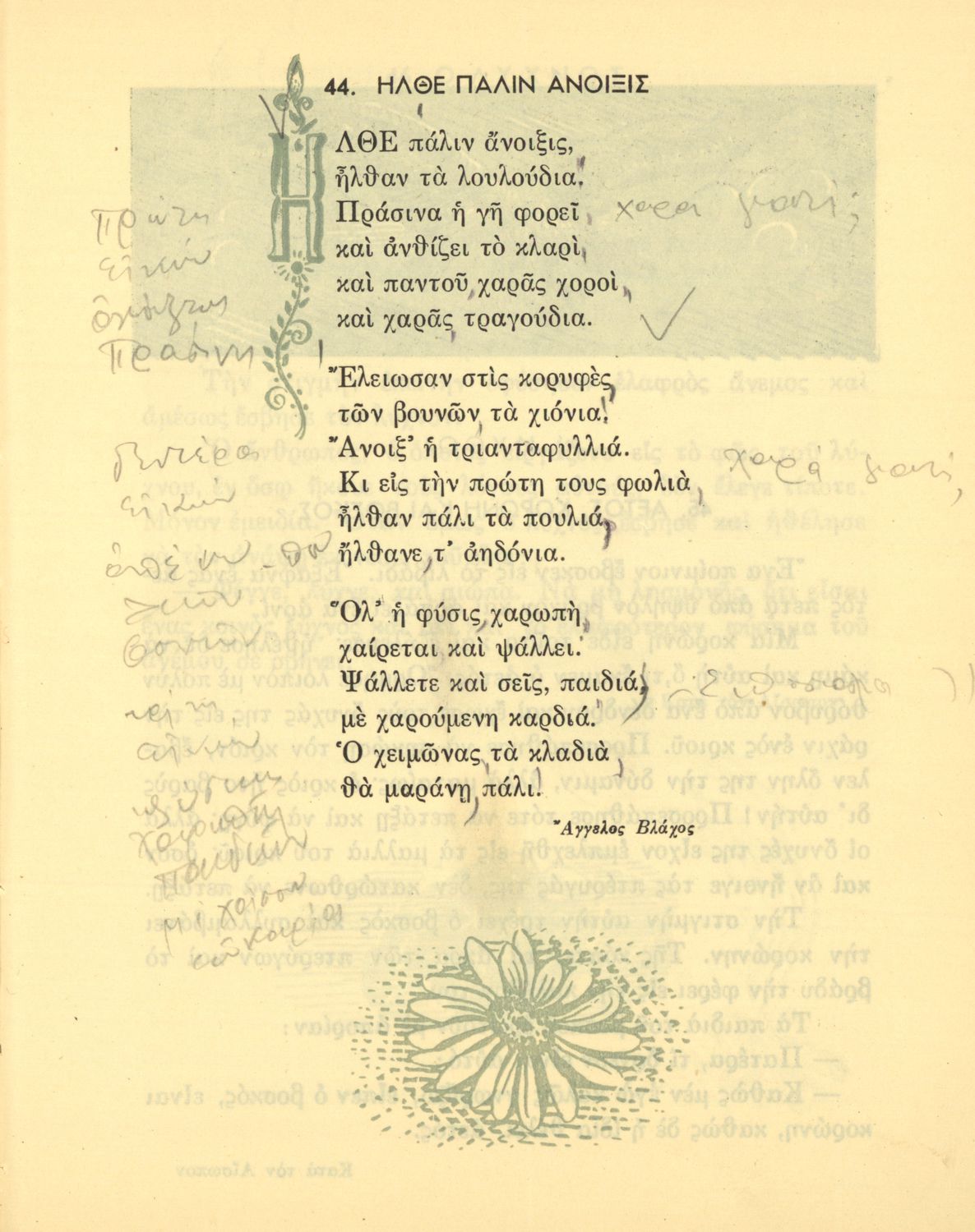Αναγνωστικό Δ' Δημοτικού που είναι χωρισμένο σύμφωνα με τις εποχές του χρόνου και περιλαμβάνει ποιήματα και πεζά εμπνευσμένα από τη ζωή στην ύπαιθρο, την εθνική, οικογενειακή και κοινωνική ζωή, τη θρησκευτική παράδοση, τις ασχολίες των ανθρώπων, και την ελληνική φύση, ιστορία και μυθολογία.