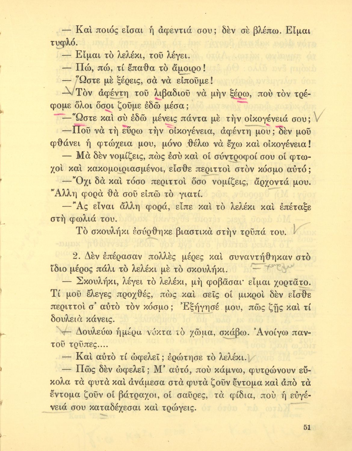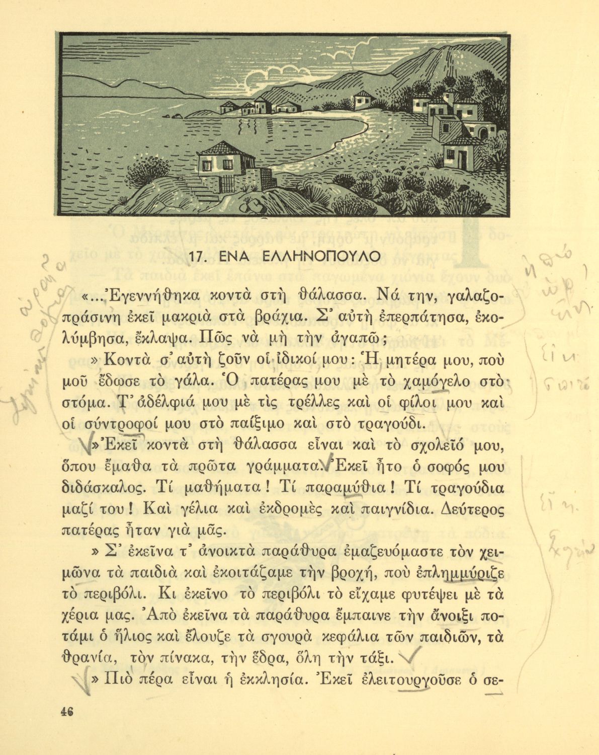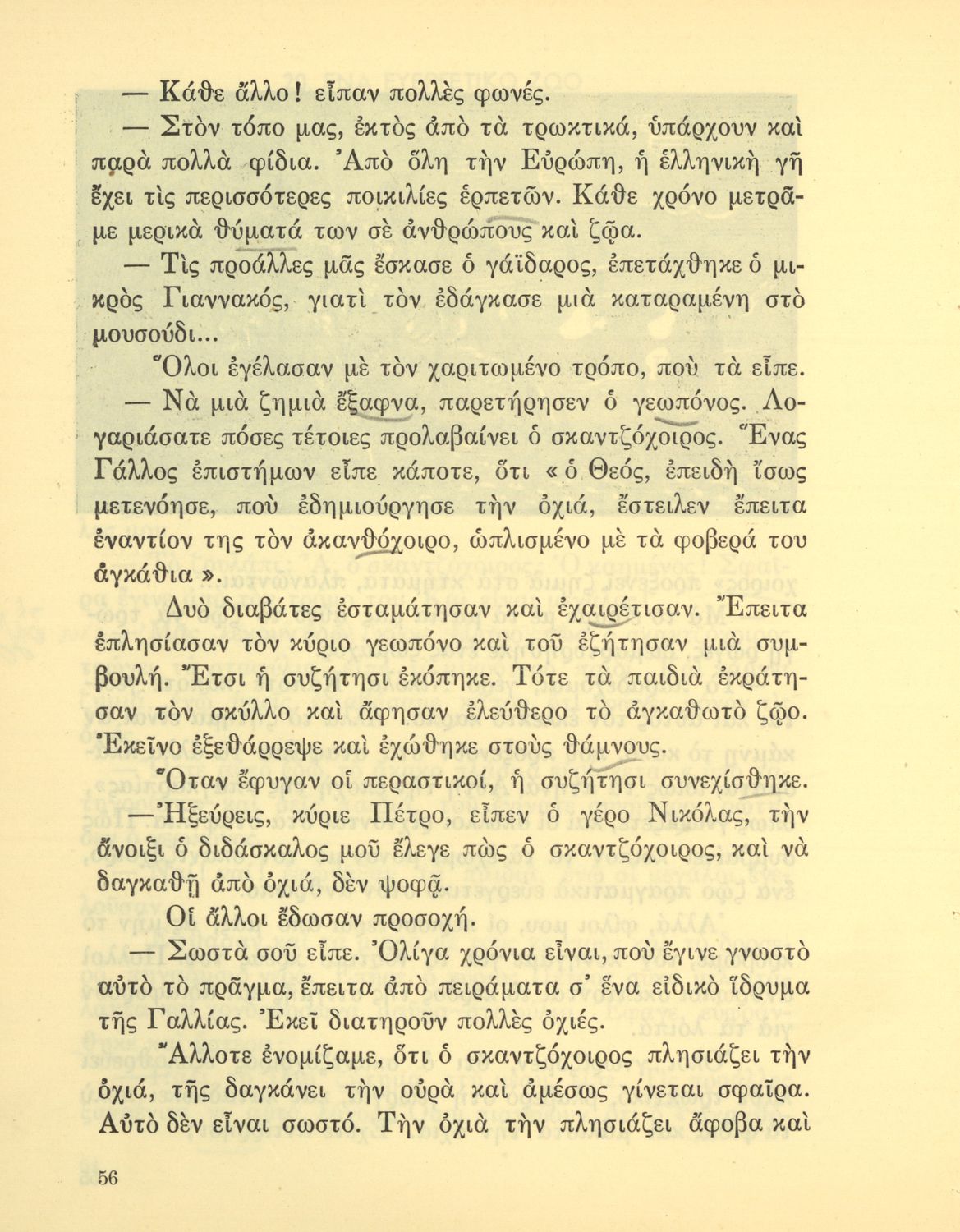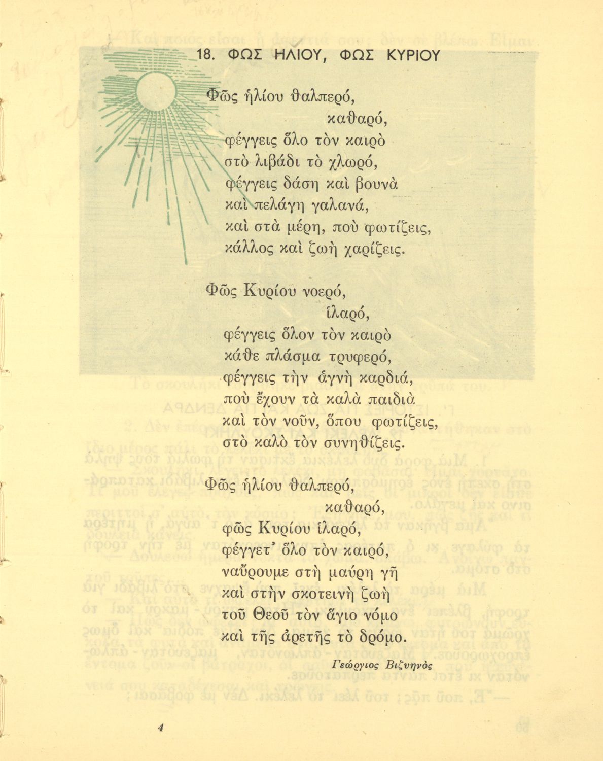 Αναγνωστικό Δ' Δημοτικού που είναι χωρισμένο σύμφωνα με τις εποχές του χρόνου και περιλαμβάνει ποιήματα και πεζά εμπνευσμένα από τη ζωή στην ύπαιθρο, την εθνική, οικογενειακή και κοινωνική ζωή, τη θρησκευτική παράδοση, τις ασχολίες των ανθρώπων, και την ελληνική φύση, ιστορία και μυθολογία.