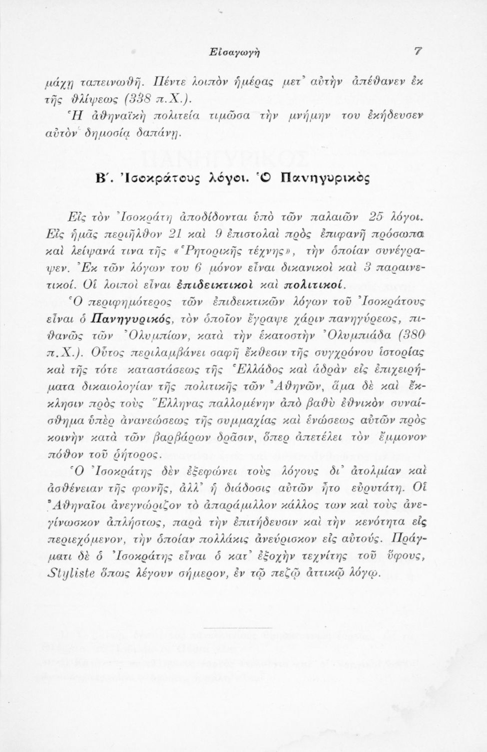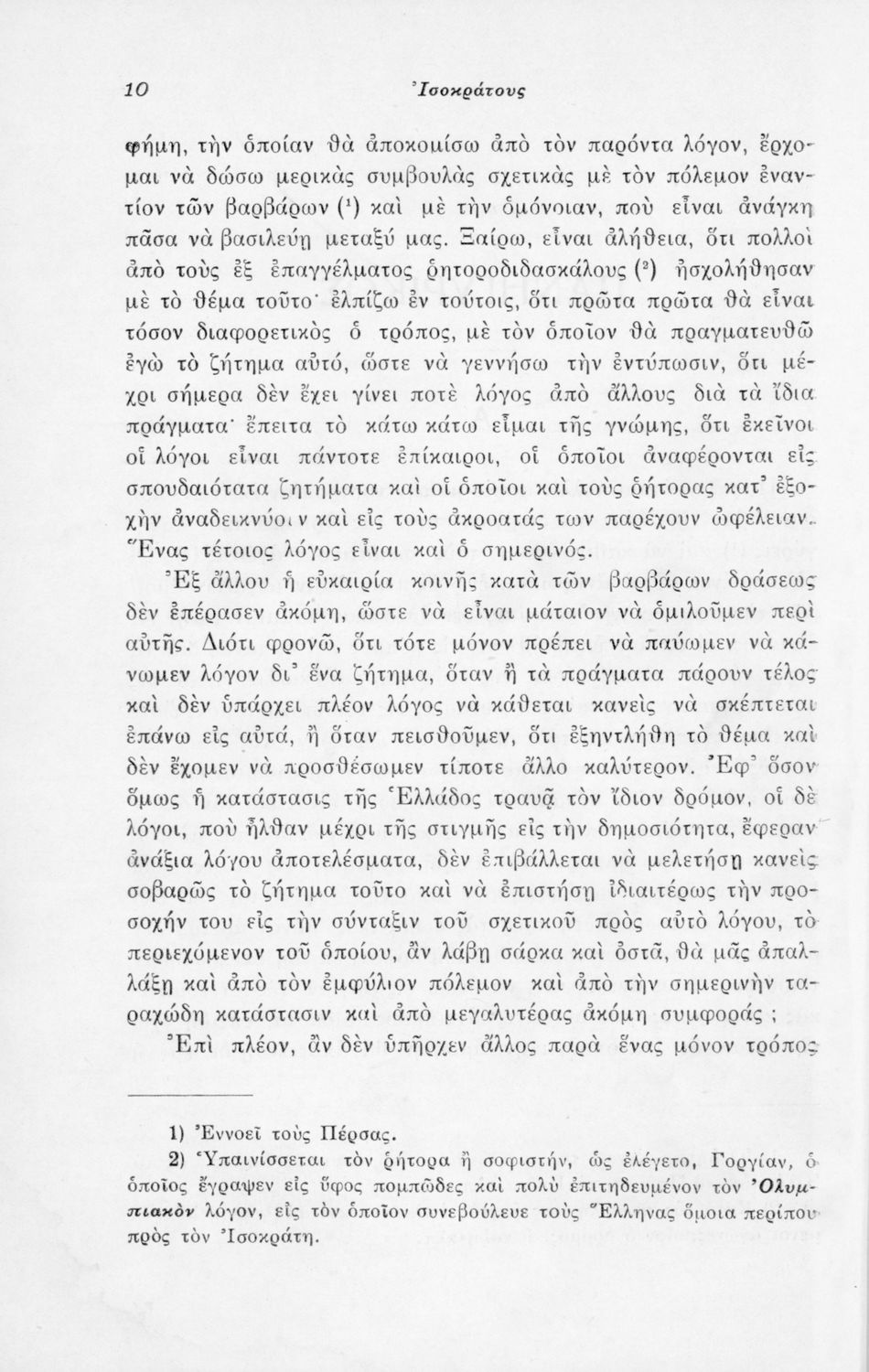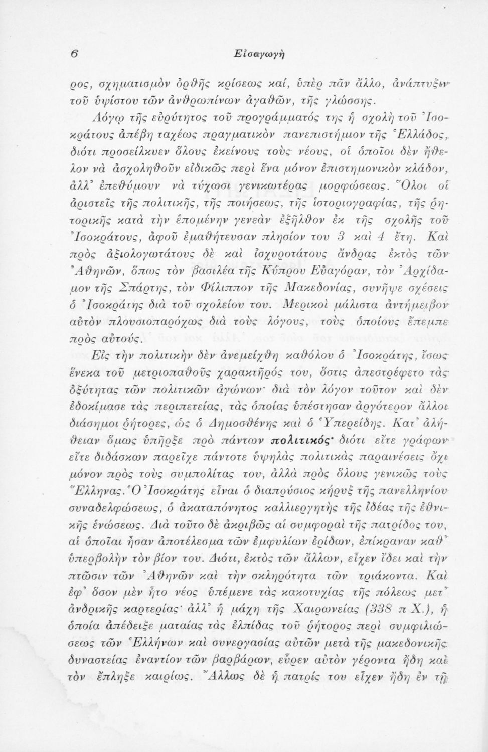 Σχολικό εγχειρίδιο Αρχαίων Ελληνικών Γ΄ Γυμνασίου που περιλαμβάνει μετάφραση του Λόγου του Ισοκράτη Πανηγυρικός, εισαγωγικά σχόλια για τη ζωή και το έργο του και ερμηνευτικά και πραγματολογικά σχόλια.