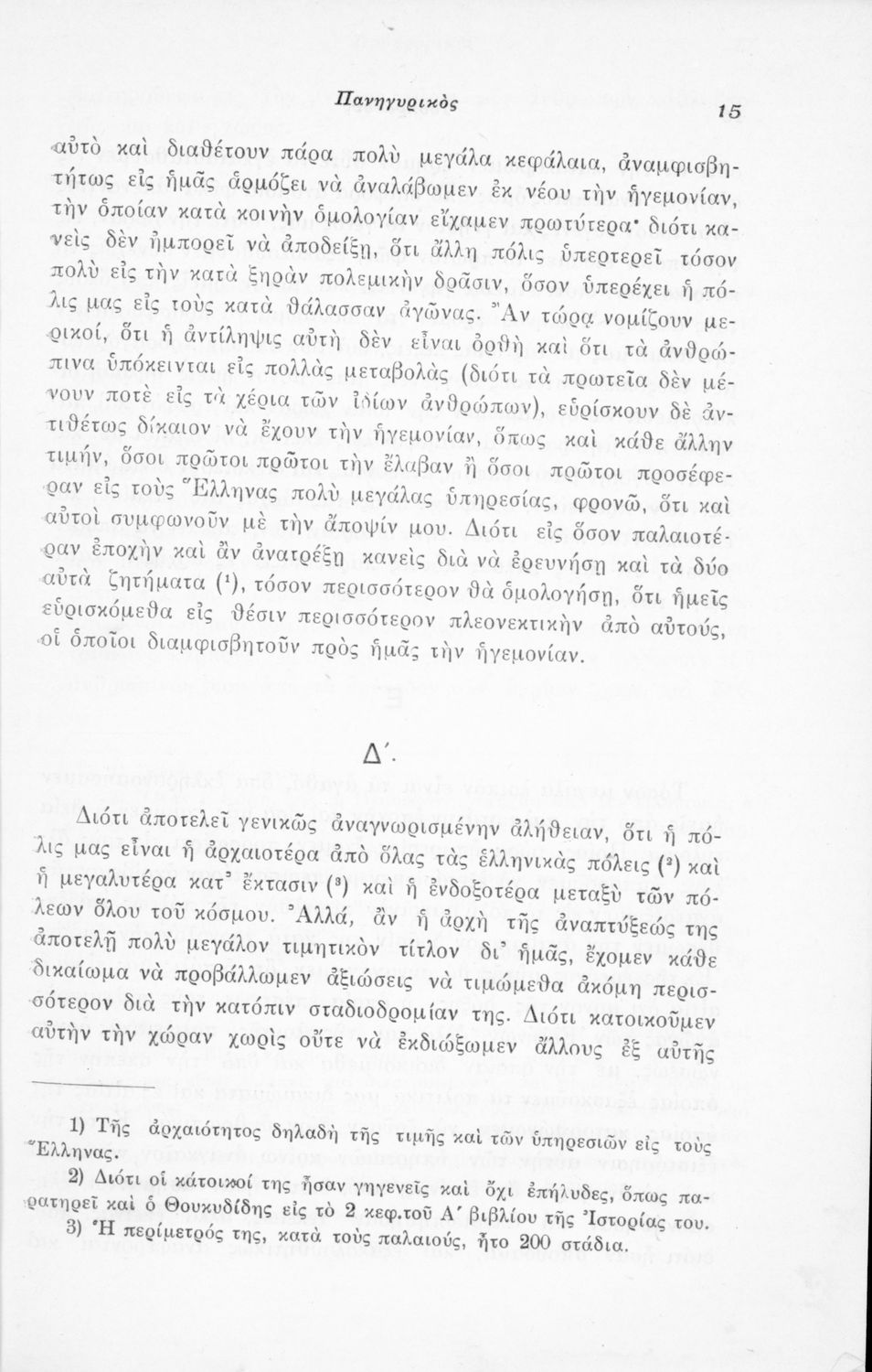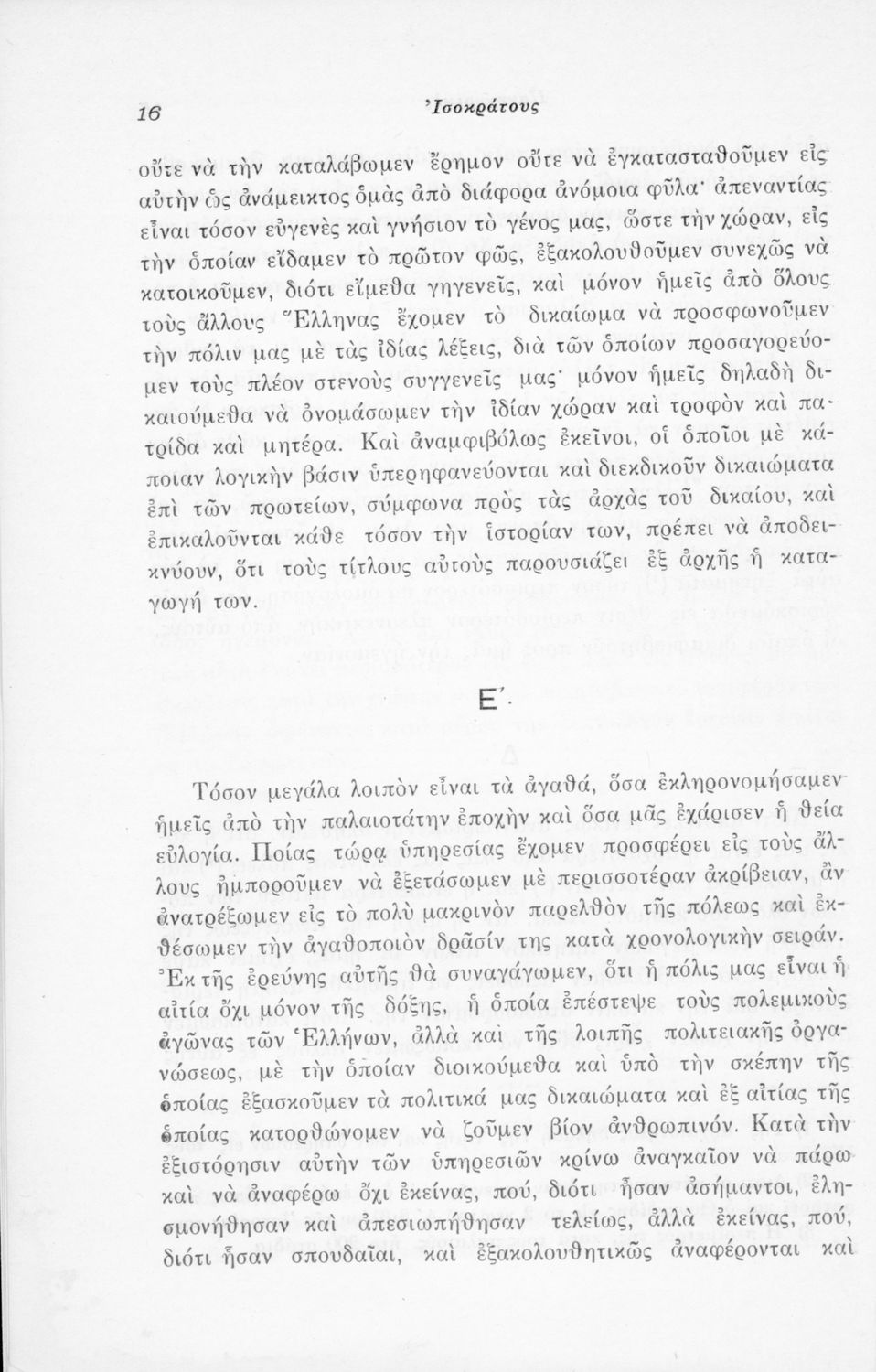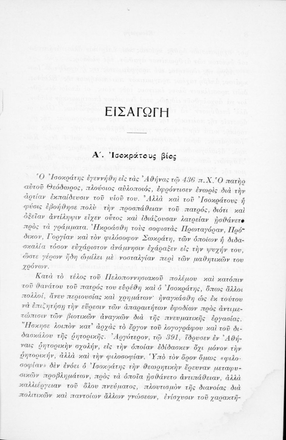 Σχολικό εγχειρίδιο Αρχαίων Ελληνικών Γ΄ Γυμνασίου που περιλαμβάνει μετάφραση του Λόγου του Ισοκράτη Πανηγυρικός, εισαγωγικά σχόλια για τη ζωή και το έργο του και ερμηνευτικά και πραγματολογικά σχόλια.