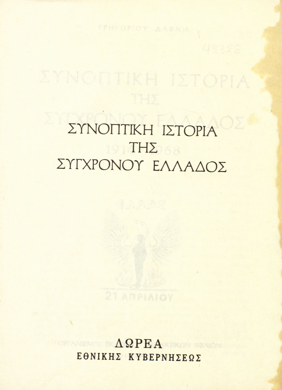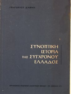 Κωδικός αναγνώρισης: 01-42326 Τίτλος: Συνοπτική Ιστορία της Συγχρόνου Ελλάδος 1914-1968 Συγγραφέας: Γρηγόριος Δαφνής Μέγεθος και υπόστρωμα: Σχολικό εγχειρίδιο, μαλακό εξώφυλλο, 287 σελίδες. Σκίτσα, χάρτης, εικόνες (έγχρωμα). |
