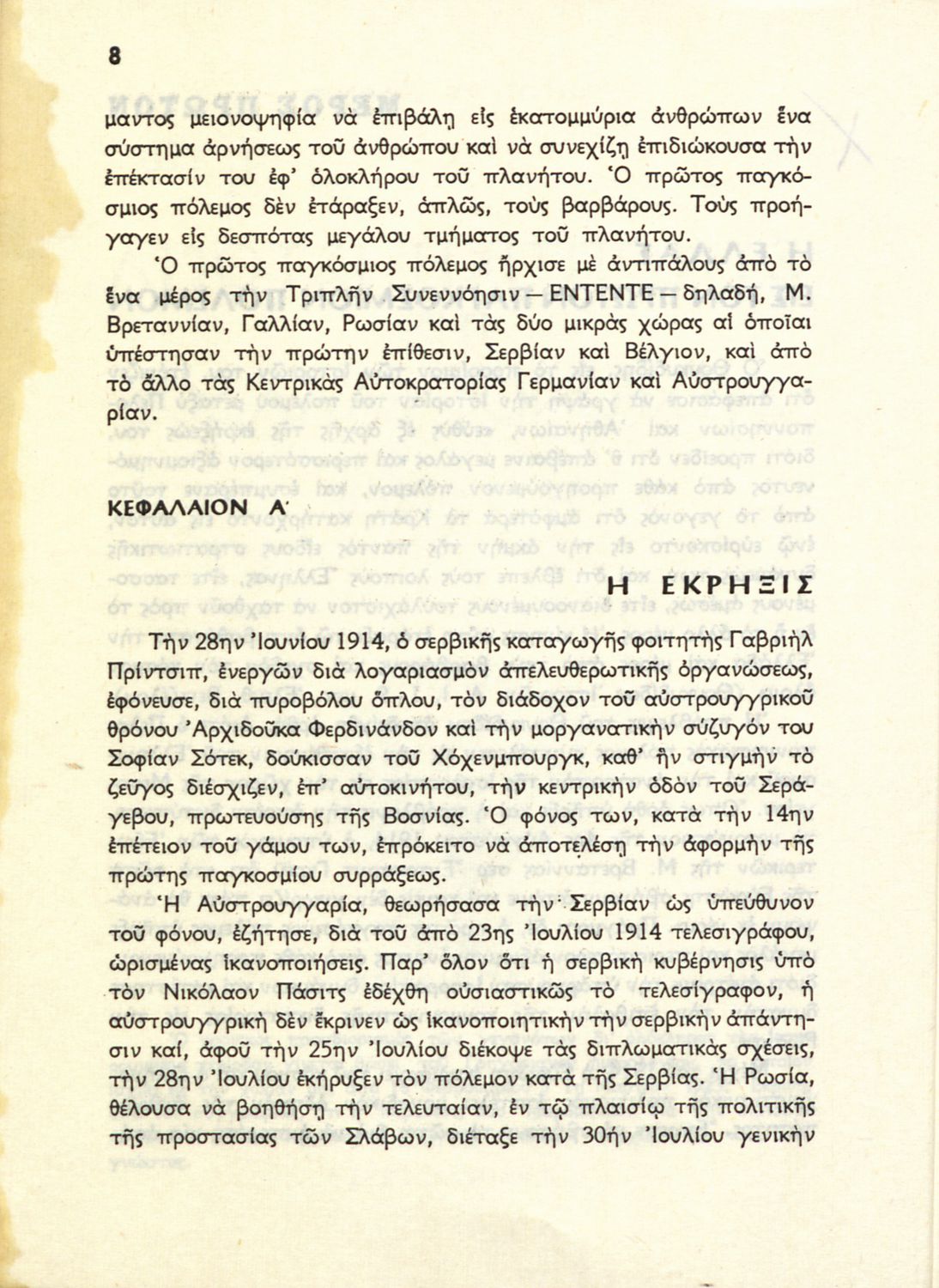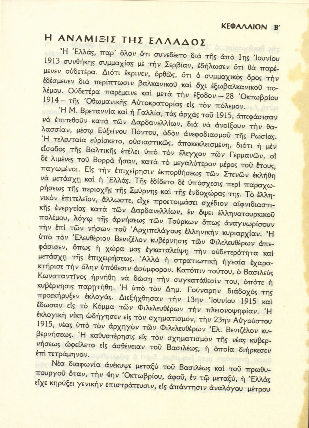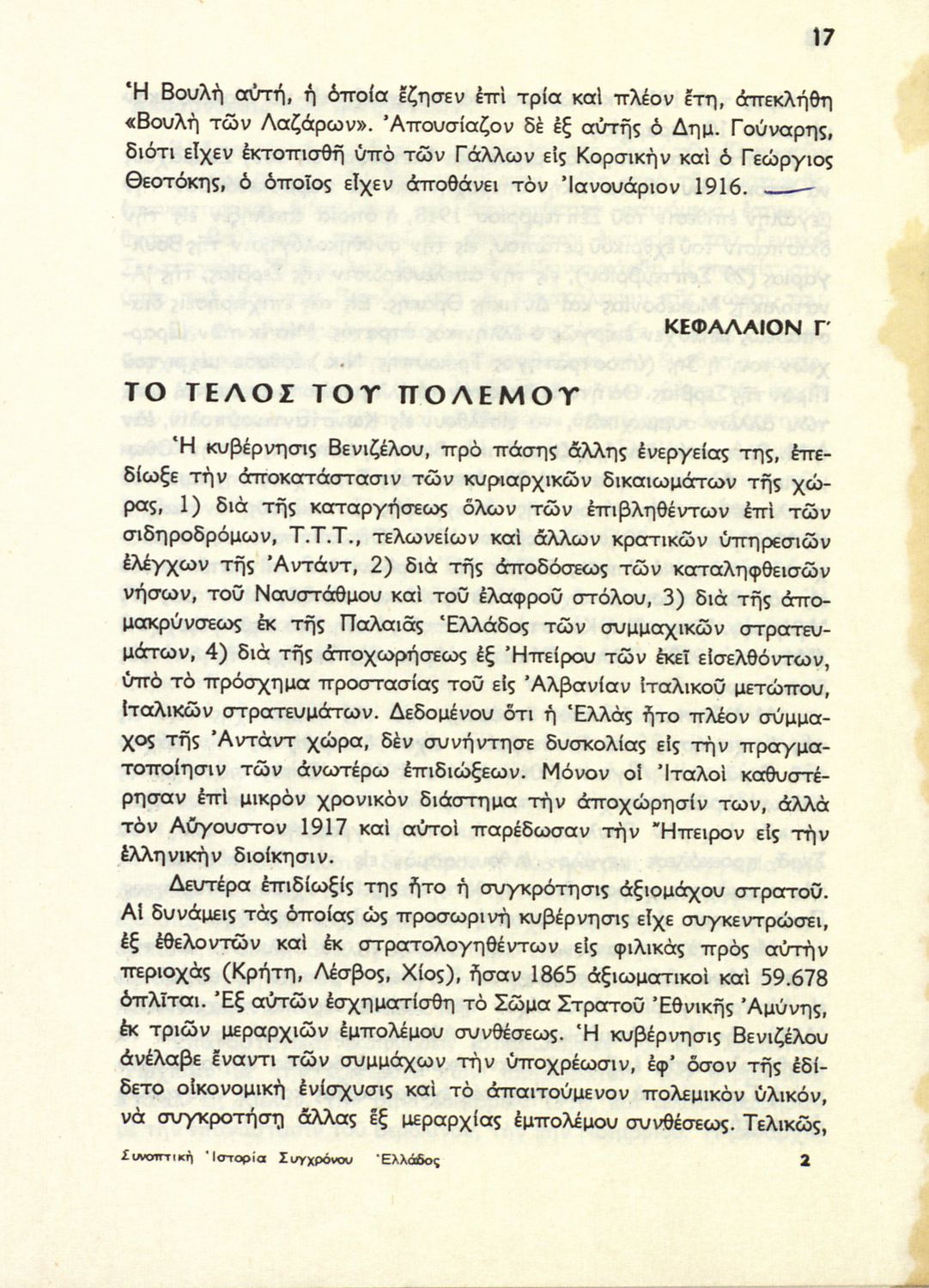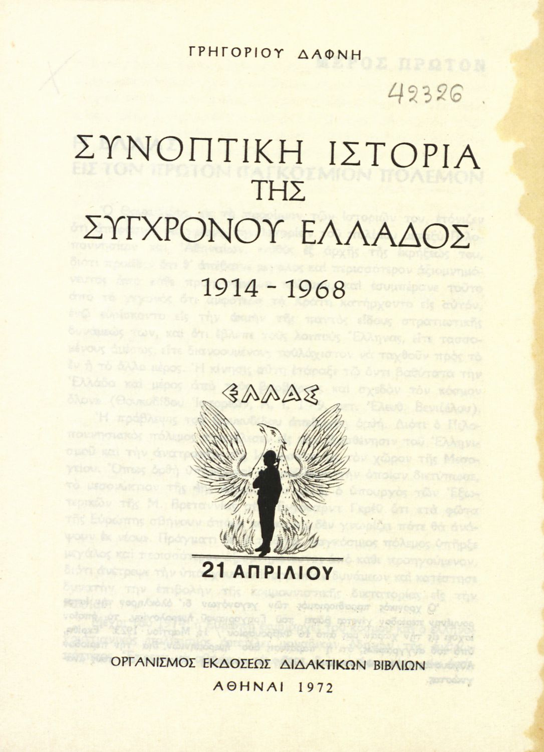 Βαθμίδα εκπαίδευσης: Δευτεροβάθμια Μάθημα: Ιστορία Γλώσσα: Απλή καθαρεύουσα Παρουσίαση περιεχομένου: Σχολικό εγχειρίδιο για το μάθημα της Ιστορίας στην Δευτεροβάθμια Εκπαίδευση. Αναφέρεται στη συμμετοχή της Ελλάδας στον Α΄ Παγκόσμιο πόλεμο. Συνεχίζει με την παρουσίαση της κοινωνικής, οικονομικής και πολιτικής κατάσταση της Ελλάδας την περίοδο του Μεσοπολέμου, συνεχίζει με το Β΄ Παγκόσμιο Πόλεμο και παρουσιάζει τις εξελίξεις στον ελλαδικό χώρο κατά την περίοδο του Ψυχρού Πολέμου. |