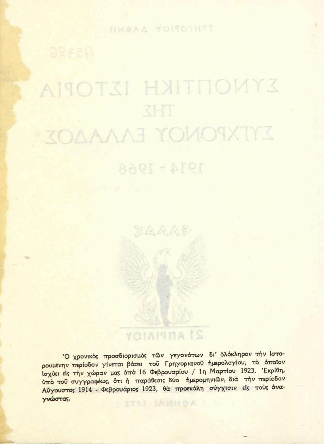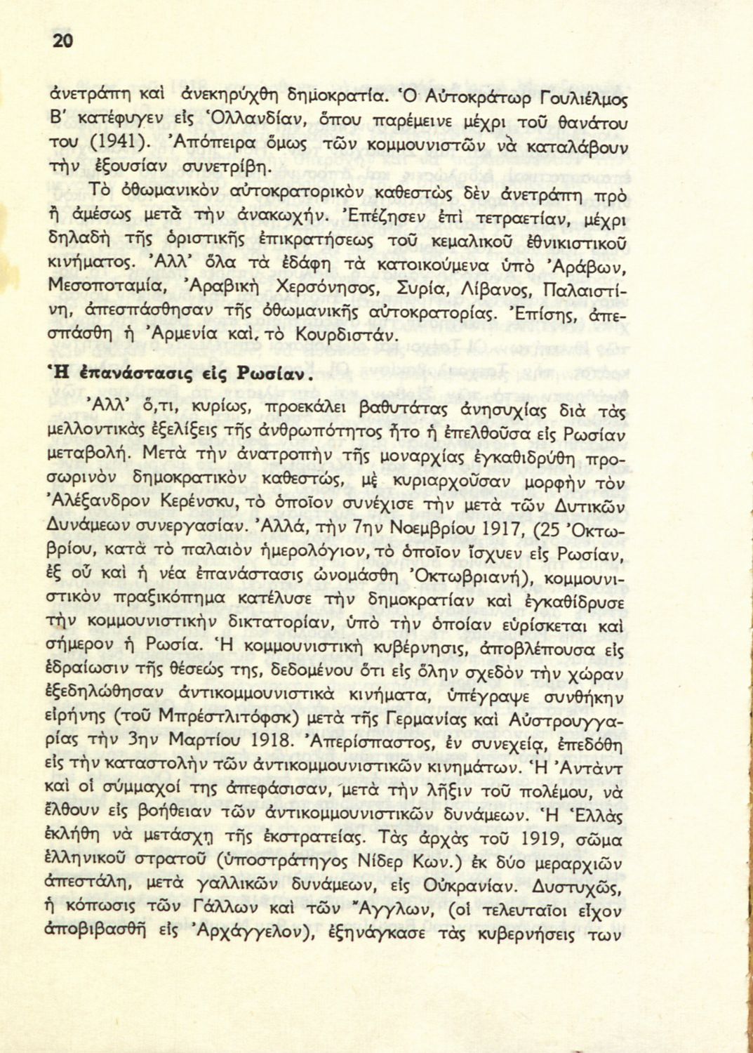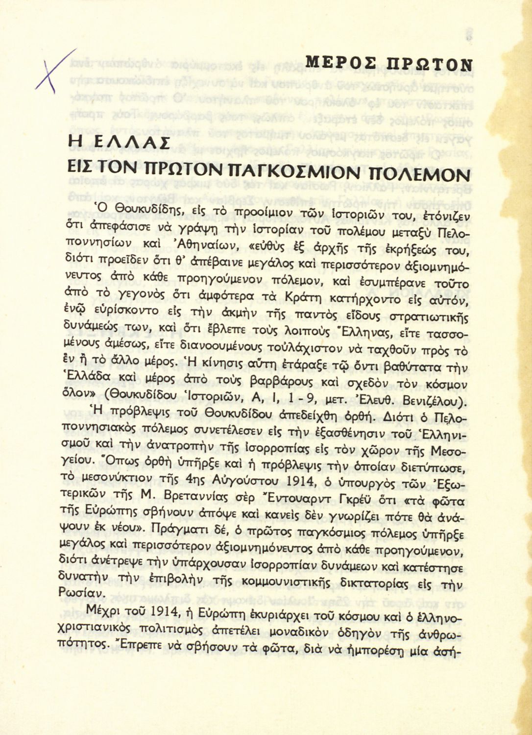 Βαθμίδα εκπαίδευσης: Δευτεροβάθμια Μάθημα: Ιστορία Γλώσσα: Απλή καθαρεύουσα Παρουσίαση περιεχομένου: Σχολικό εγχειρίδιο για το μάθημα της Ιστορίας στην Δευτεροβάθμια Εκπαίδευση. Αναφέρεται στη συμμετοχή της Ελλάδας στον Α΄ Παγκόσμιο πόλεμο. Συνεχίζει με την παρουσίαση της κοινωνικής, οικονομικής και πολιτικής κατάσταση της Ελλάδας την περίοδο του Μεσοπολέμου, συνεχίζει με το Β΄ Παγκόσμιο Πόλεμο και παρουσιάζει τις εξελίξεις στον ελλαδικό χώρο κατά την περίοδο του Ψυχρού Πολέμου. |