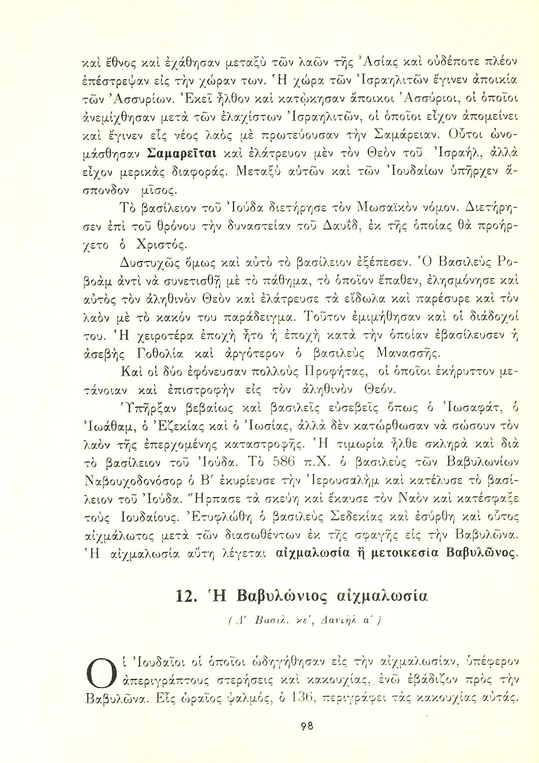Κωδικός αναγνώρισης: 01-42329 Τίτλος: Ιερά Ιστορία της Παλαιάς Διαθήκης, Α΄ Γυμνασίου Συγγραφέας: Κων. Π. Παπαπαναγιώτου, Ιωάννης Γρ. Τιμαγένης Μέγεθος και υπόστρωμα: Σχολικό εγχειρίδιο, 20εκ., μαλακό εξώφυλλο, 158 σελίδες. Εικόνες (ασπρόμαυρες), χάρτες (έγχρωμοι). |