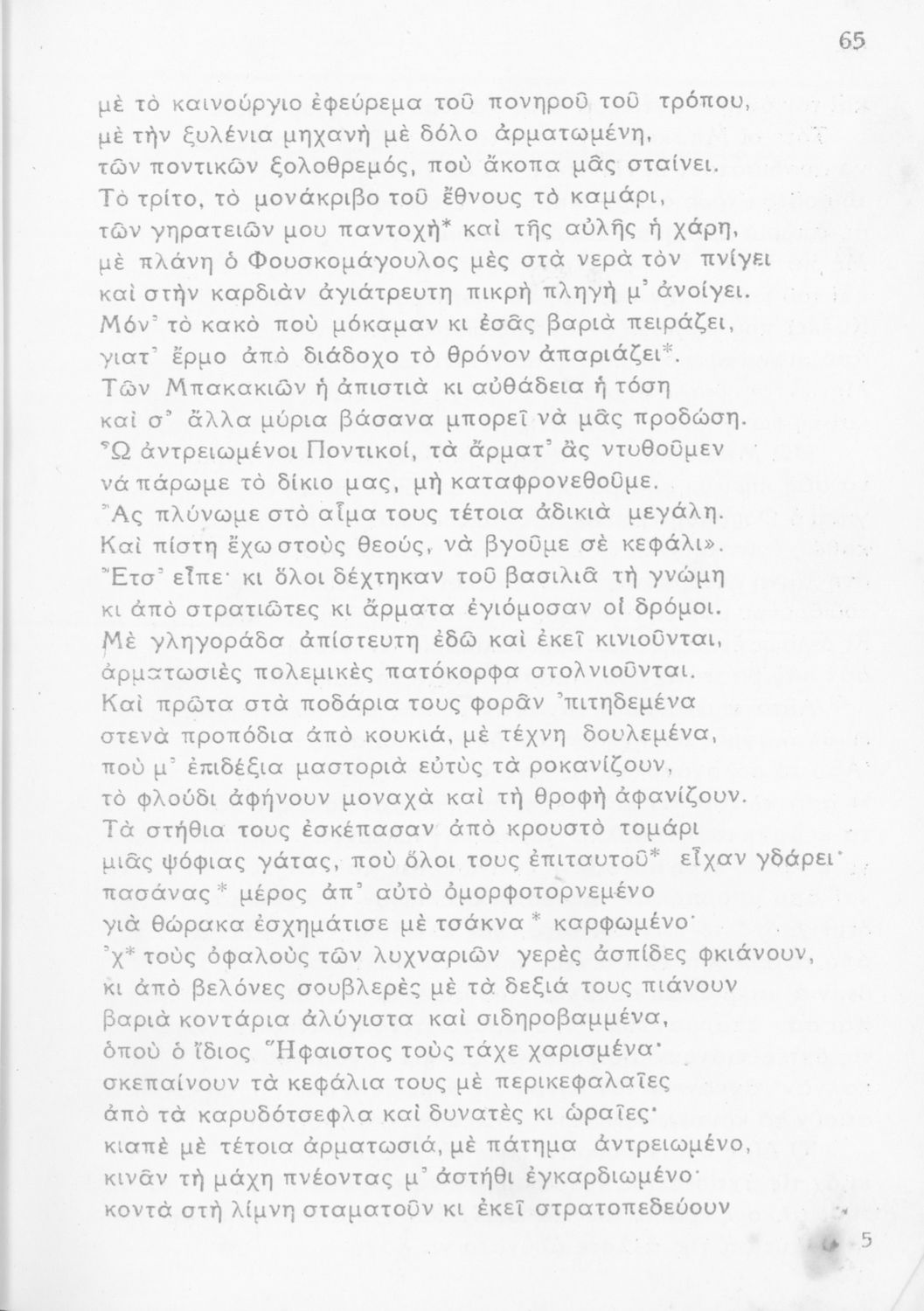 Βαθμίδα εκπαίδευσης: Δευτεροβάθμια Τάξη: Ε' Γυμνασίου παλαιού τύπου Μάθημα: Νέα Ελληνικά Γλώσσα: Καθαρεύουσα / Δημοτική Παρουσίαση περιεχομένου: Σχολικό εγχειρίδιο Νέων Ελληνικών Ε΄ Γυμνασίου που περιέχει πεζά και ποιήματα Ελλήνων συγγραφέων εμπνευσμένα από την καθημερινή ζωή και την σύγχρονη ελληνική ιστορία. Περιέχει και κλασσικά κείμενα ξένων λογοτεχνών, παράρτημα με βιογραφίες των συγγραφέων και λεξιλόγιο. |