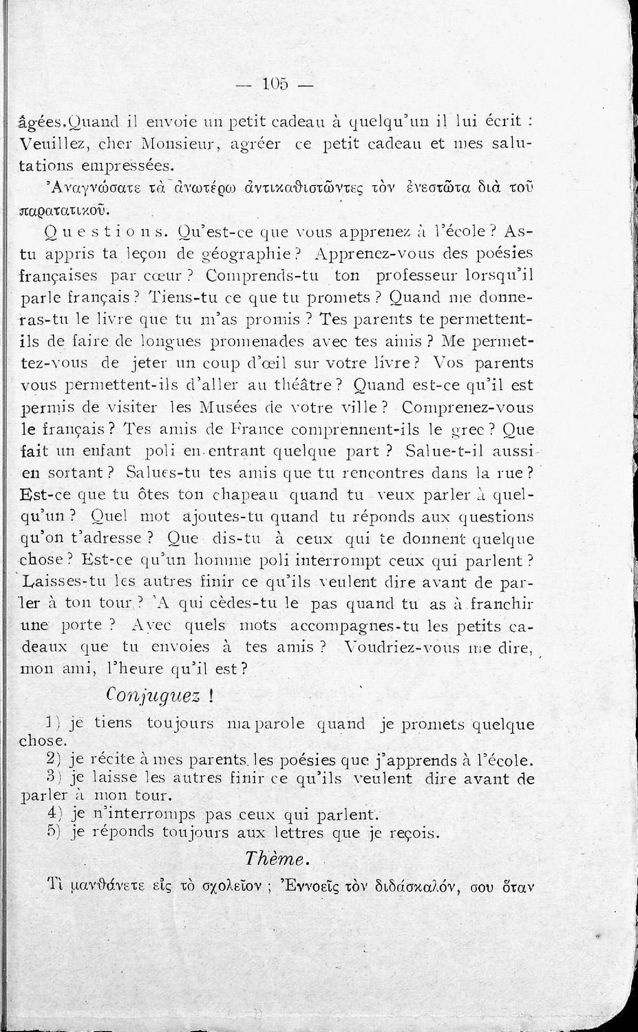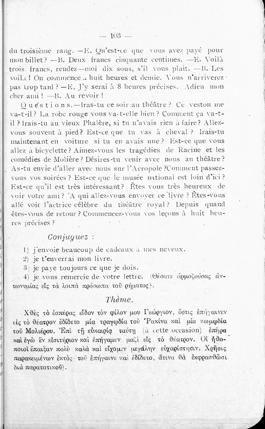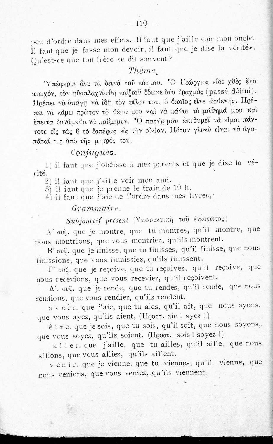 Σχολικό εγχειρίδιο Γαλλικών Β΄ και Γ' Ελληνικού Σχολείου, Αστικού Σχολείου και Παρθεναγωγείου που περιλαμβάνει κείμενα, κανόνες γραμματικής και συντακτικού, ερωτήσεις και ασκήσεις κατανόησης, και λεξιλογικά ...