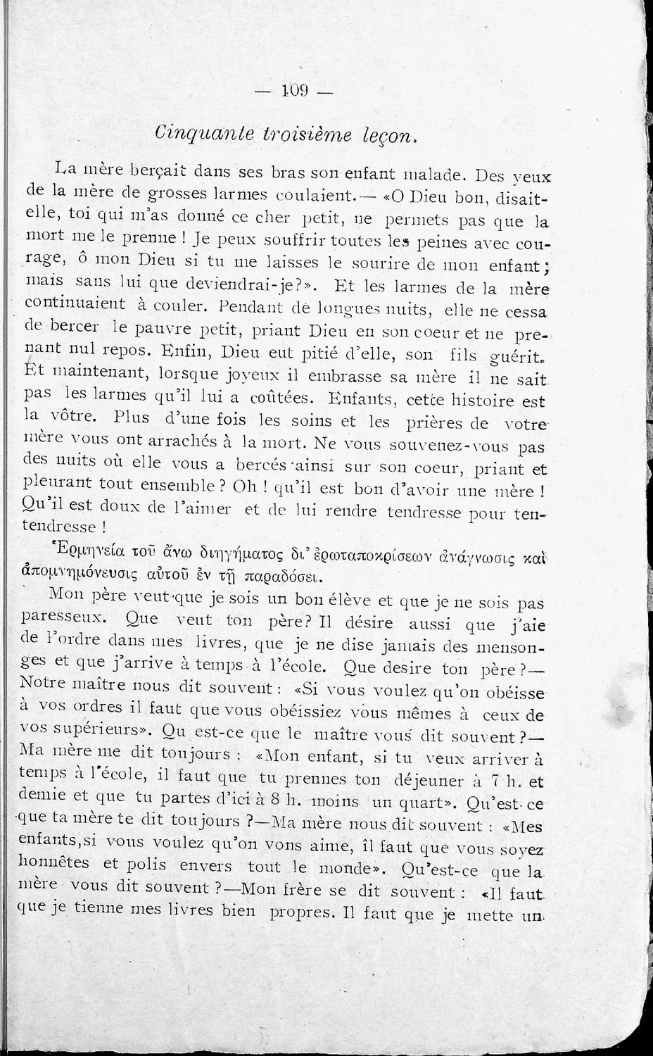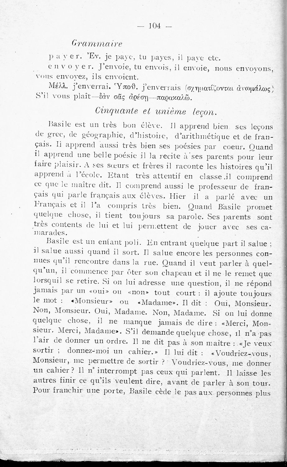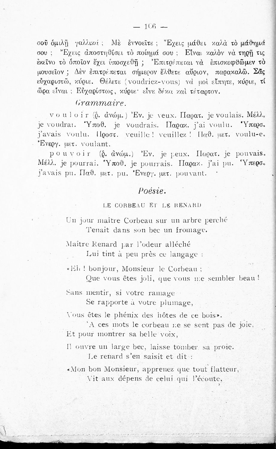 Σχολικό εγχειρίδιο Γαλλικών για τις Β΄ και Γ' Ελληνικού Σχολείου, Αστικού Σχολείου και Παρθεναγωγείου που περιλαμβάνει κείμενα, κανόνες γραμματικής και συντακτικού, και λεξιλογικά και πραγματολογικά σχόλια.