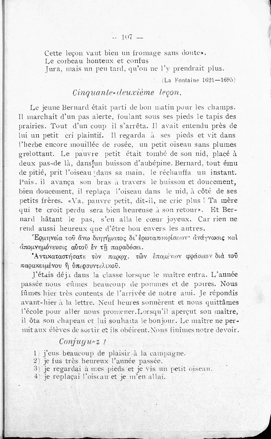 Σχολικό εγχειρίδιο Γαλλικών που περιλαμβάνει 54 κείμενα για τη διδασκαλία των γραμματικών και συντακτικών φαινομένων και της ορθογραφίας, λεξιλόγιο και παράρτημα με τους κανόνες συλλαβισμού.