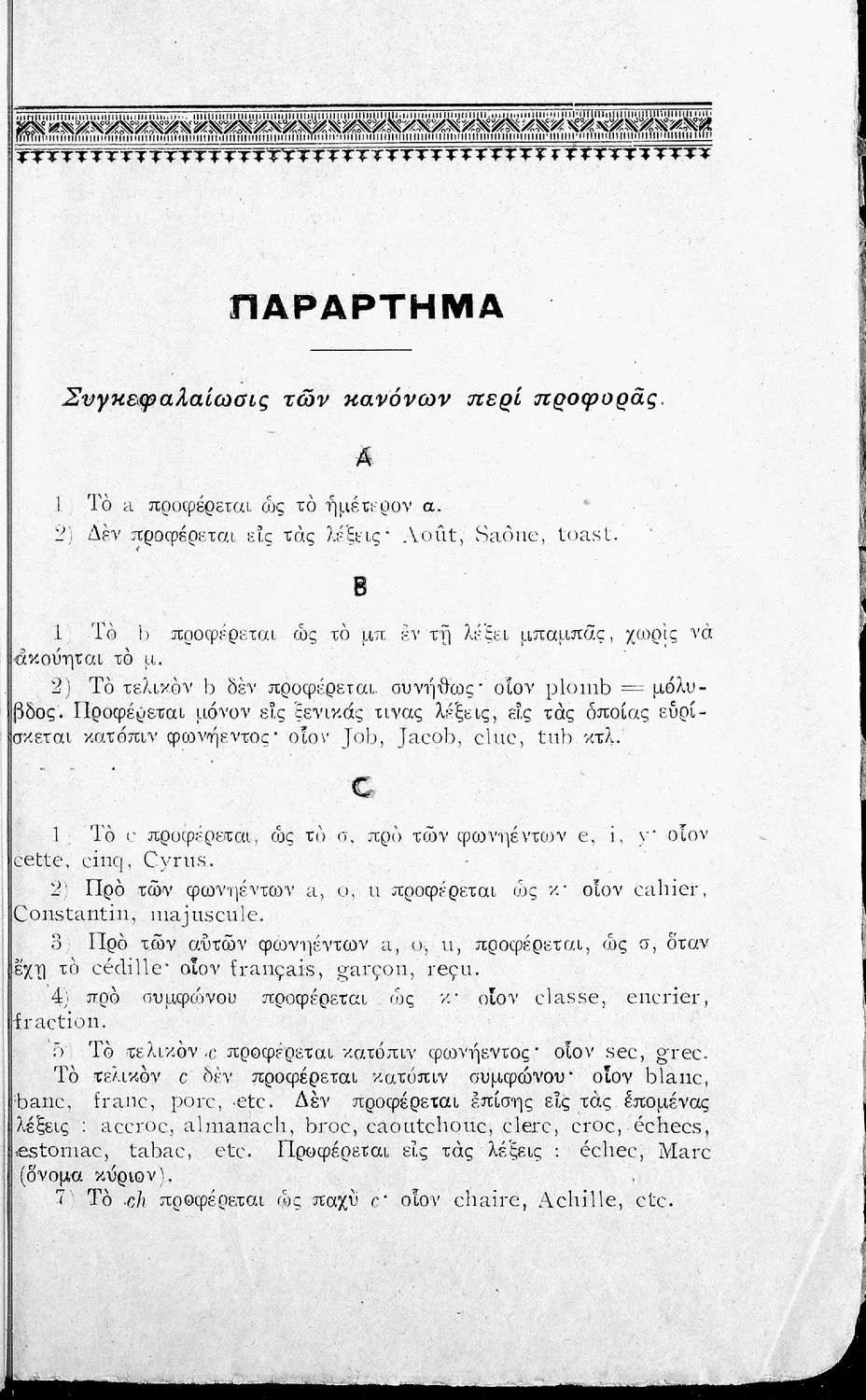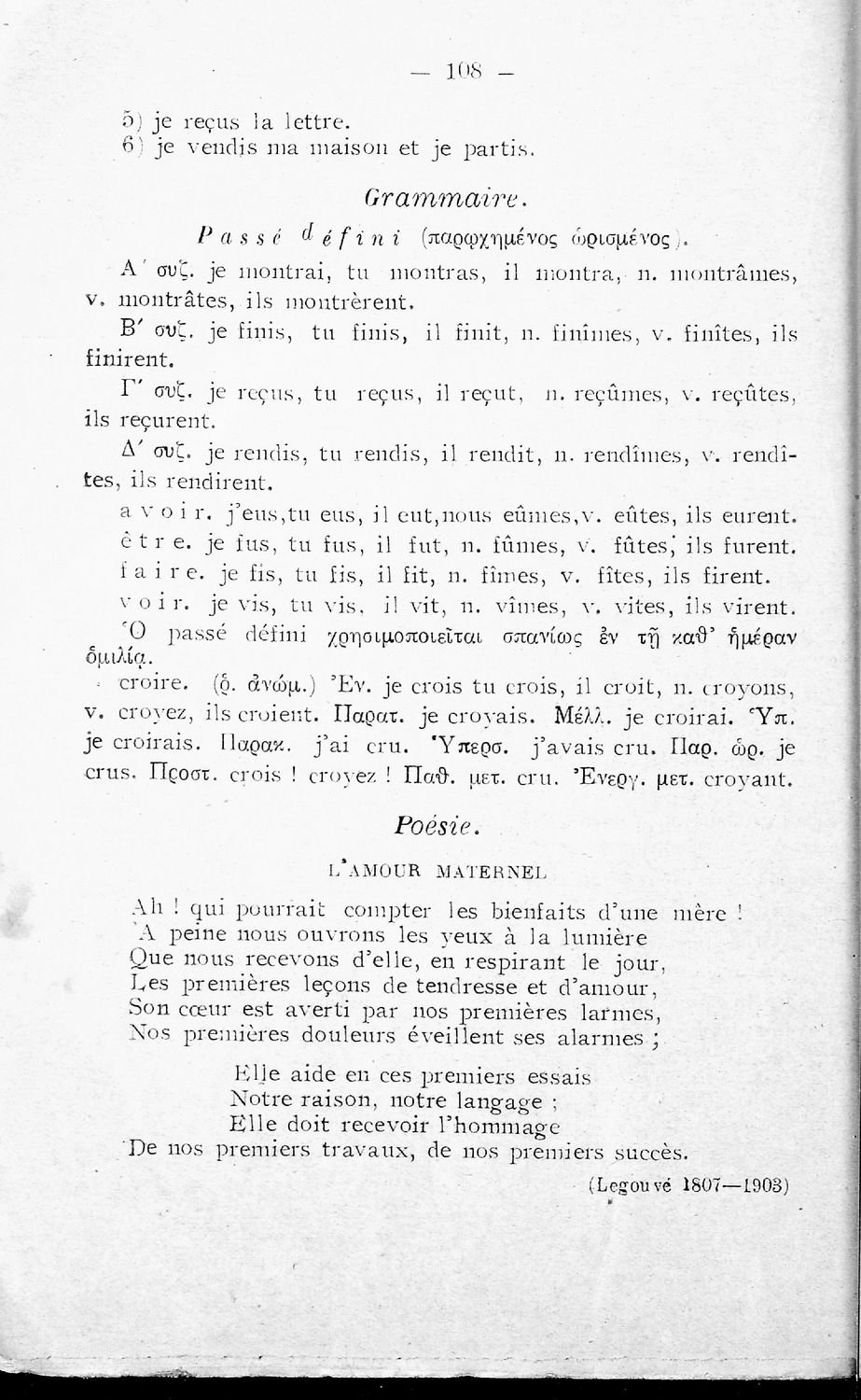 Γραμματική της Γαλλικής γλώσσας για τα Τετρατάξια Γυμνάσια, τη Γ΄ τάξη των Αστικών Σχολείων Θηλέων και τα Διδασκαλεία της Δημοτικής Εκπαίδευσης που περιλαμβάνει θεωρία, ασκήσεις και λεξιλόγιο.