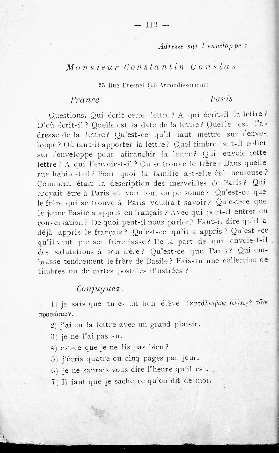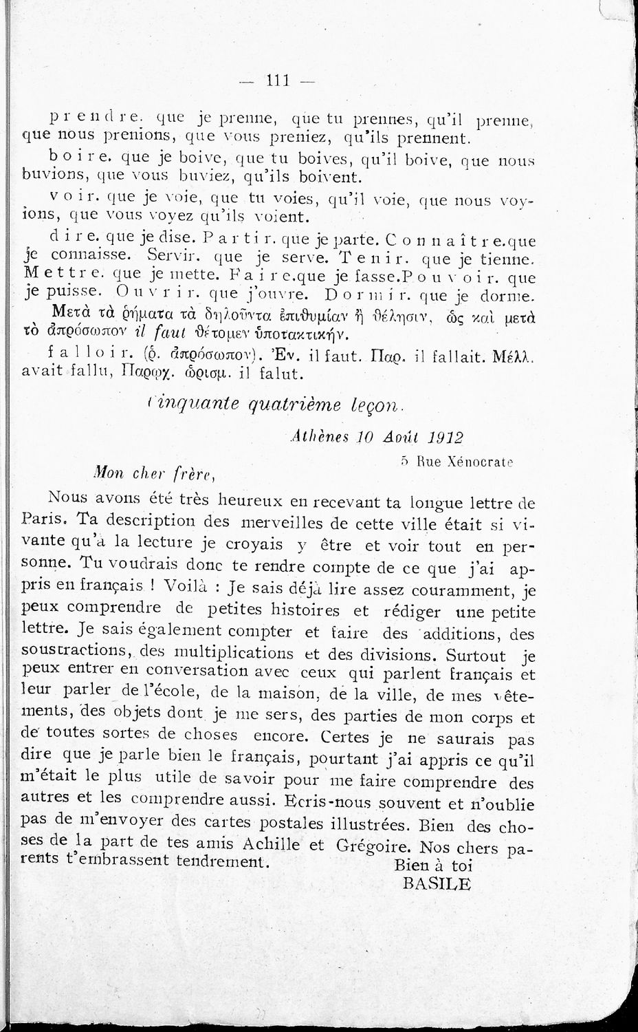 Παρουσίαση περιεχομένου: Σχολικό εγχειρίδιο Γαλλικών για τη Β΄ και Γ΄ των Ελληνικών Σχολείων, τα αστικά σχολεία και παρθεναγωγεία που περιλαμβάνει κείμενα, θεωρία, λεξιλόγιο, ασκήσεις και υποδείγματα επιστολών. Ο συγγραφέας ήταν καθηγητής της Δημόσιας Εμπορικής Σχολής Αθηνών.