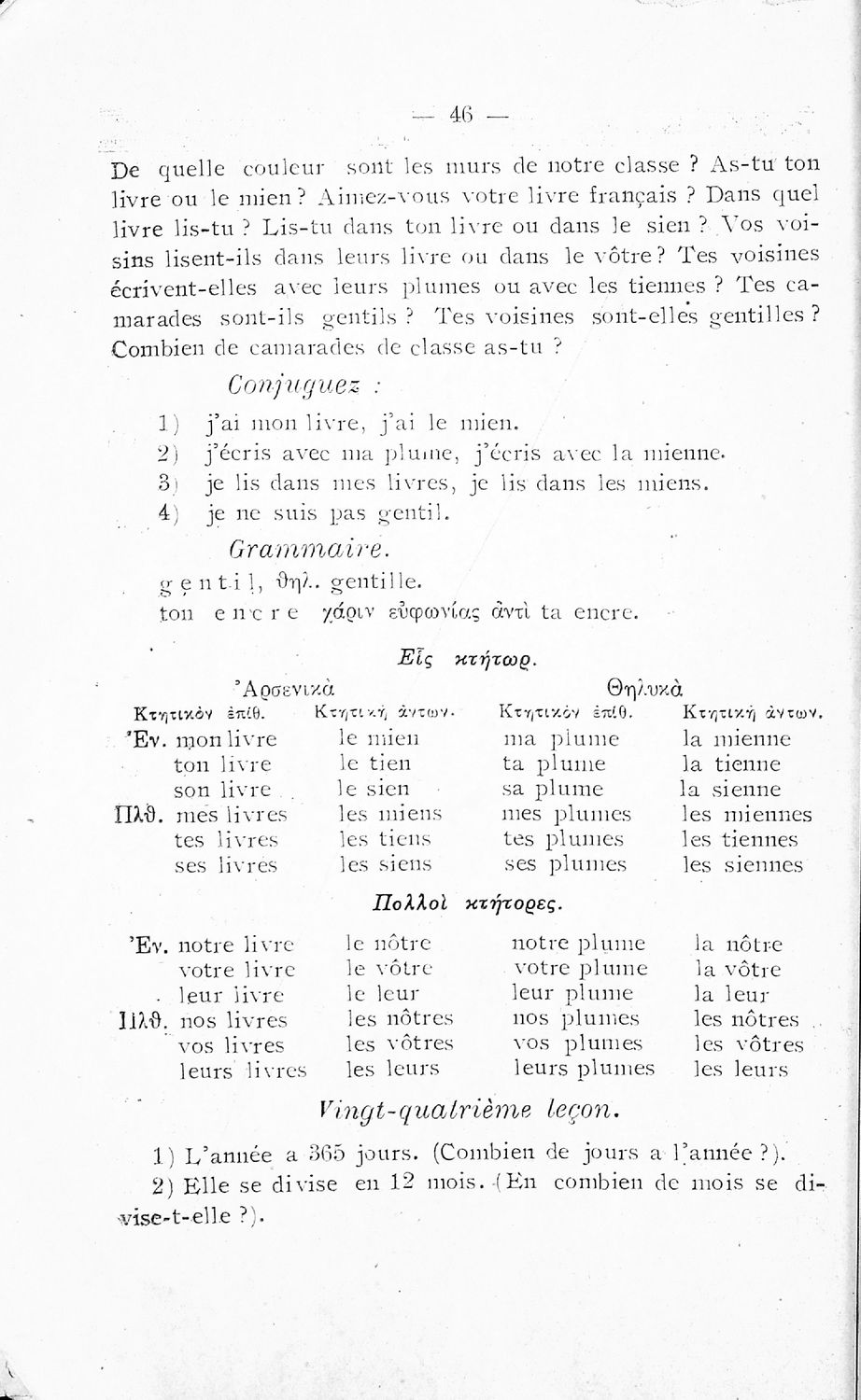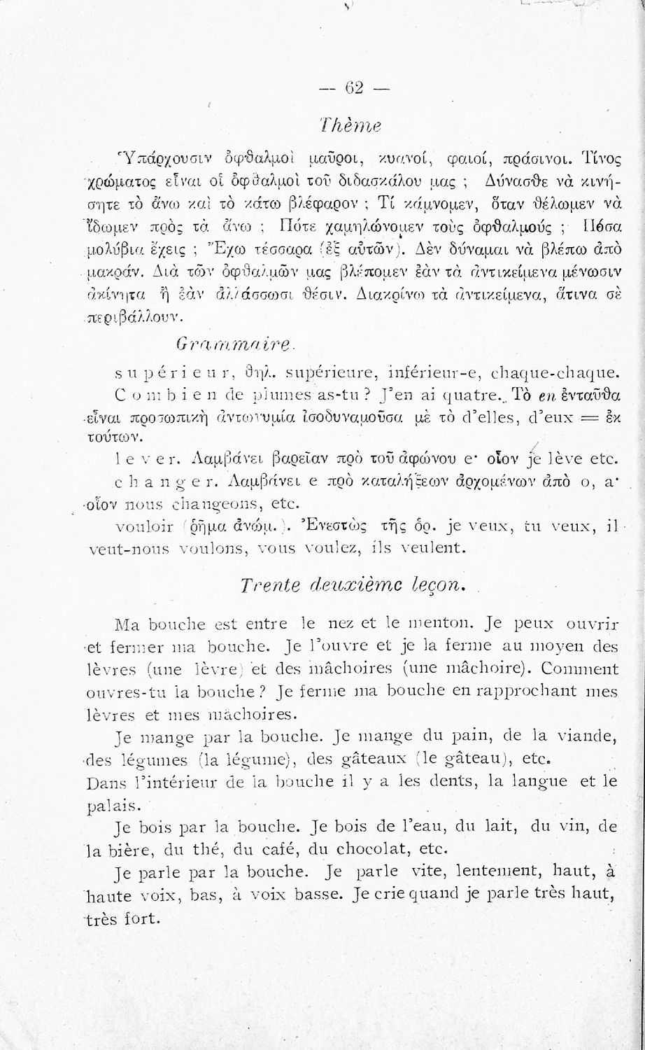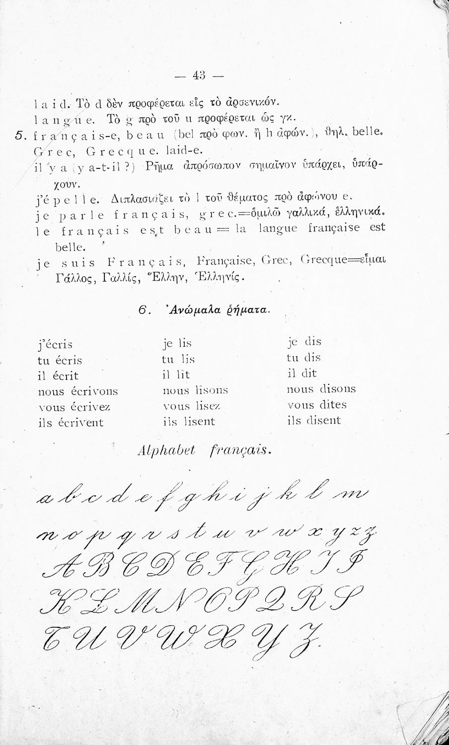 Γραμματική της Γαλλικής γλώσσας για τα Τετρατάξια Γυμνάσια, τη Γ΄ τάξη των Αστικών Σχολείων Θηλέων και τα Διδασκαλεία της Δημοτικής Εκπαίδευσης που περιλαμβάνει θεωρία, ασκήσεις και λεξιλόγιο.