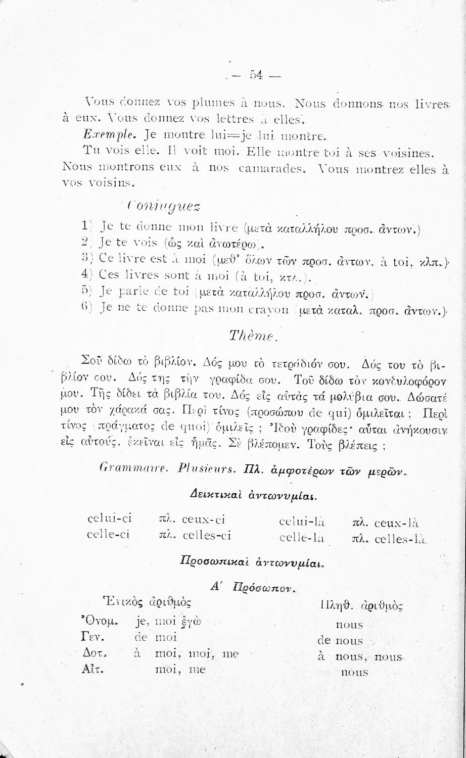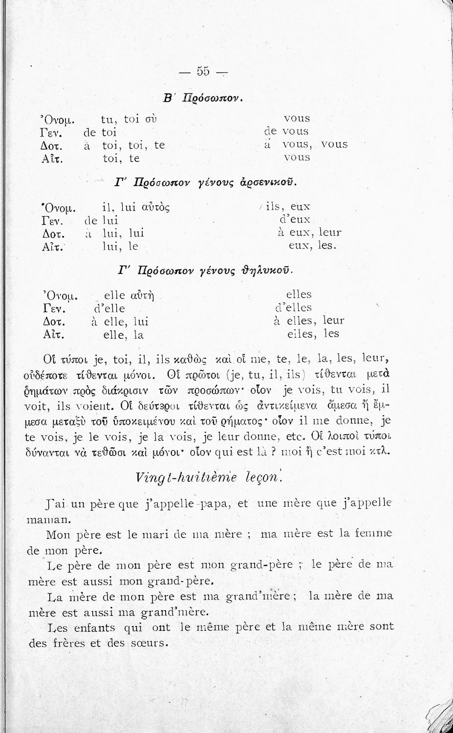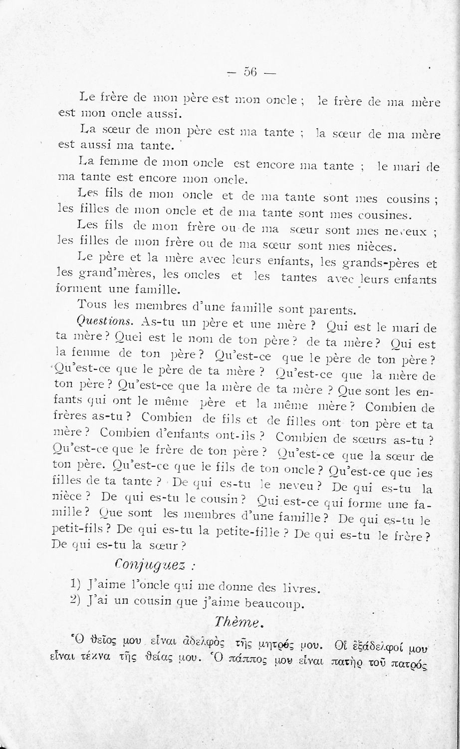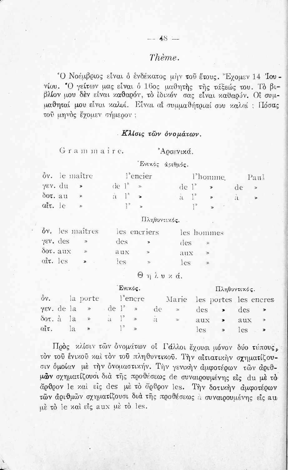 Γραμματική της Γαλλικής γλώσσας για τα Τετρατάξια Γυμνάσια, τη Γ΄ τάξη των Αστικών Σχολείων Θηλέων και τα Διδασκαλεία της Δημοτικής Εκπαίδευσης που περιλαμβάνει θεωρία, ασκήσεις και λεξιλόγιο.