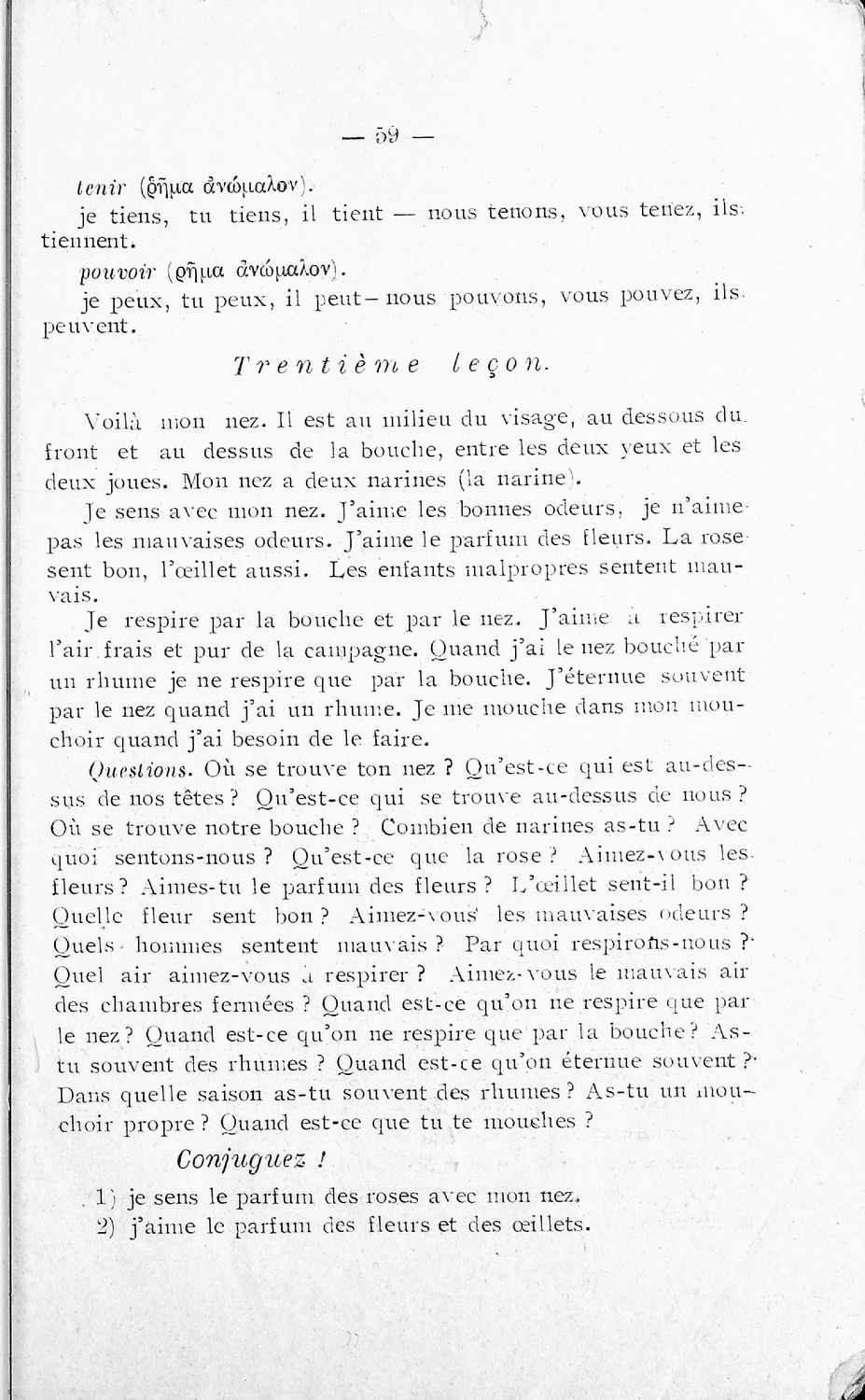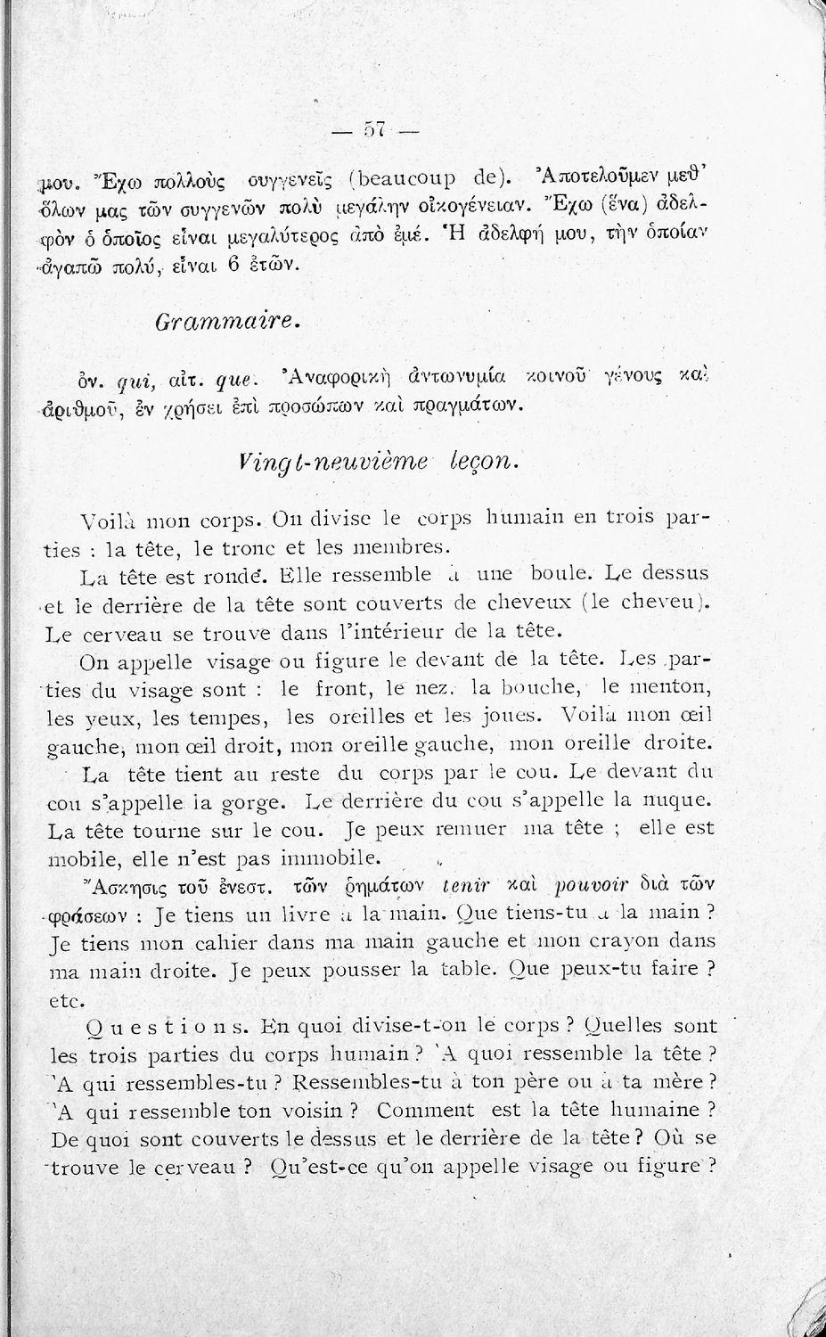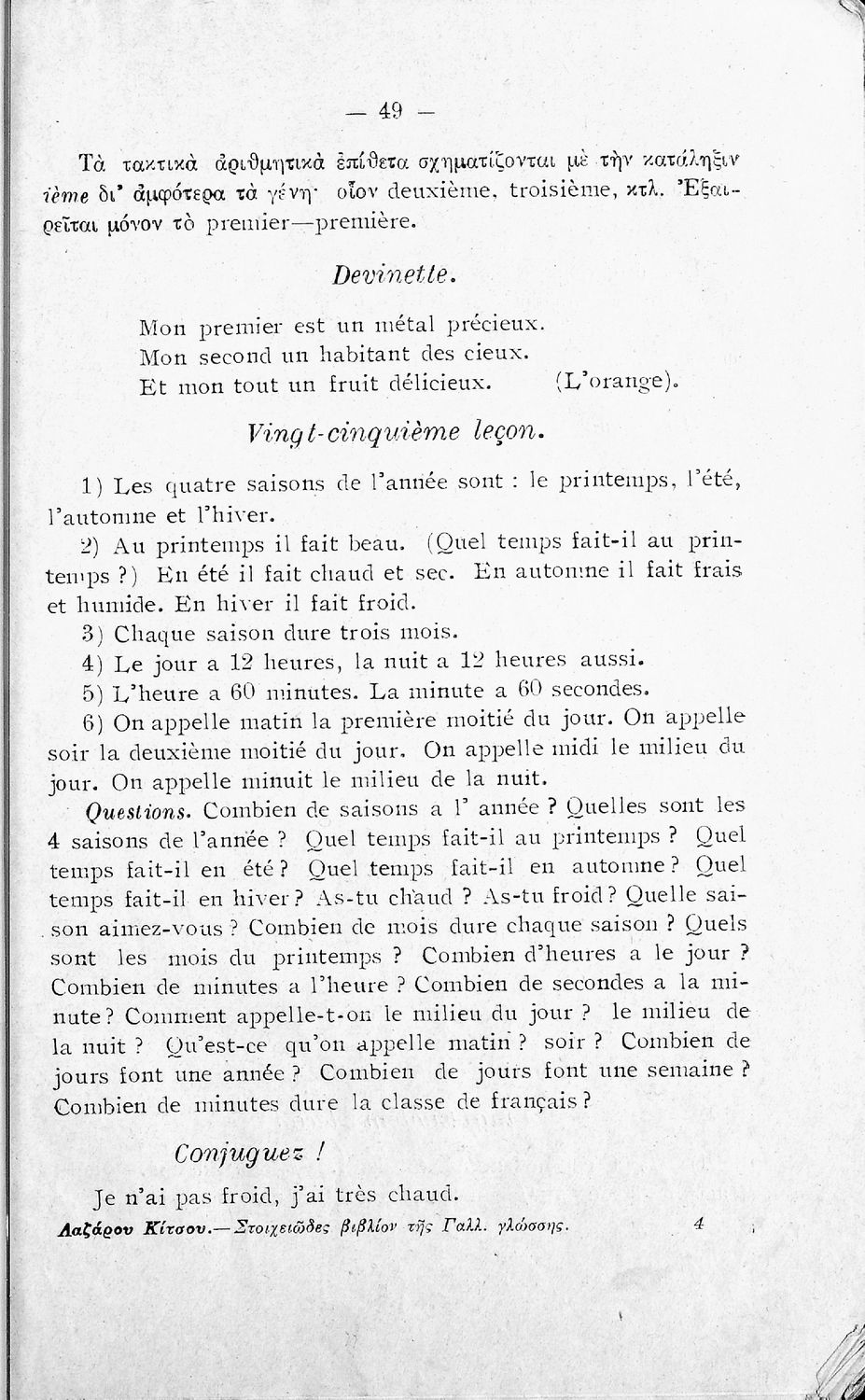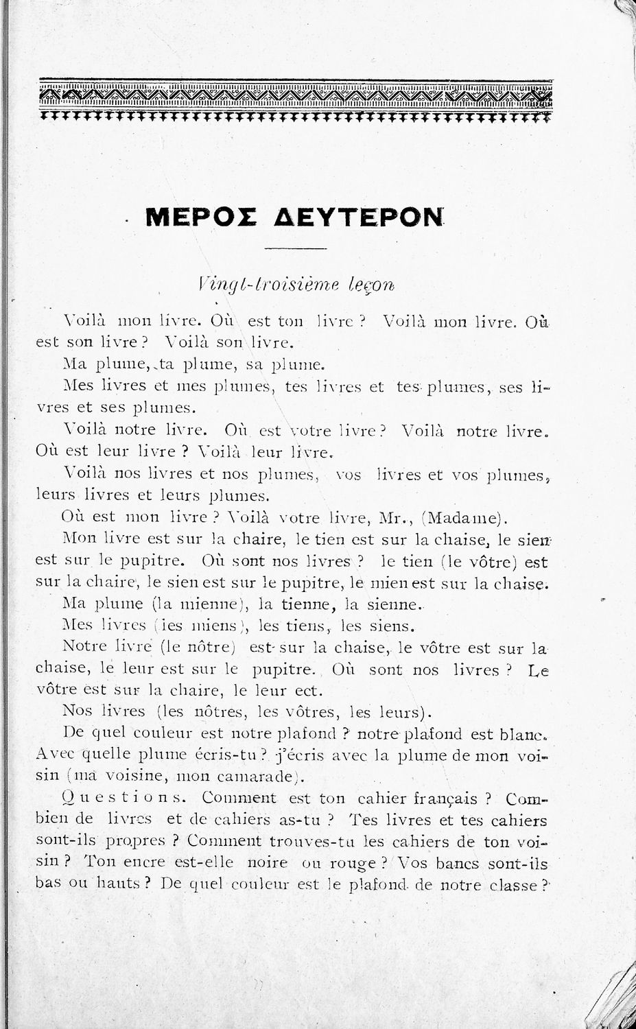 Σχολικό εγχειρίδιο Γαλλικών για τις Β΄ και Γ' Ελληνικού Σχολείου, Αστικού Σχολείου και Παρθεναγωγείου που περιλαμβάνει κείμενα, κανόνες γραμματικής και συντακτικού, και λεξιλογικά και πραγματολογικά σχόλια.