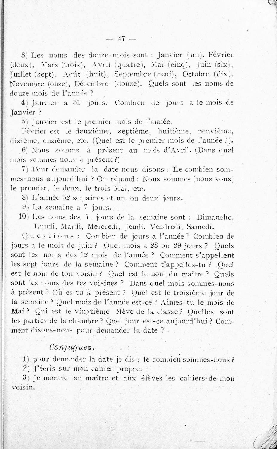 Σχολικό εγχειρίδιο Γαλλικών που περιλαμβάνει 54 κείμενα για τη διδασκαλία των γραμματικών και συντακτικών φαινομένων και της ορθογραφίας, λεξιλόγιο και παράρτημα με τους κανόνες συλλαβισμού.