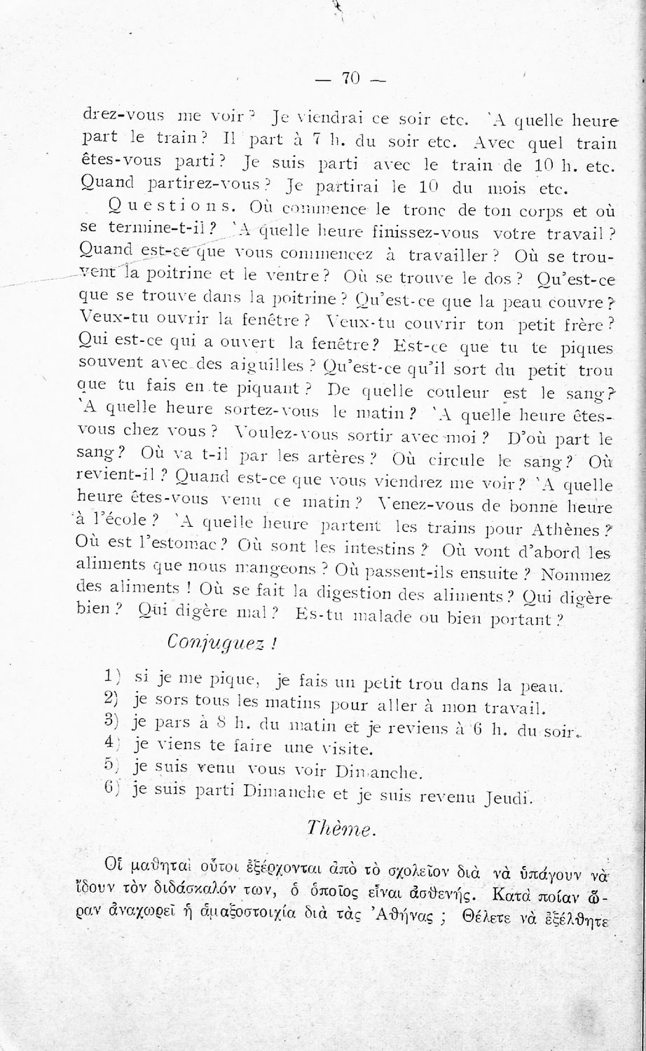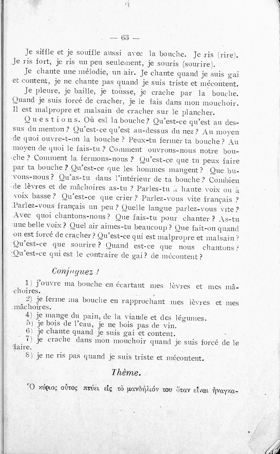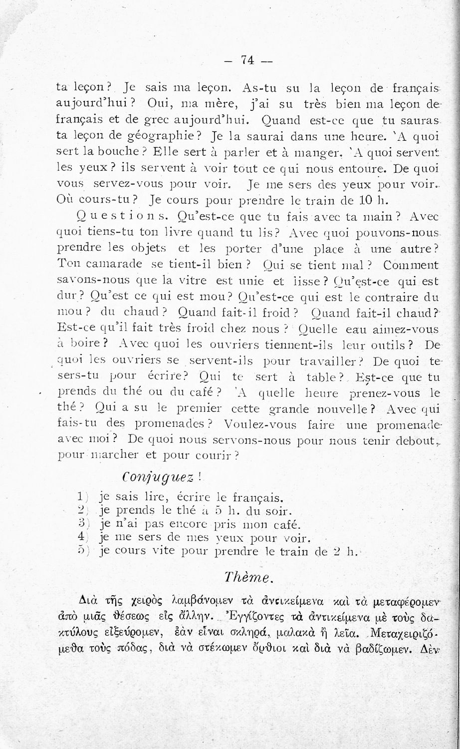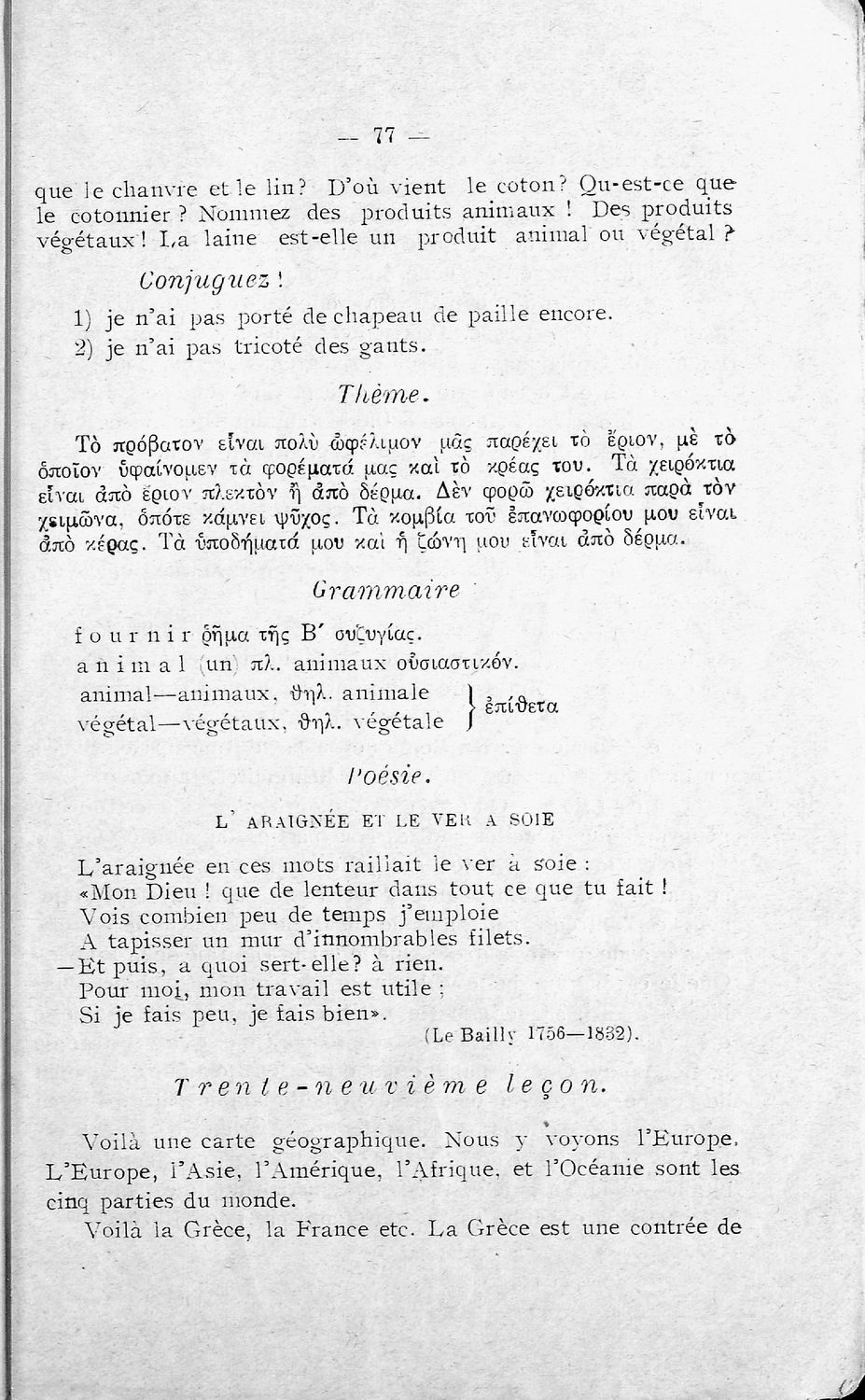 Σχολικό εγχειρίδιο Γαλλικών Β΄ και Γ' Ελληνικού Σχολείου, Αστικού Σχολείου και Παρθεναγωγείου που περιλαμβάνει κείμενα, κανόνες γραμματικής και συντακτικού, ερωτήσεις και ασκήσεις κατανόησης, και λεξιλογικά ...