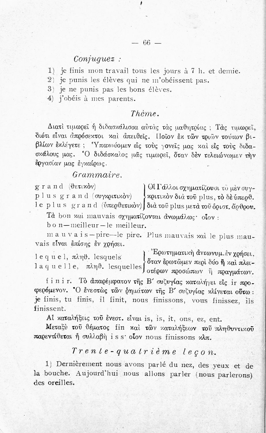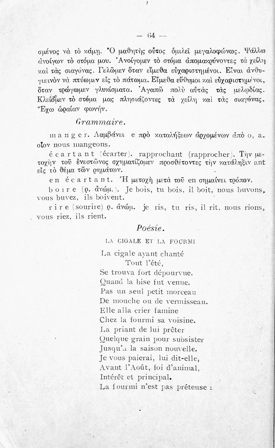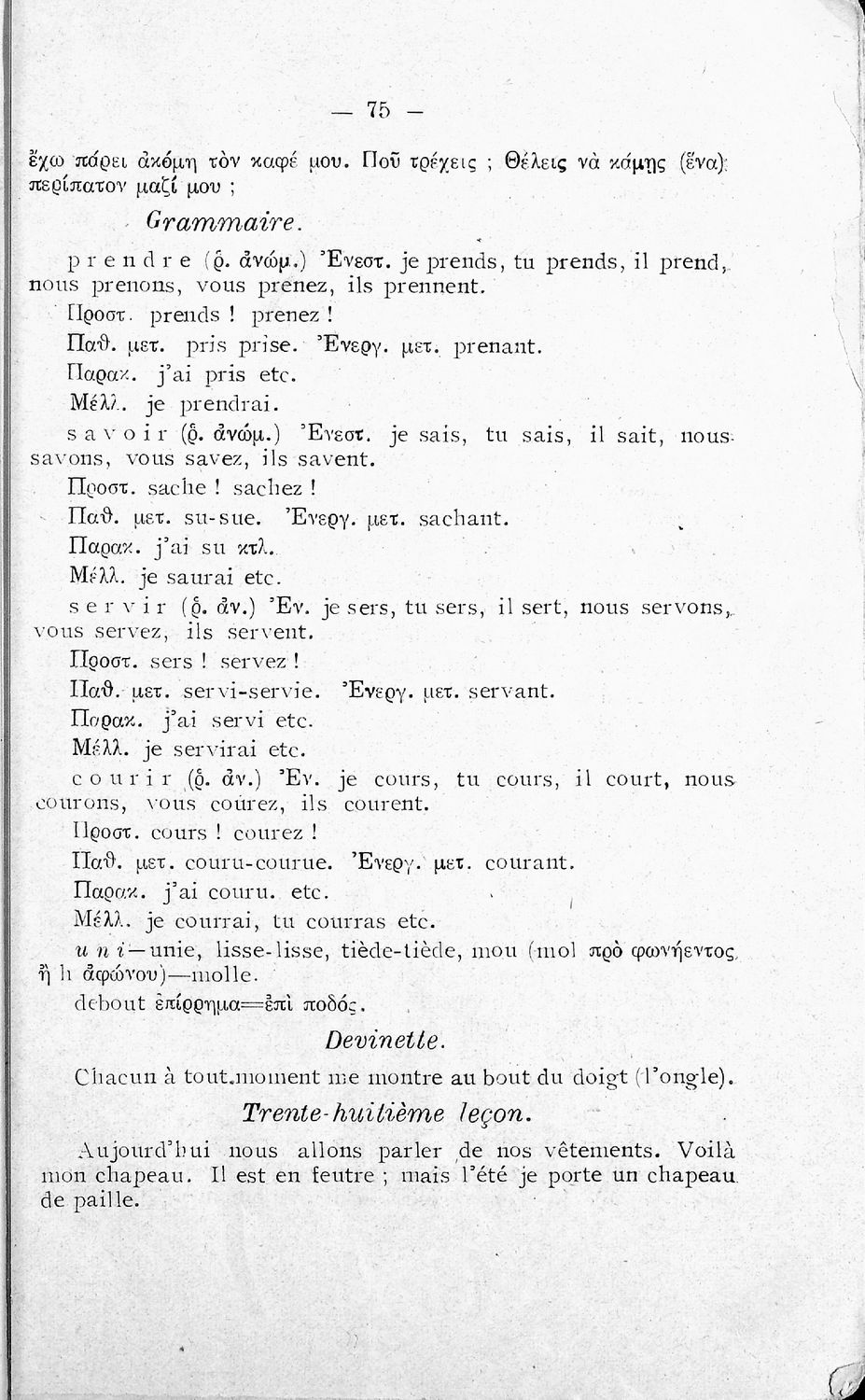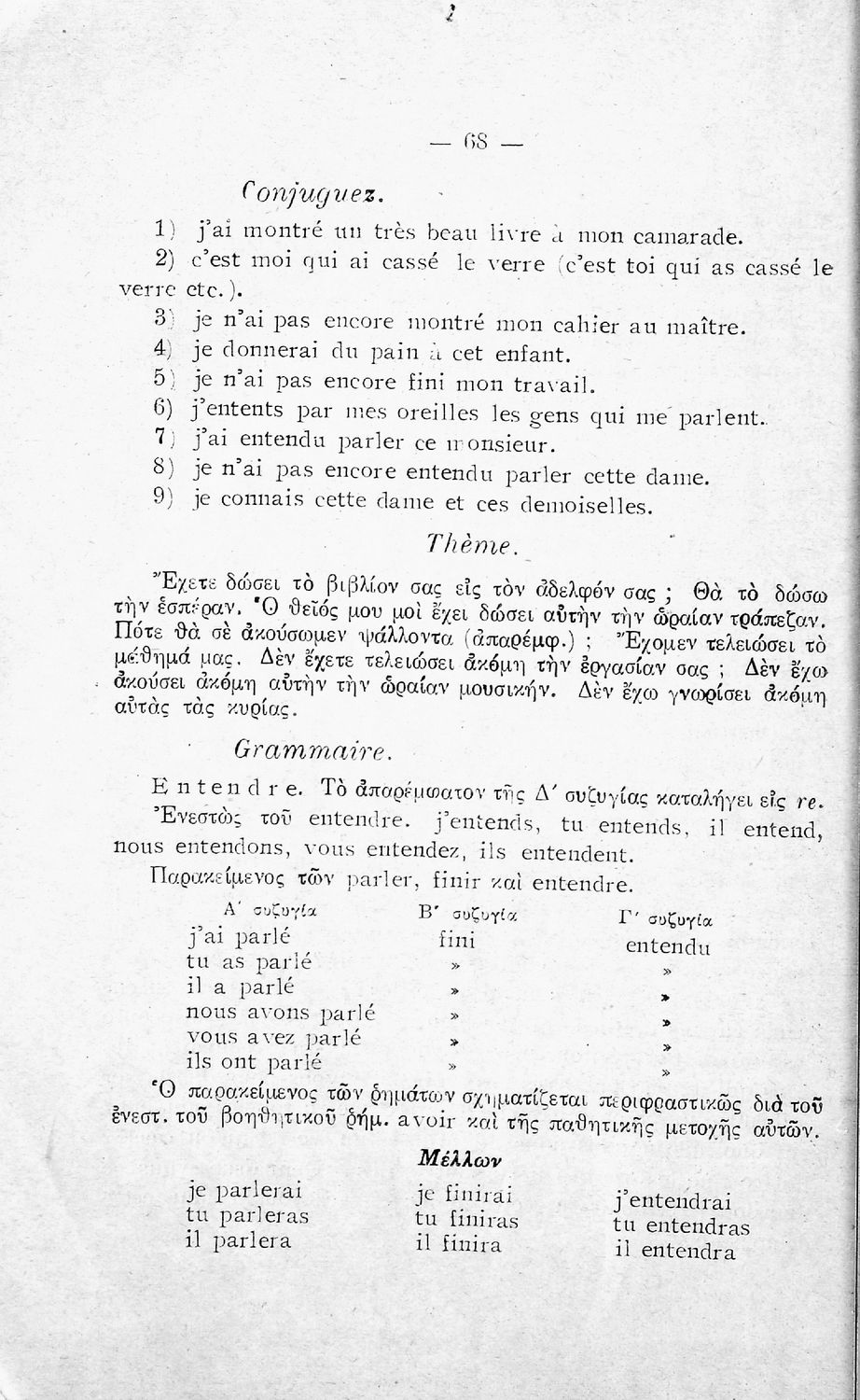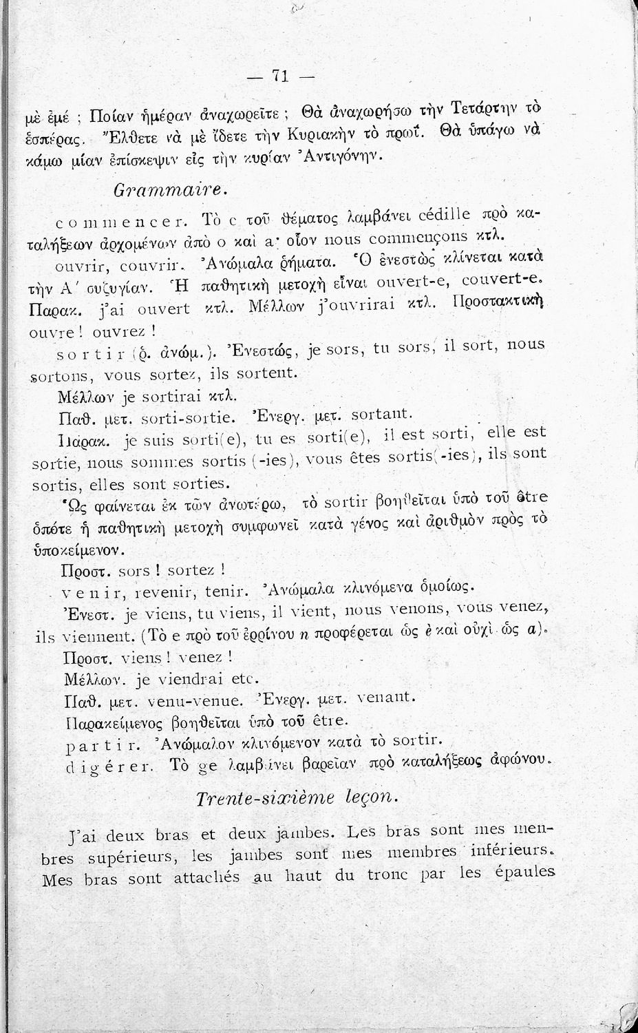 Γραμματική της Γαλλικής γλώσσας για τα Τετρατάξια Γυμνάσια, τη Γ΄ τάξη των Αστικών Σχολείων Θηλέων και τα Διδασκαλεία της Δημοτικής Εκπαίδευσης που περιλαμβάνει θεωρία, ασκήσεις και λεξιλόγιο.