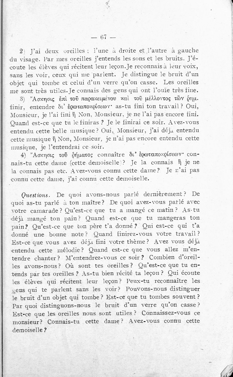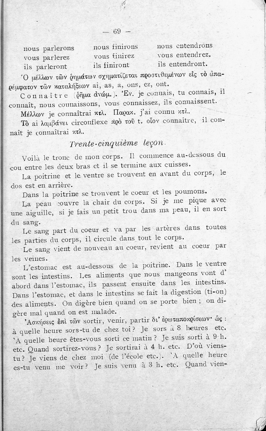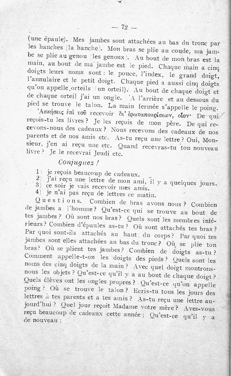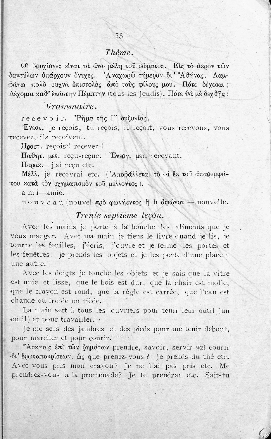 Σχολικό εγχειρίδιο Γαλλικών για τις Β΄ και Γ' Ελληνικού Σχολείου, Αστικού Σχολείου και Παρθεναγωγείου που περιλαμβάνει κείμενα, κανόνες γραμματικής και συντακτικού, και λεξιλογικά και πραγματολογικά σχόλια.