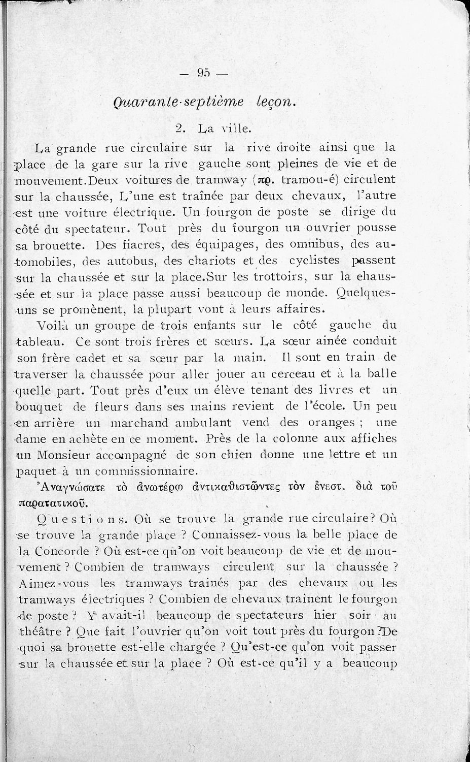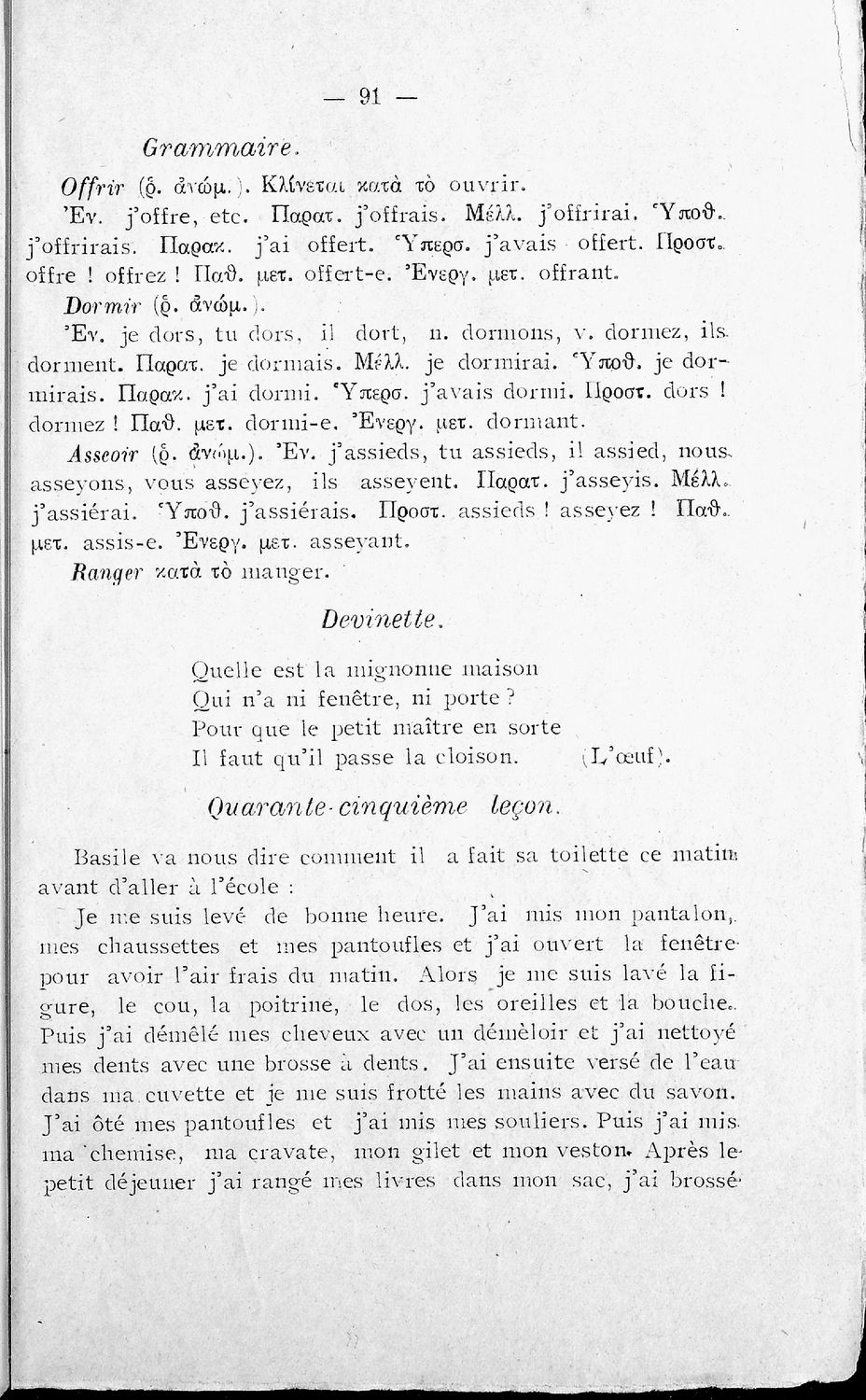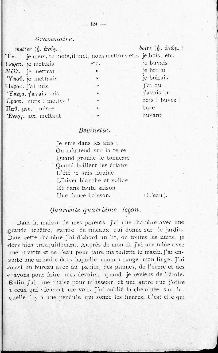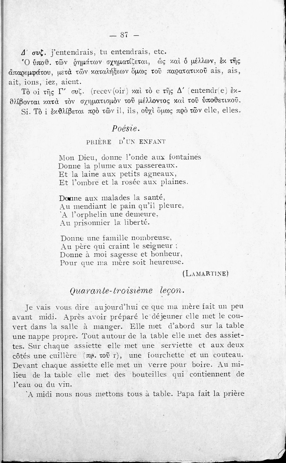 Σχολικό εγχειρίδιο Γαλλικών για τις Β΄ και Γ' Ελληνικού Σχολείου, Αστικού Σχολείου και Παρθεναγωγείου που περιλαμβάνει κείμενα, κανόνες γραμματικής και συντακτικού, και λεξιλογικά και πραγματολογικά σχόλια.