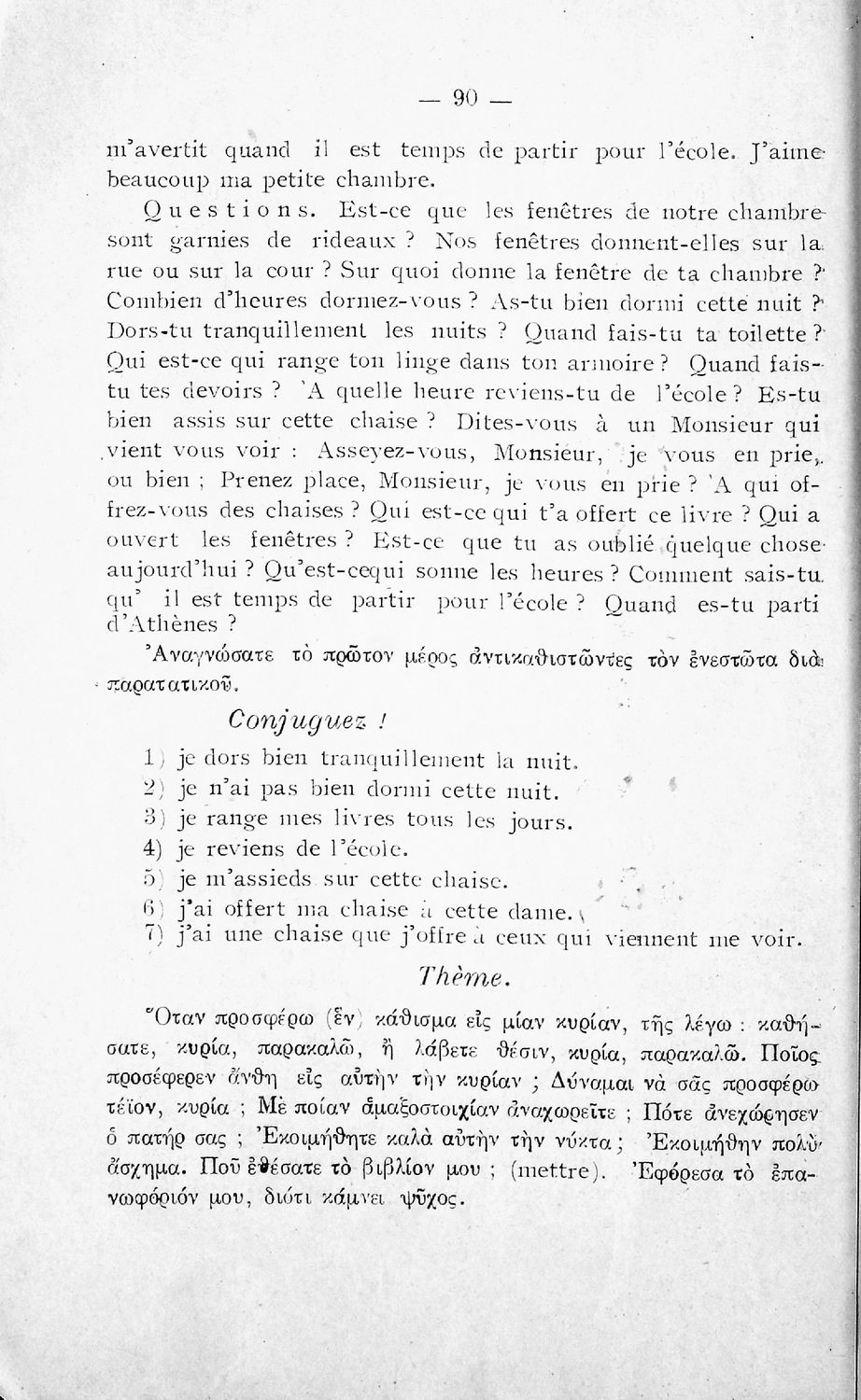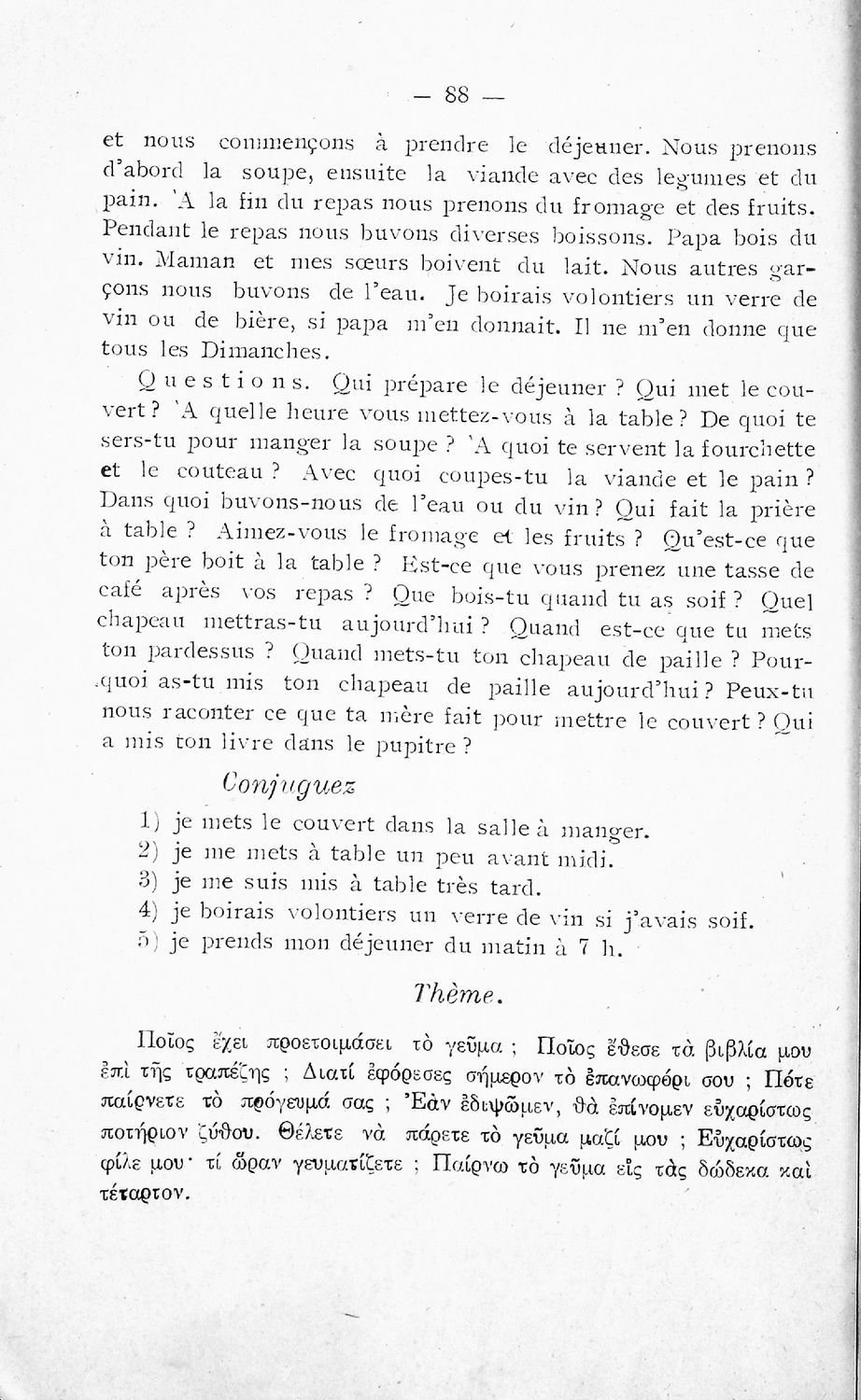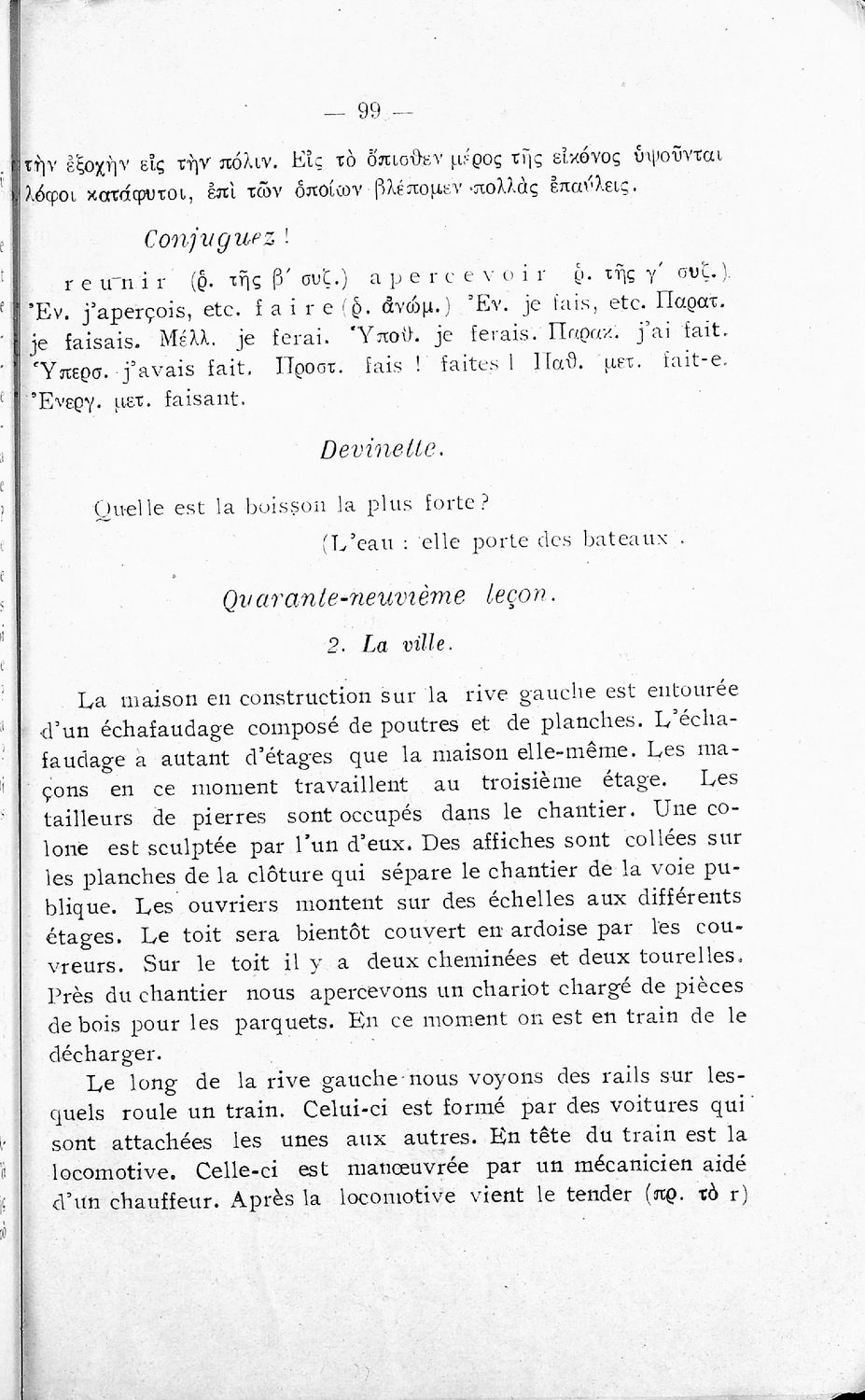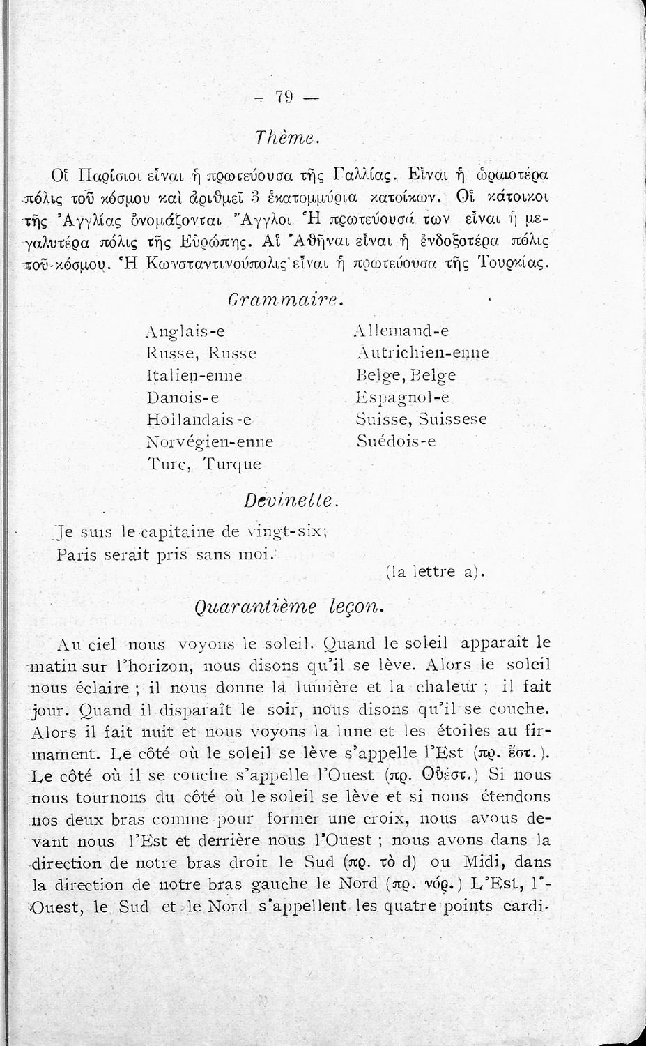 Σχολικό εγχειρίδιο Γαλλικών για τις Β΄ και Γ' Ελληνικού Σχολείου, Αστικού Σχολείου και Παρθεναγωγείου που περιλαμβάνει κείμενα, κανόνες γραμματικής και συντακτικού, και λεξιλογικά και πραγματολογικά σχόλια.