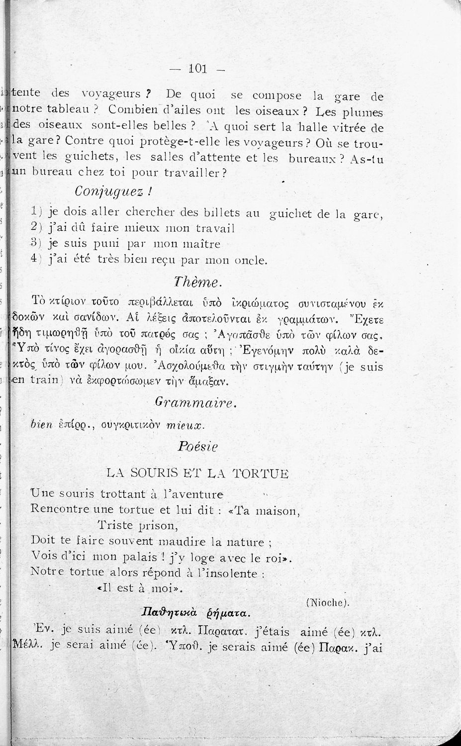 Σχολικό εγχειρίδιο Γαλλικών Β΄ και Γ' Ελληνικού Σχολείου, Αστικού Σχολείου και Παρθεναγωγείου που περιλαμβάνει κείμενα, κανόνες γραμματικής και συντακτικού, ερωτήσεις και ασκήσεις κατανόησης, και λεξιλογικά ...