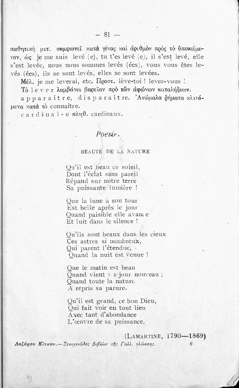 Σχολικό εγχειρίδιο Γαλλικών για τη Β΄ και Γ΄ των Ελληνικών Σχολείων που περιέχει θεωρία, ποιήματα, πεζά, λεξιλόγιο και ασκήσεις. Ο συγγραφέας ήταν καθηγητής της Γαλλικής στο ΕΜΠ.