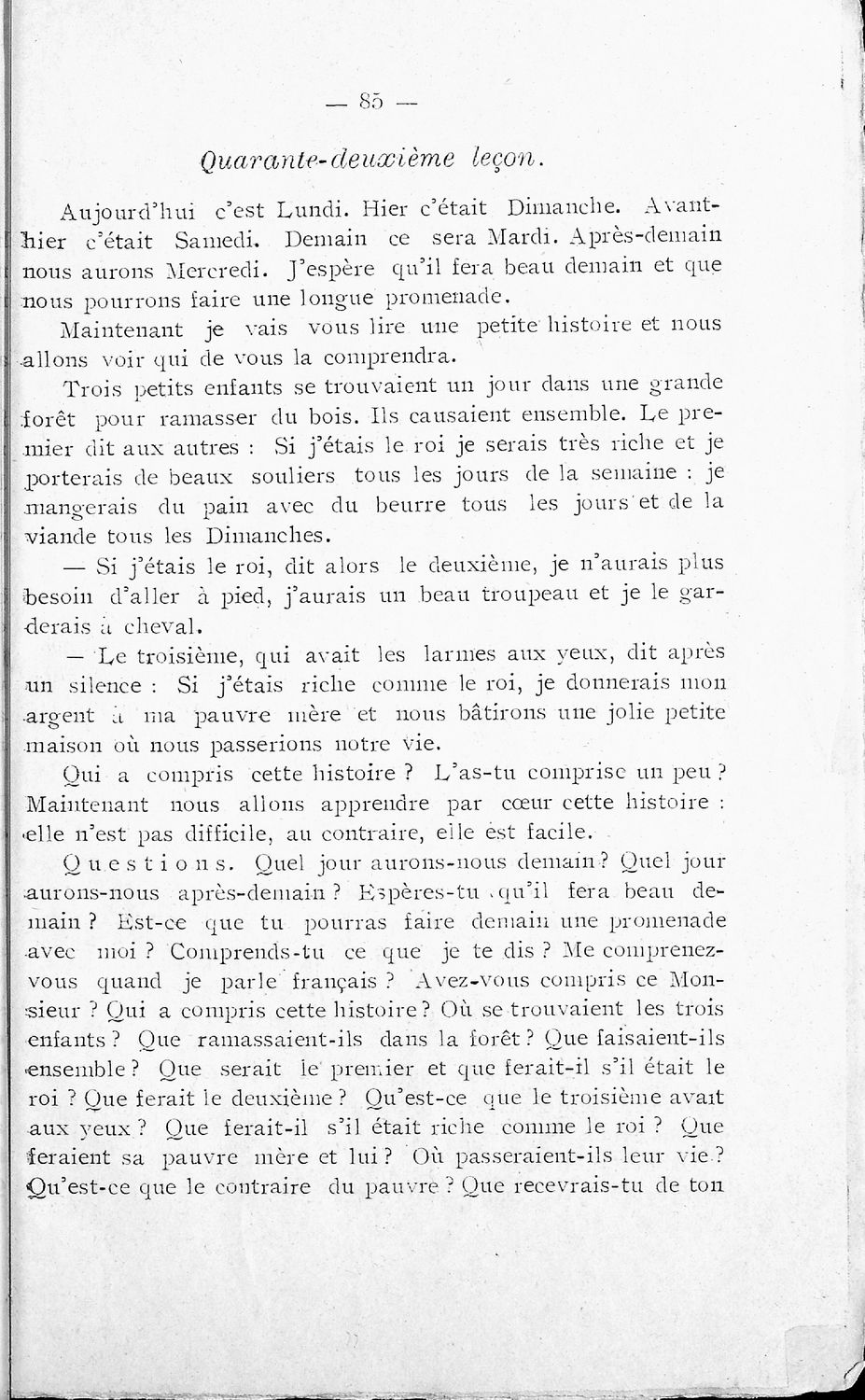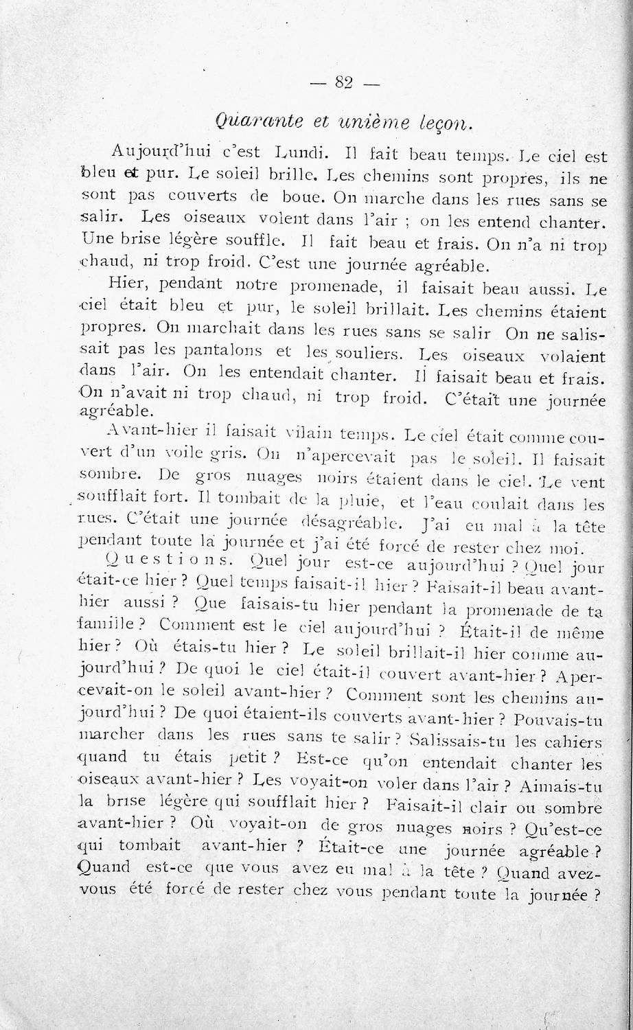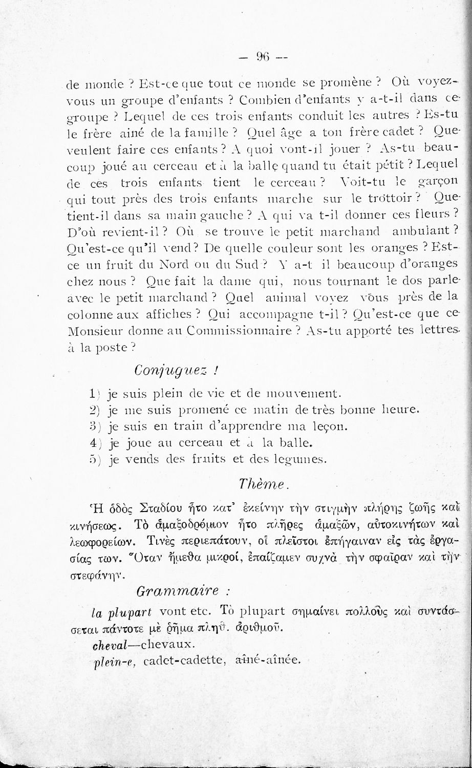 Σχολικό εγχειρίδιο Γαλλικών που περιλαμβάνει 54 κείμενα για τη διδασκαλία των γραμματικών και συντακτικών φαινομένων και της ορθογραφίας, λεξιλόγιο και παράρτημα με τους κανόνες συλλαβισμού.