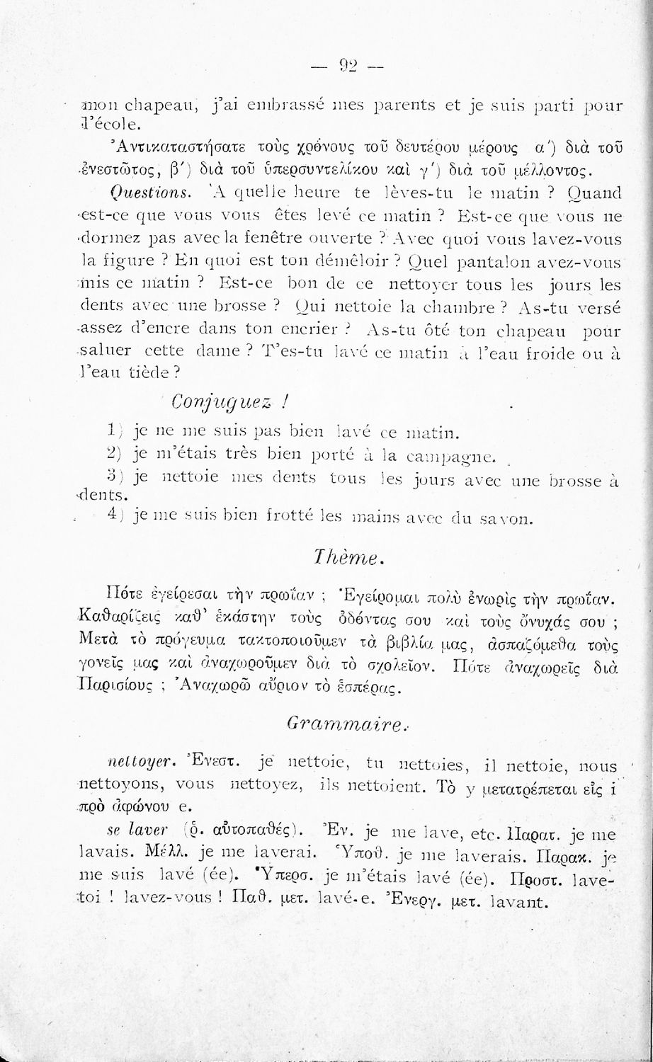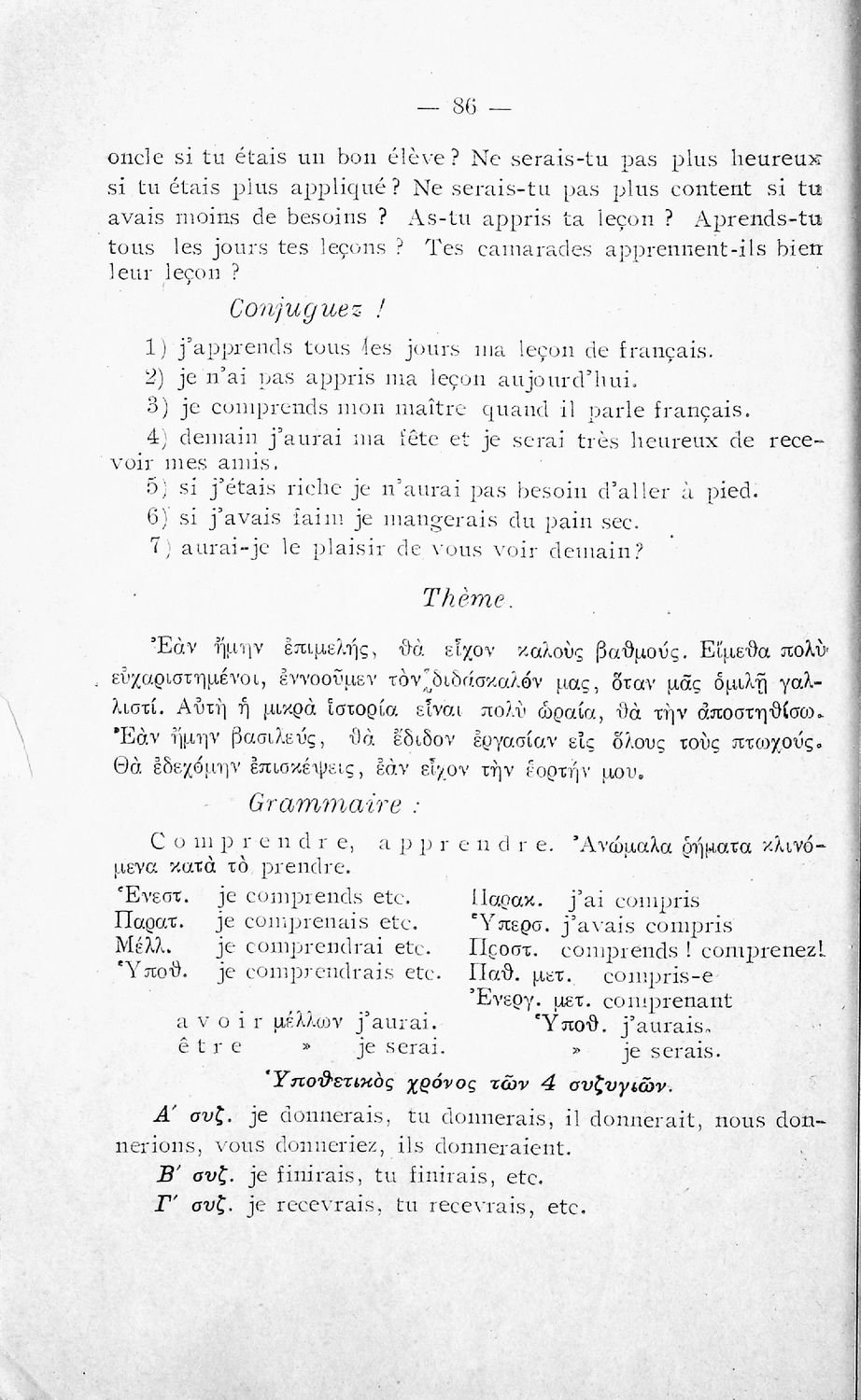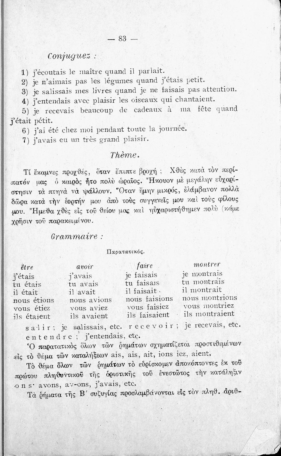 Γραμματική της Γαλλικής γλώσσας για τα Τετρατάξια Γυμνάσια, τη Γ΄ τάξη των Αστικών Σχολείων Θηλέων και τα Διδασκαλεία της Δημοτικής Εκπαίδευσης που περιλαμβάνει θεωρία, ασκήσεις και λεξιλόγιο.