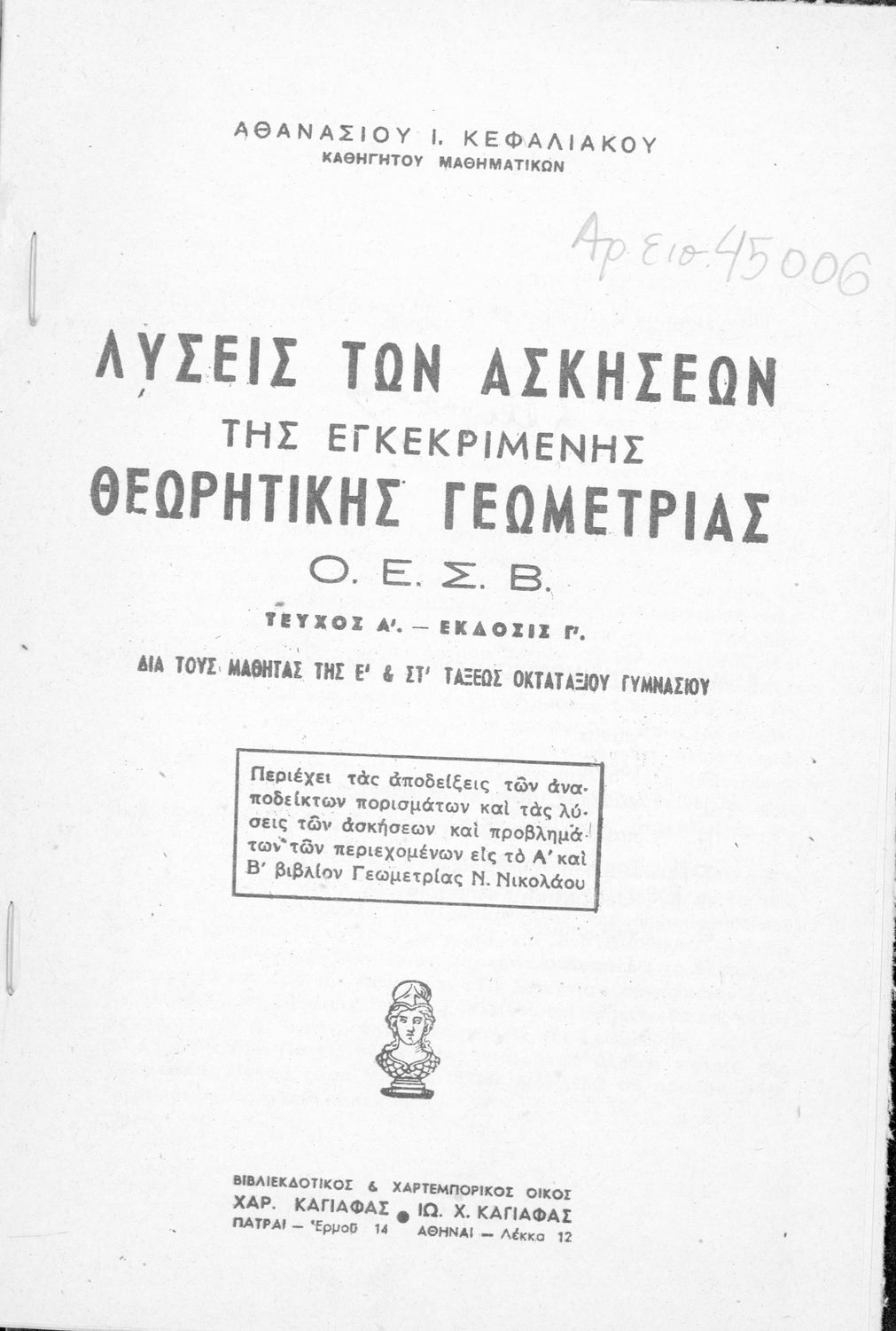 Τίτλος: Λύσεις των ασκήσεων της εγκεκριμένης Θεωρητικής Γεωμετρίας Ο.Ε.Σ.Β. δια τους μαθητάς της Ε΄ & ΣΤ΄ τάξεως Οκταταξίου Γυμνασίου, τεύχος Α