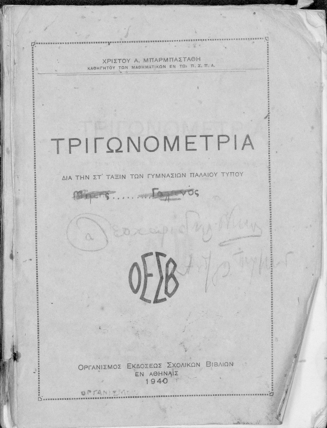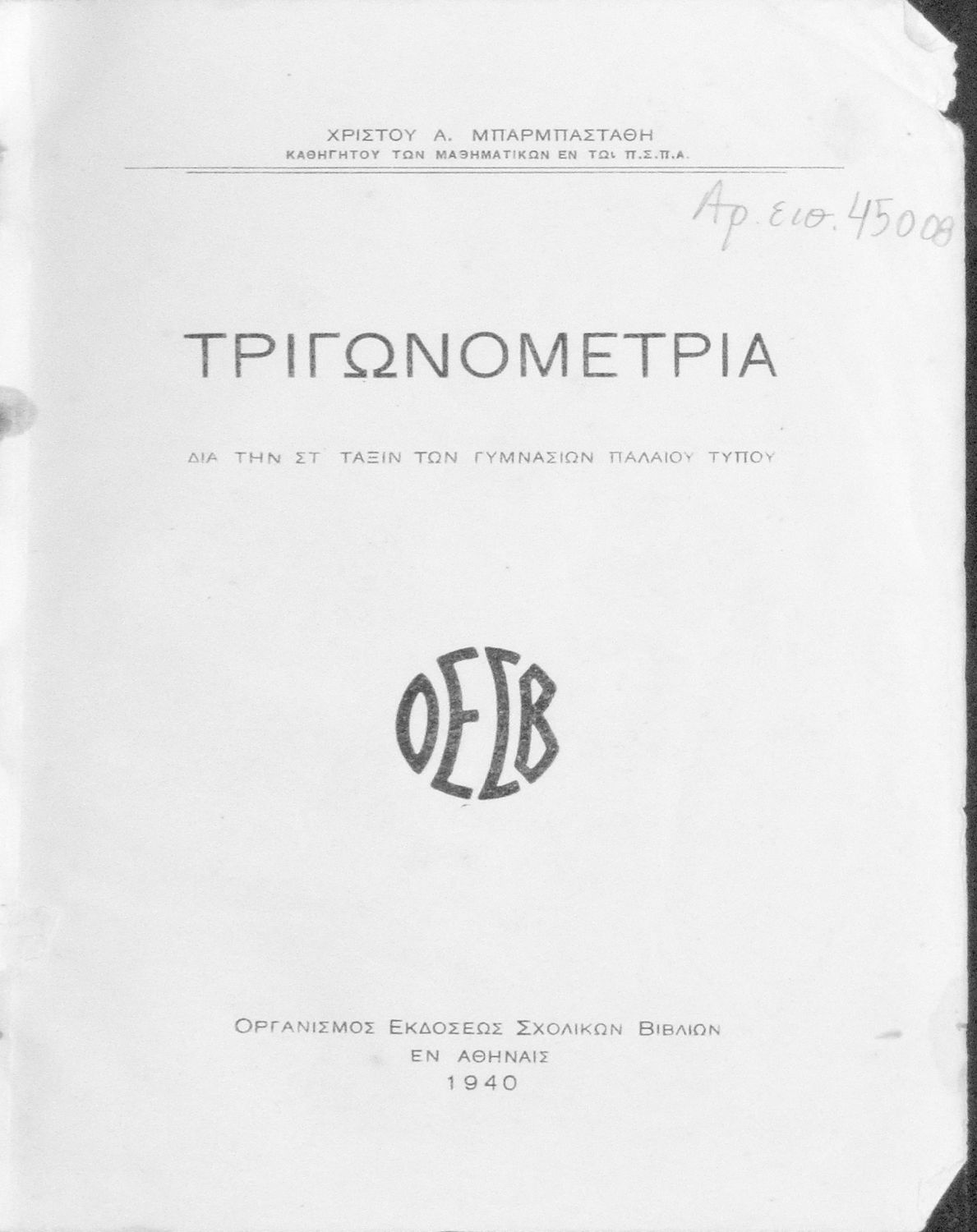 Κωδικός αναγνώρισης: 01-45008 Τίτλος: Τριγωνομετρία δια την ΣΤ΄ τάξιν των Γυμνασίων παλαιού τύπου Συγγραφέας: Χρίστος Α. Μπαρμπαστάθης Μέγεθος και υπόστρωμα: Σχολικό εγχειρίδιο, 20εκ., μαλακό εξώφυλλο, 132 σελίδες. Σκίτσα (ασπρόμαυρα). |