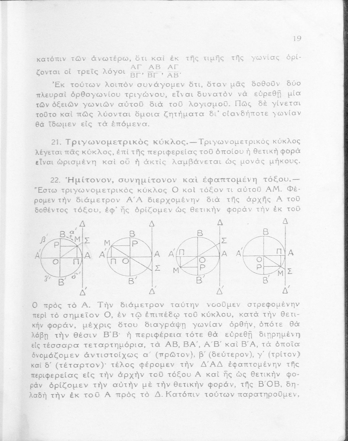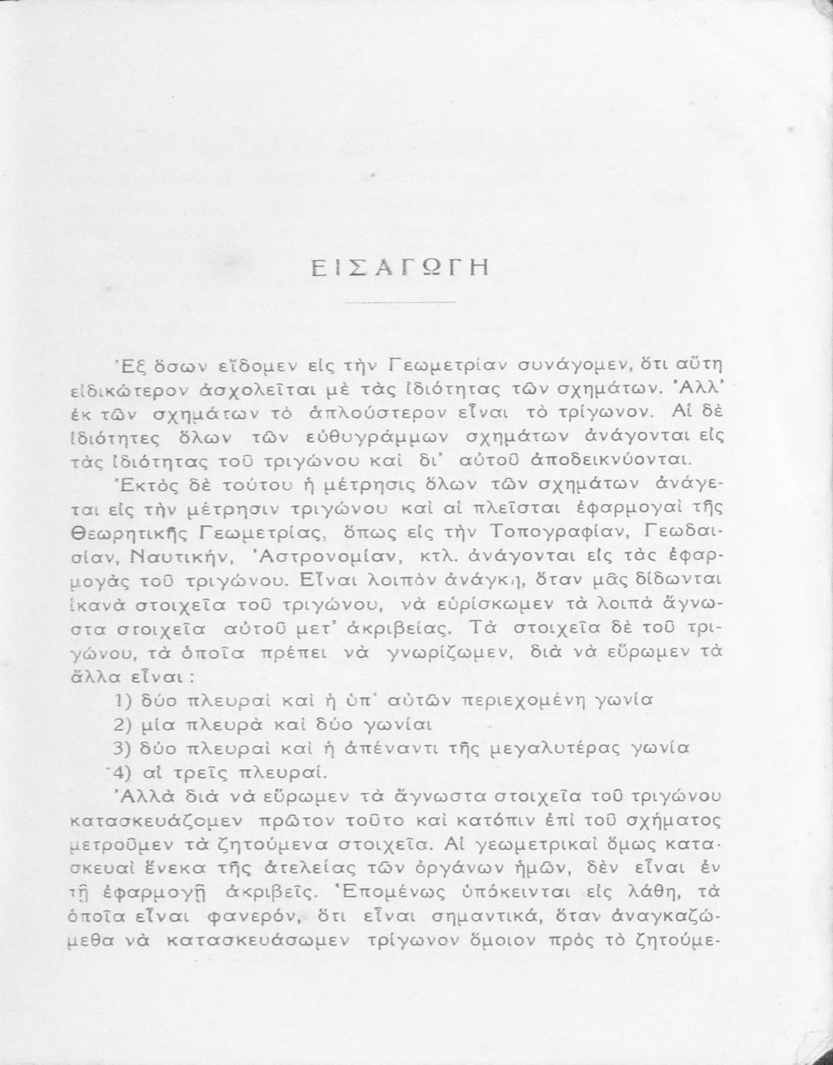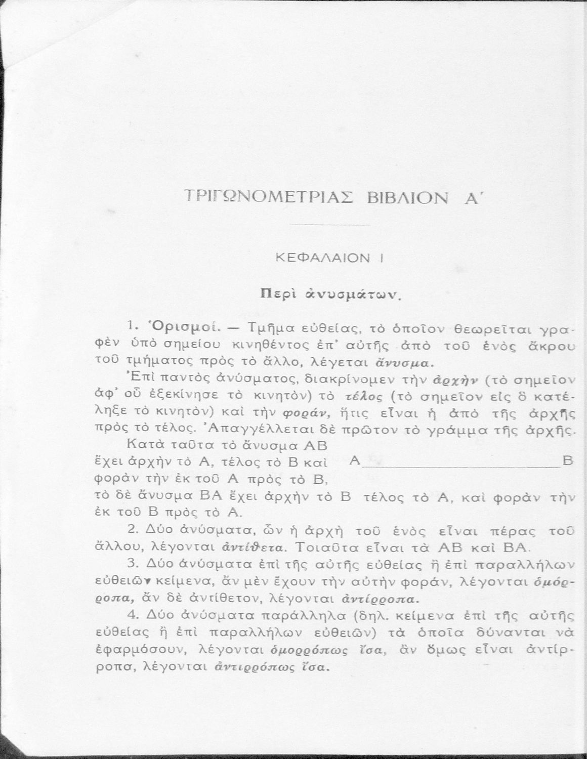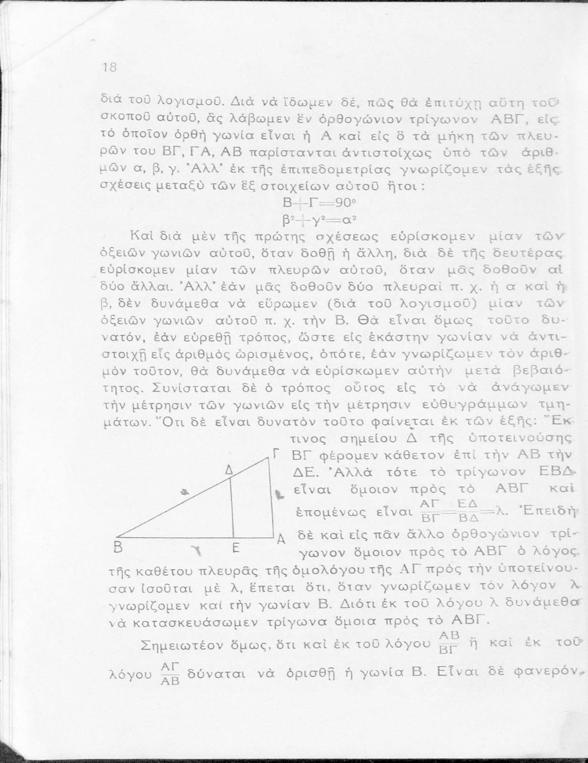 Βαθμίδα εκπαίδευσης: Δευτεροβάθμια Τάξη: ΣΤ' Γυμνασίου Μάθημα: Μαθηματικά Γλώσσα: Απλή καθαρεύουσα Παρουσίαση περιεχομένου: Σχολικό εγχειρίδιο Τριγωνομετρίας για την ΣΤ΄ Γυμνασίου που περιλαμβάνει θεωρήματα και ασκήσεις. |