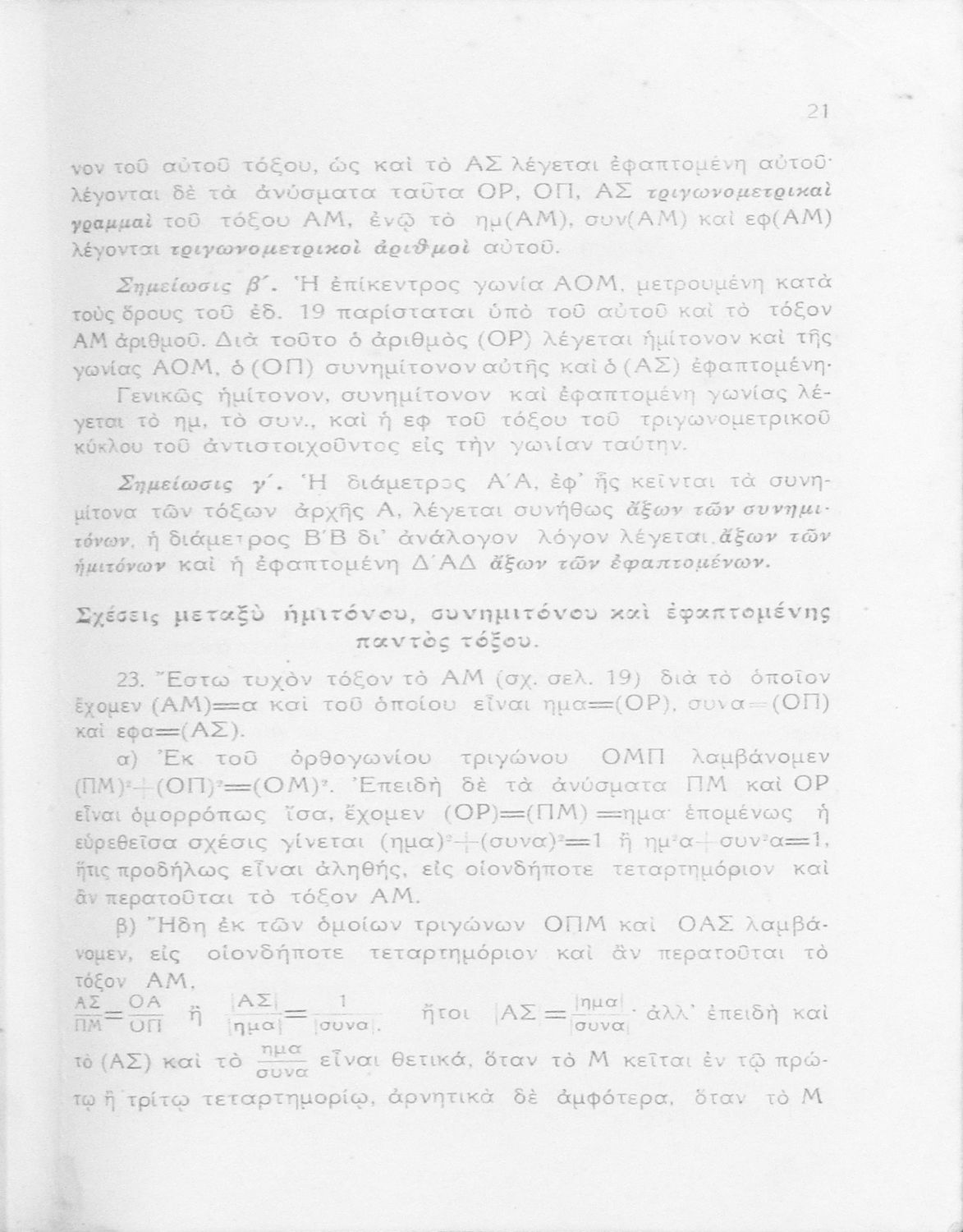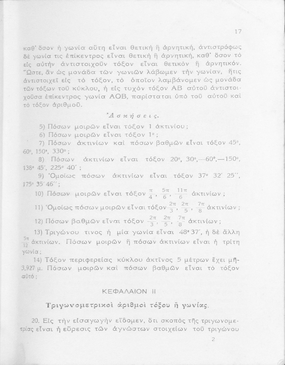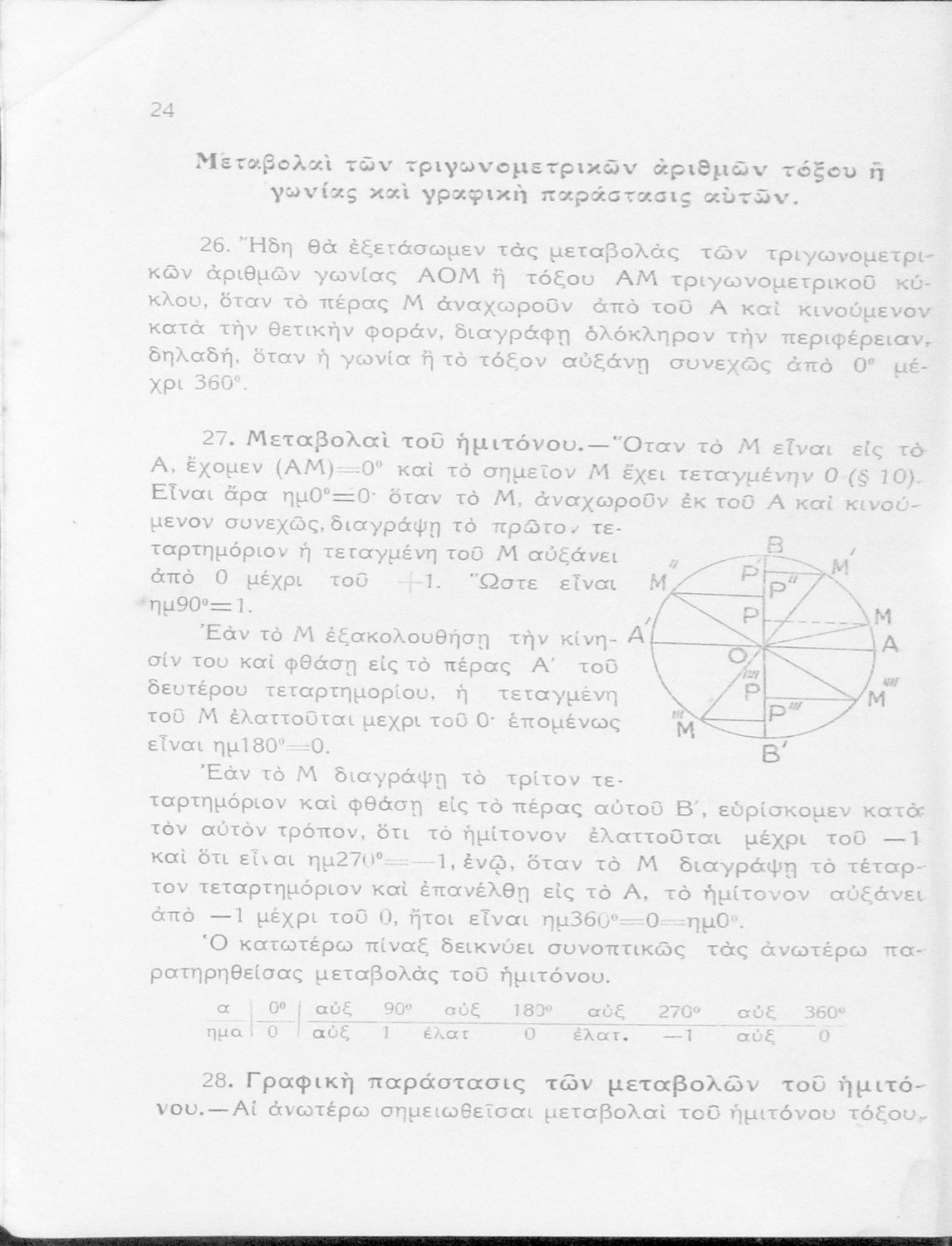 Βαθμίδα εκπαίδευσης: Δευτεροβάθμια Τάξη: ΣΤ' Γυμνασίου Μάθημα: Μαθηματικά Γλώσσα: Απλή καθαρεύουσα Παρουσίαση περιεχομένου: Σχολικό εγχειρίδιο Τριγωνομετρίας για την ΣΤ΄ Γυμνασίου που περιλαμβάνει θεωρήματα και ασκήσεις. |