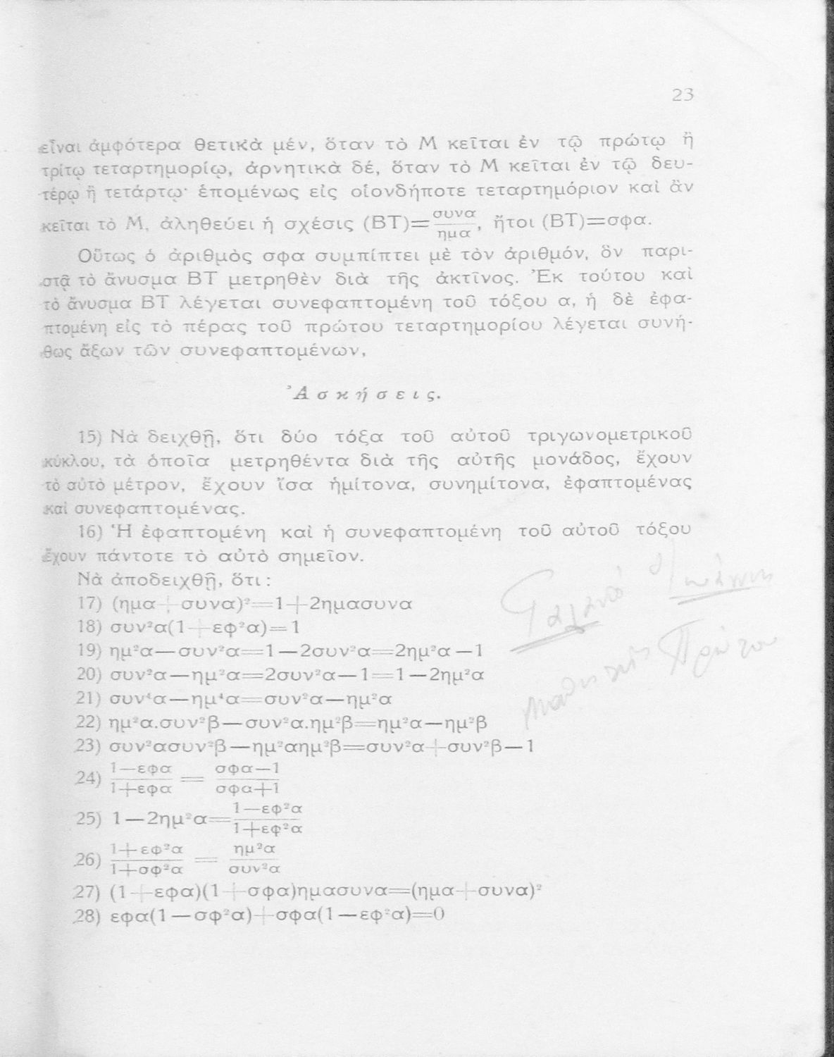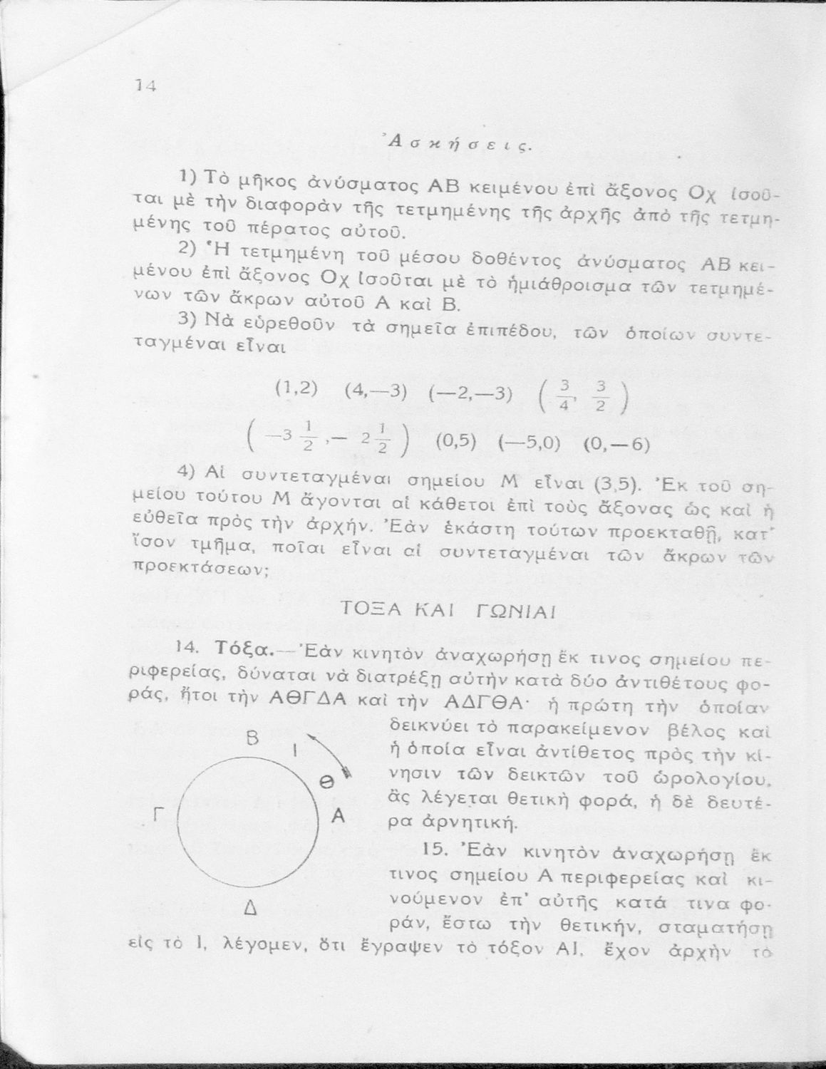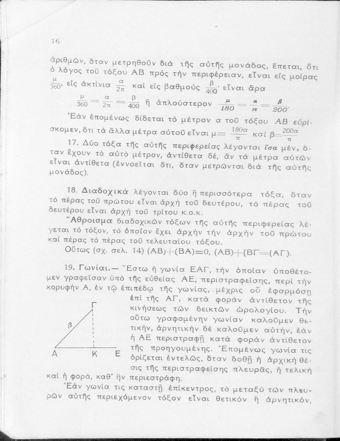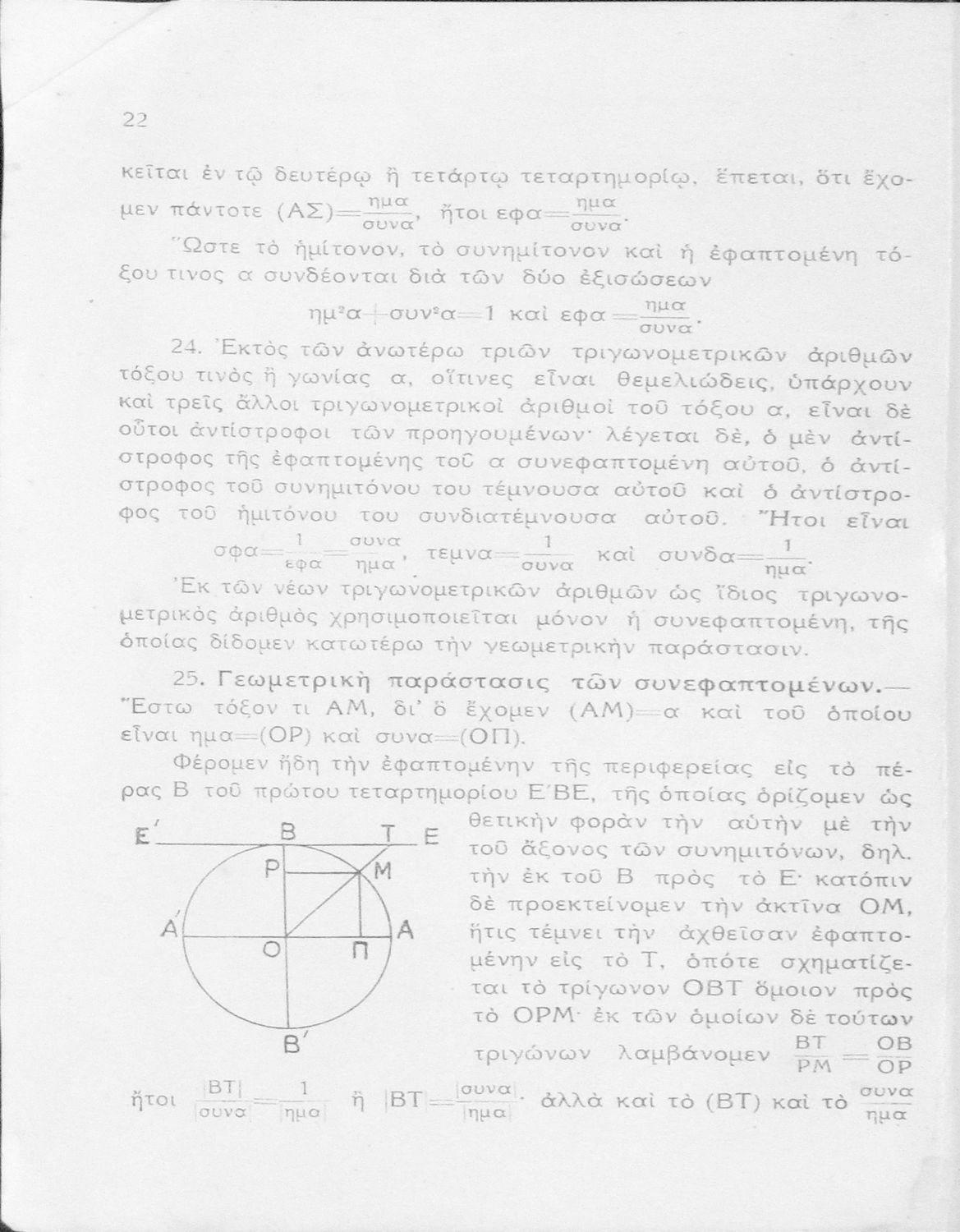 Βαθμίδα εκπαίδευσης: Δευτεροβάθμια Τάξη: ΣΤ' Γυμνασίου Μάθημα: Μαθηματικά Γλώσσα: Απλή καθαρεύουσα Παρουσίαση περιεχομένου: Σχολικό εγχειρίδιο Τριγωνομετρίας για την ΣΤ΄ Γυμνασίου που περιλαμβάνει θεωρήματα και ασκήσεις. |