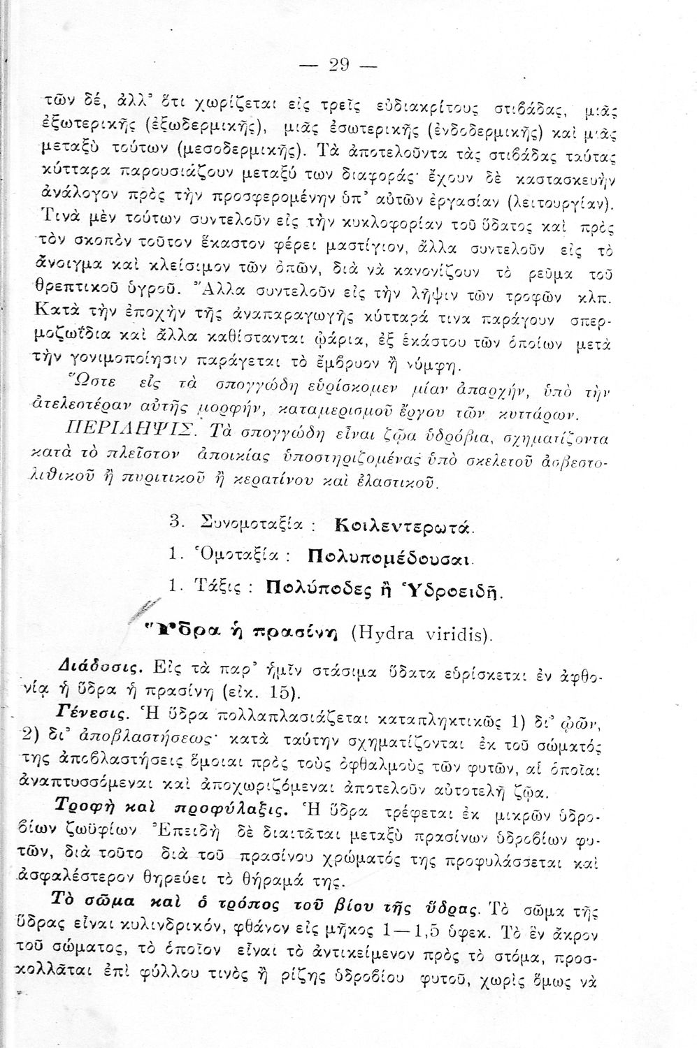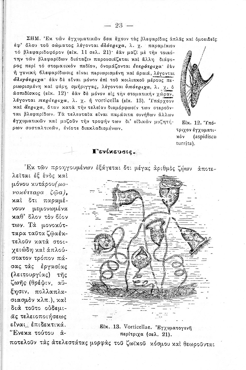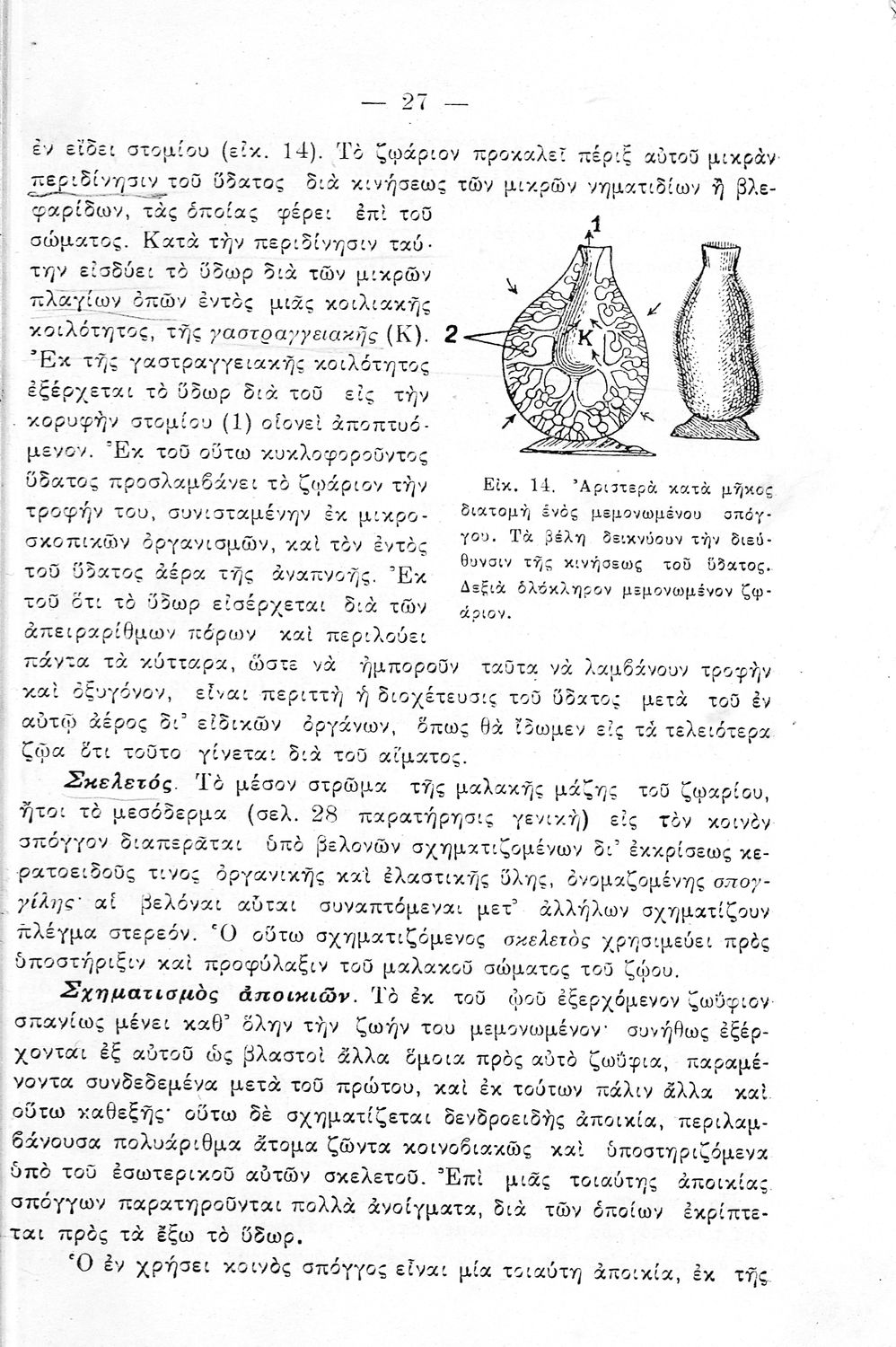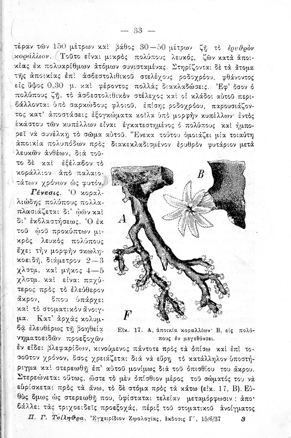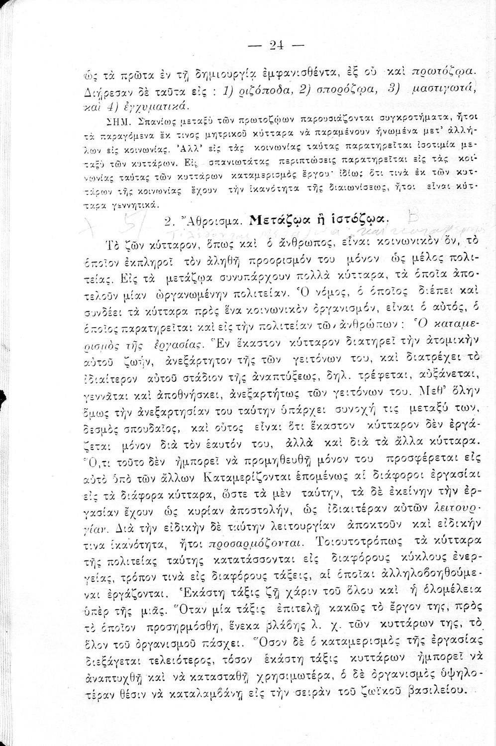 Σχολικό εγχειρίδιο Ζωολογίας για τα Γυμνάσια και τα Διδασκαλεία που εστιάζει στην ανθρώπινη φυσιολογία και παρουσιάζει τα διάφορα ζώα ανάλογα με την συνομοταξία στην οποία ανήκουν.
