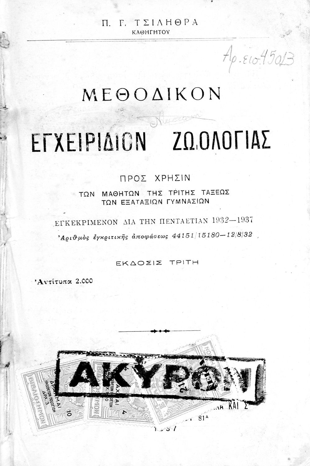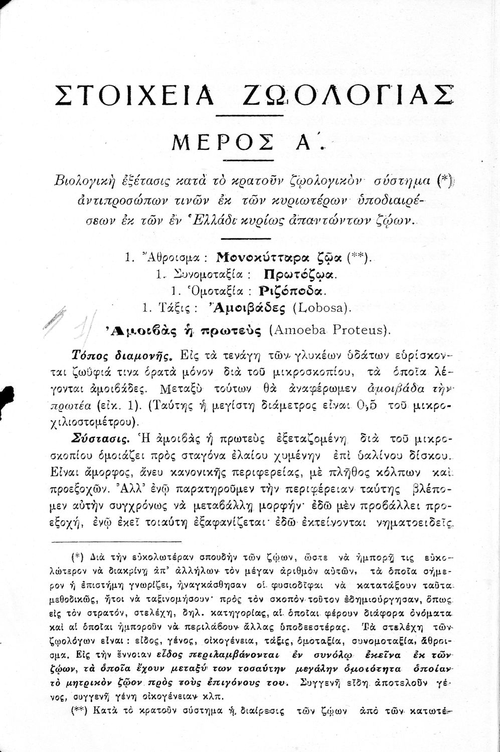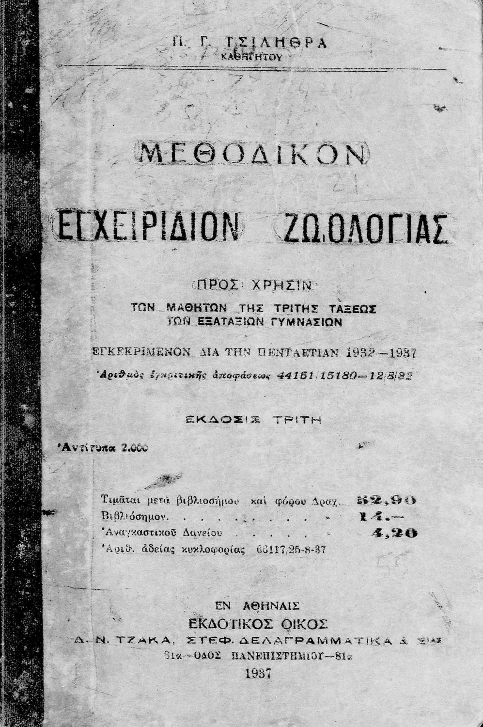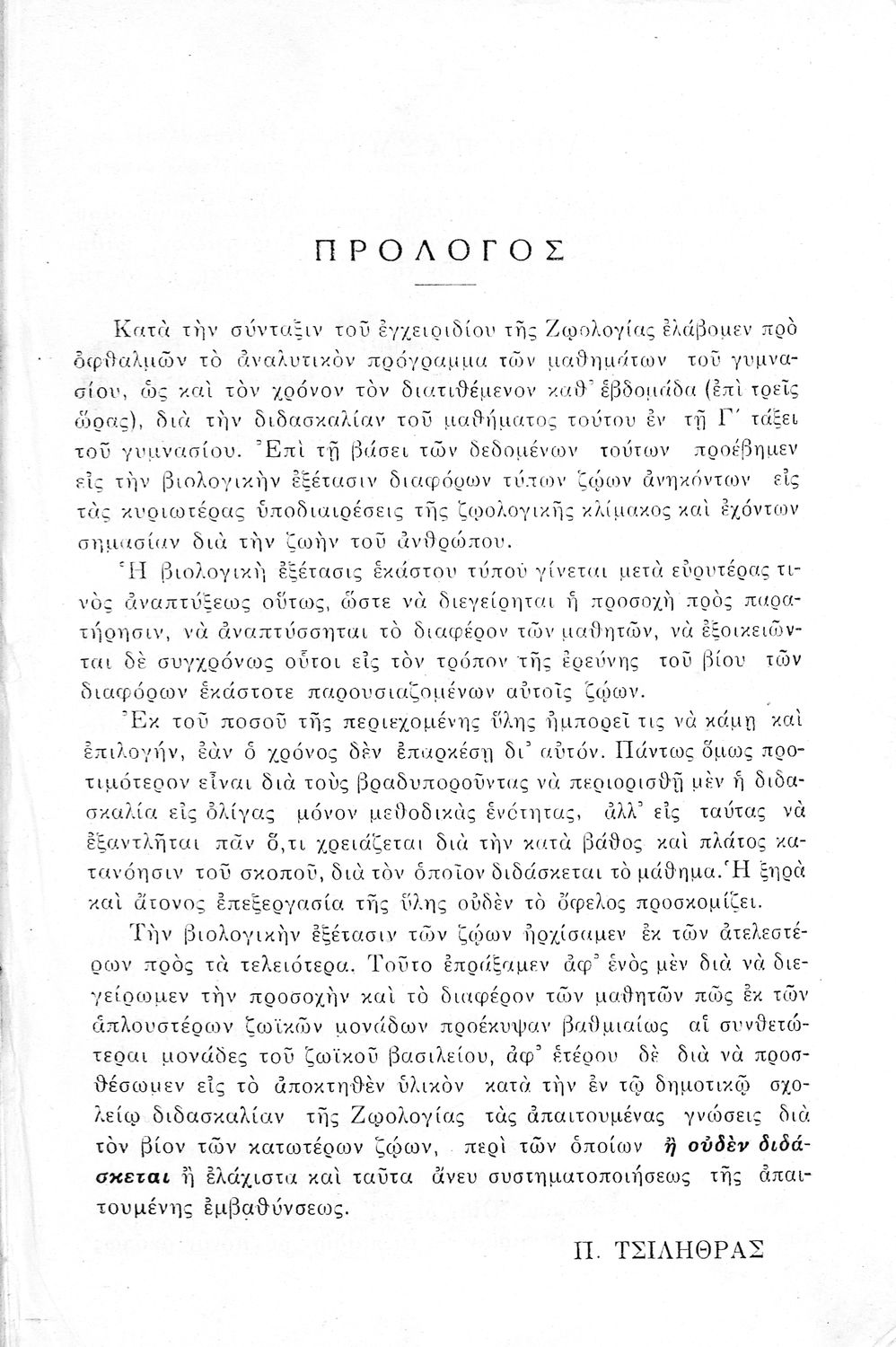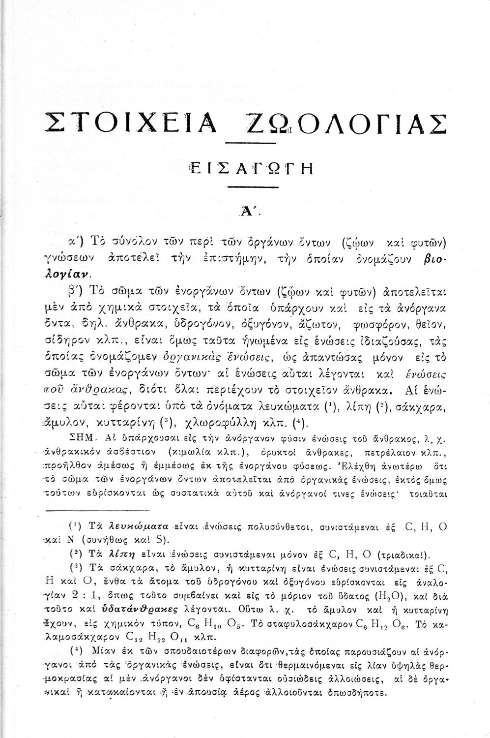 Σχολικό εγχειρίδιο Ζωολογίας για τα Γυμνάσια και τα Διδασκαλεία που εστιάζει στην ανθρώπινη φυσιολογία και παρουσιάζει τα διάφορα ζώα ανάλογα με την συνομοταξία στην οποία ανήκουν.