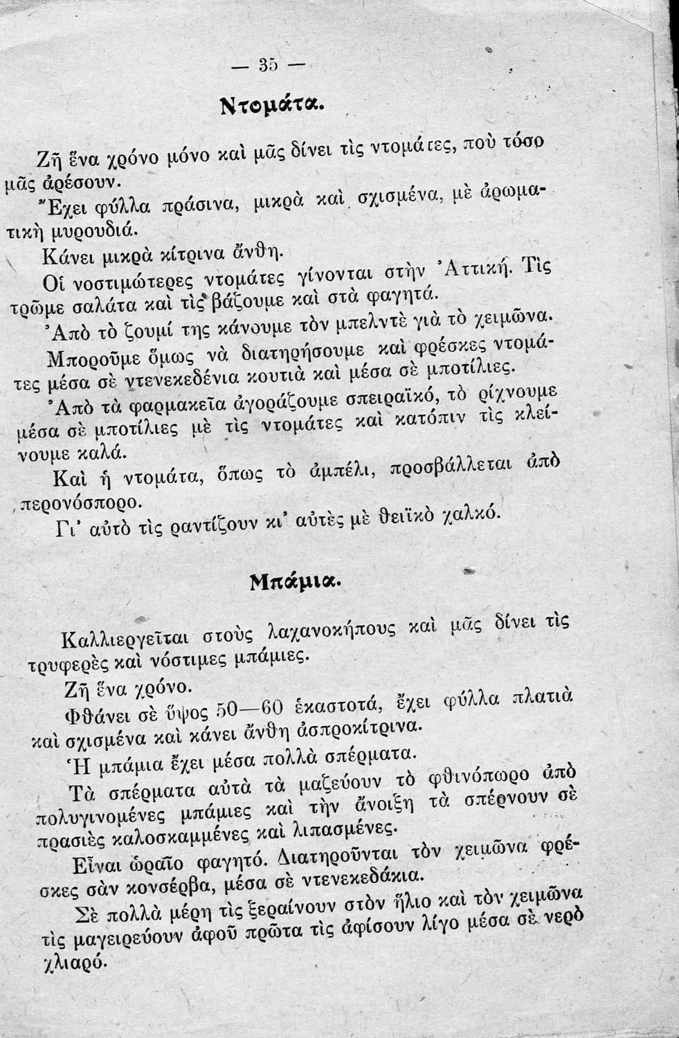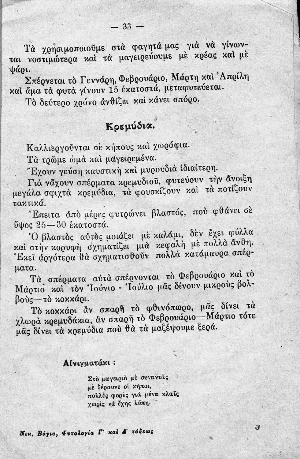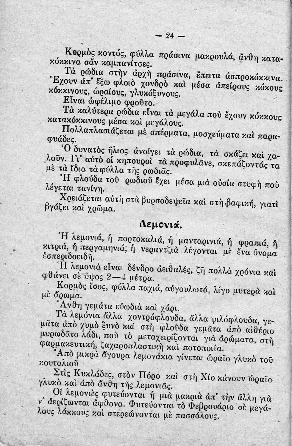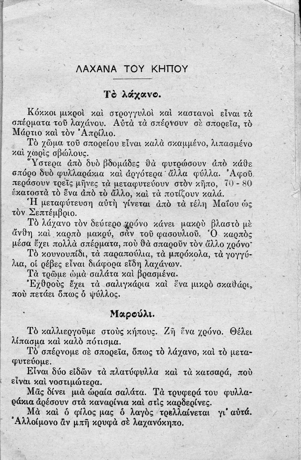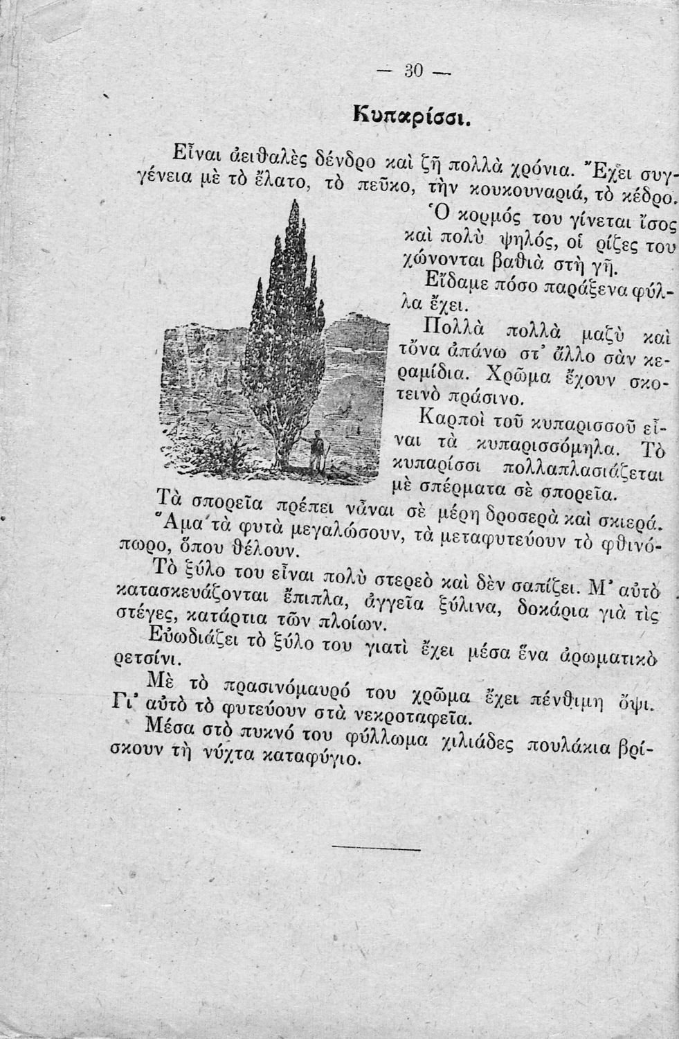 Βαθμίδα εκπαίδευσης: Πρωτοβάθμια Τάξη: Γ' Δημοτικού / Δ' Δημοτικού Μάθημα: Φυτολογία Γλώσσα: Καθαρεύουσα Παρουσίαση περιεχομένου: Μαθητικό βοήθημα Φυτολογίας Γ΄ και Δ΄ Δημοτικού που περιέχει βασικές γνώσεις για τα φυτά, που βρίσκονται στους κήπους των σπιτιών, στους αγρούς και τα φυτά της θάλασσας. |
