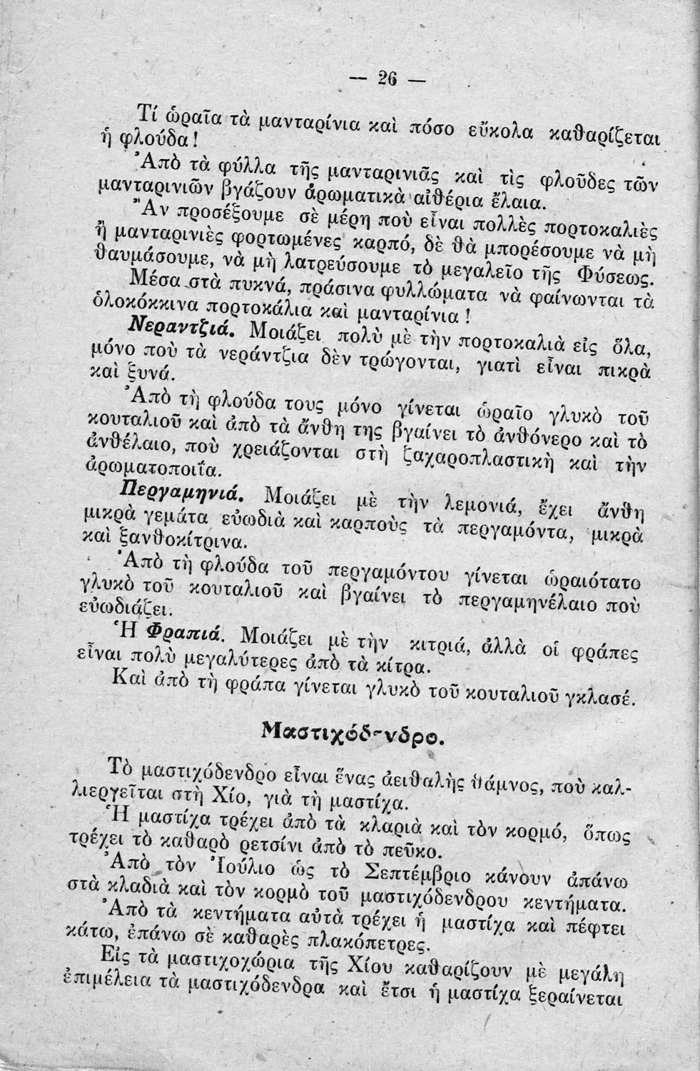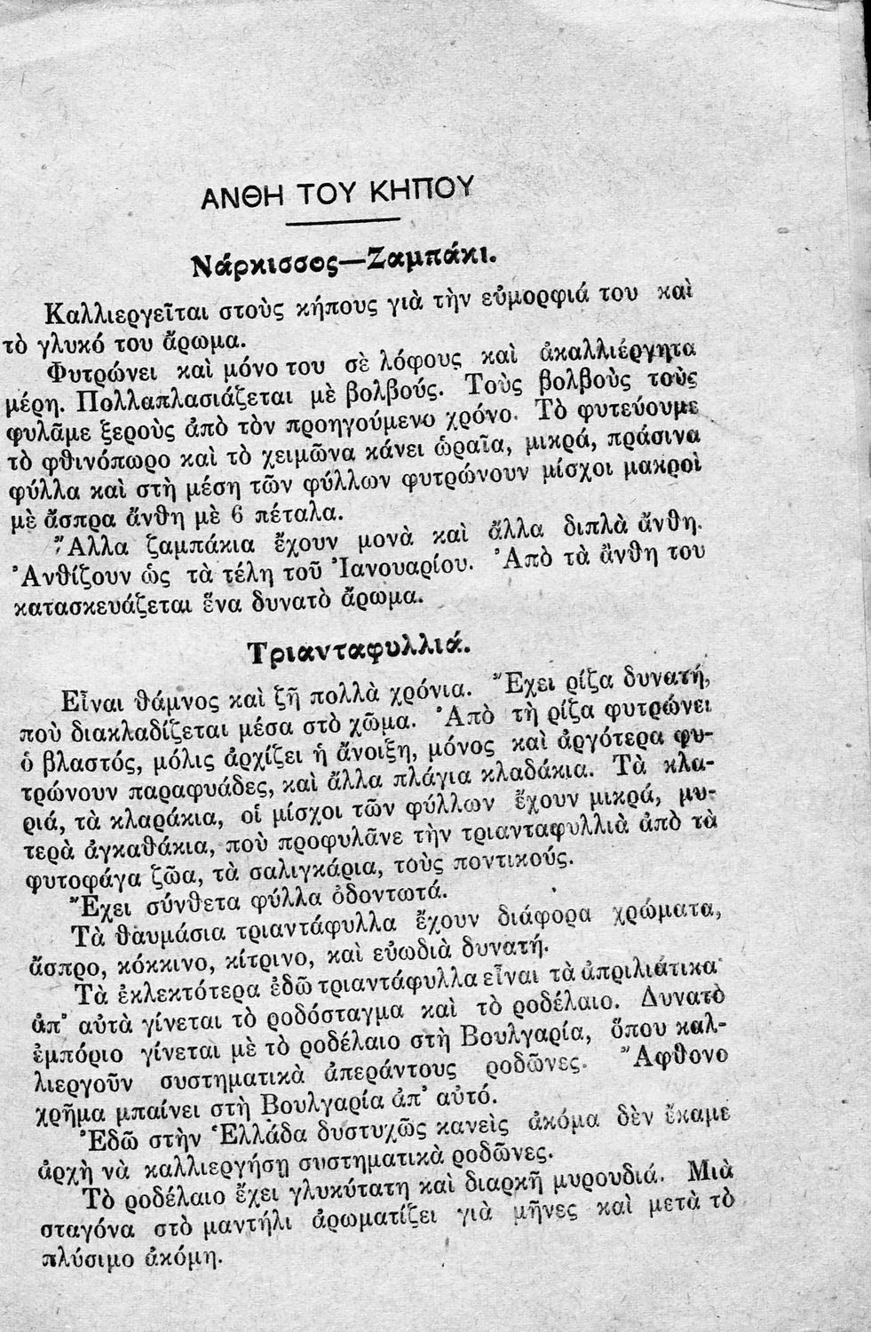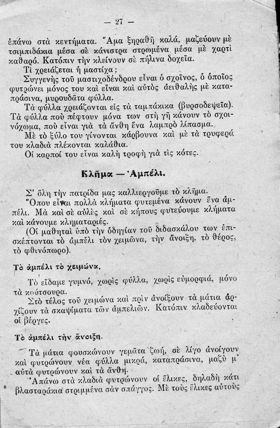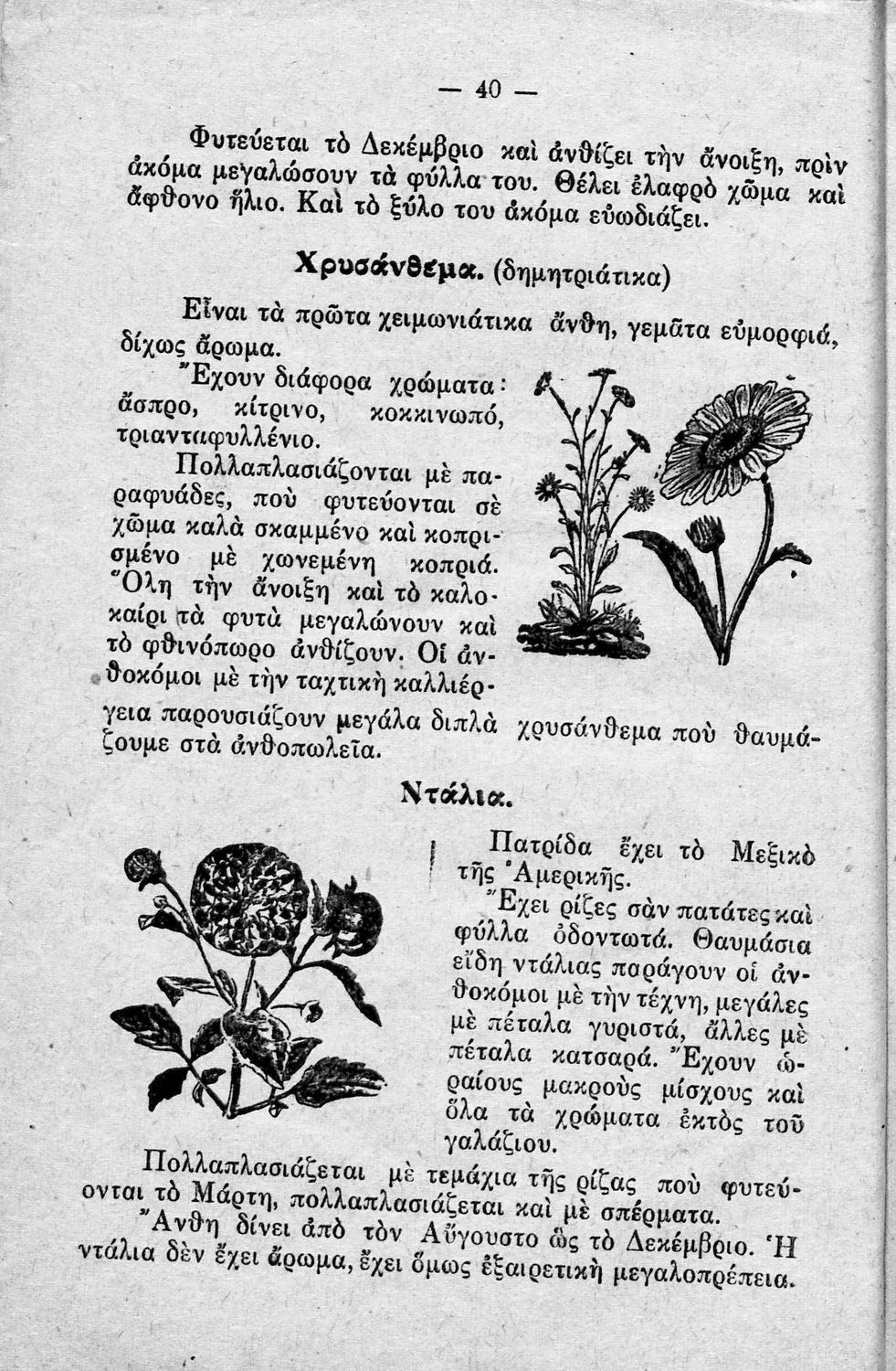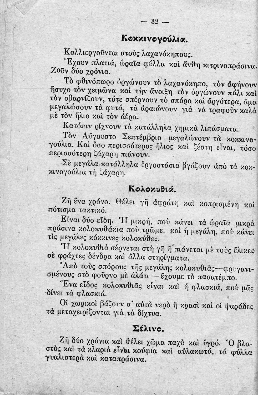 Βαθμίδα εκπαίδευσης: Πρωτοβάθμια Τάξη: Γ' Δημοτικού / Δ' Δημοτικού Μάθημα: Φυτολογία Γλώσσα: Καθαρεύουσα Παρουσίαση περιεχομένου: Μαθητικό βοήθημα Φυτολογίας Γ΄ και Δ΄ Δημοτικού που περιέχει βασικές γνώσεις για τα φυτά, που βρίσκονται στους κήπους των σπιτιών, στους αγρούς και τα φυτά της θάλασσας. |