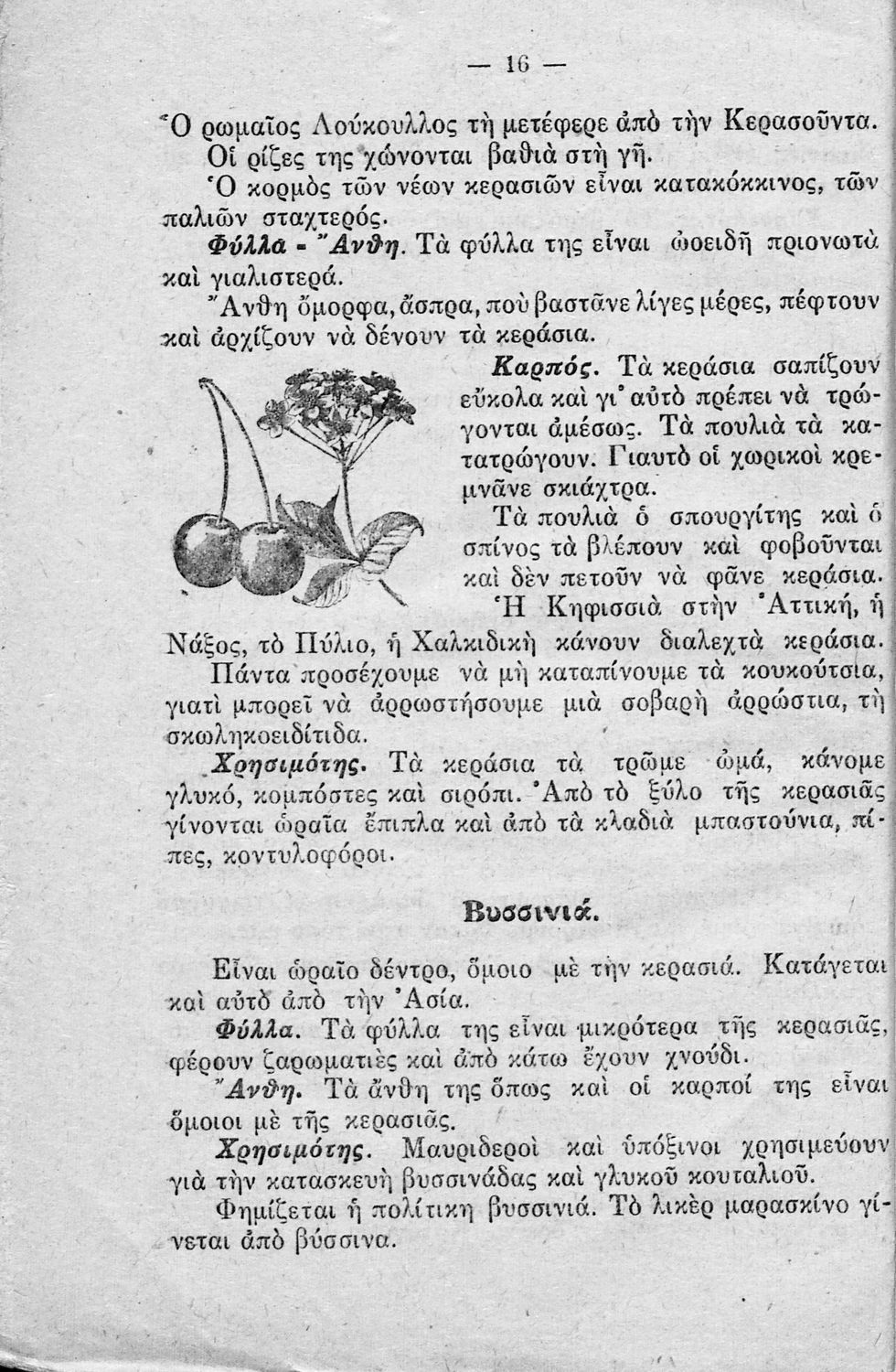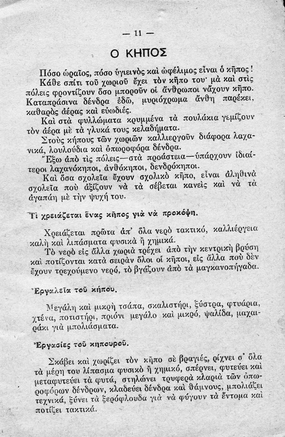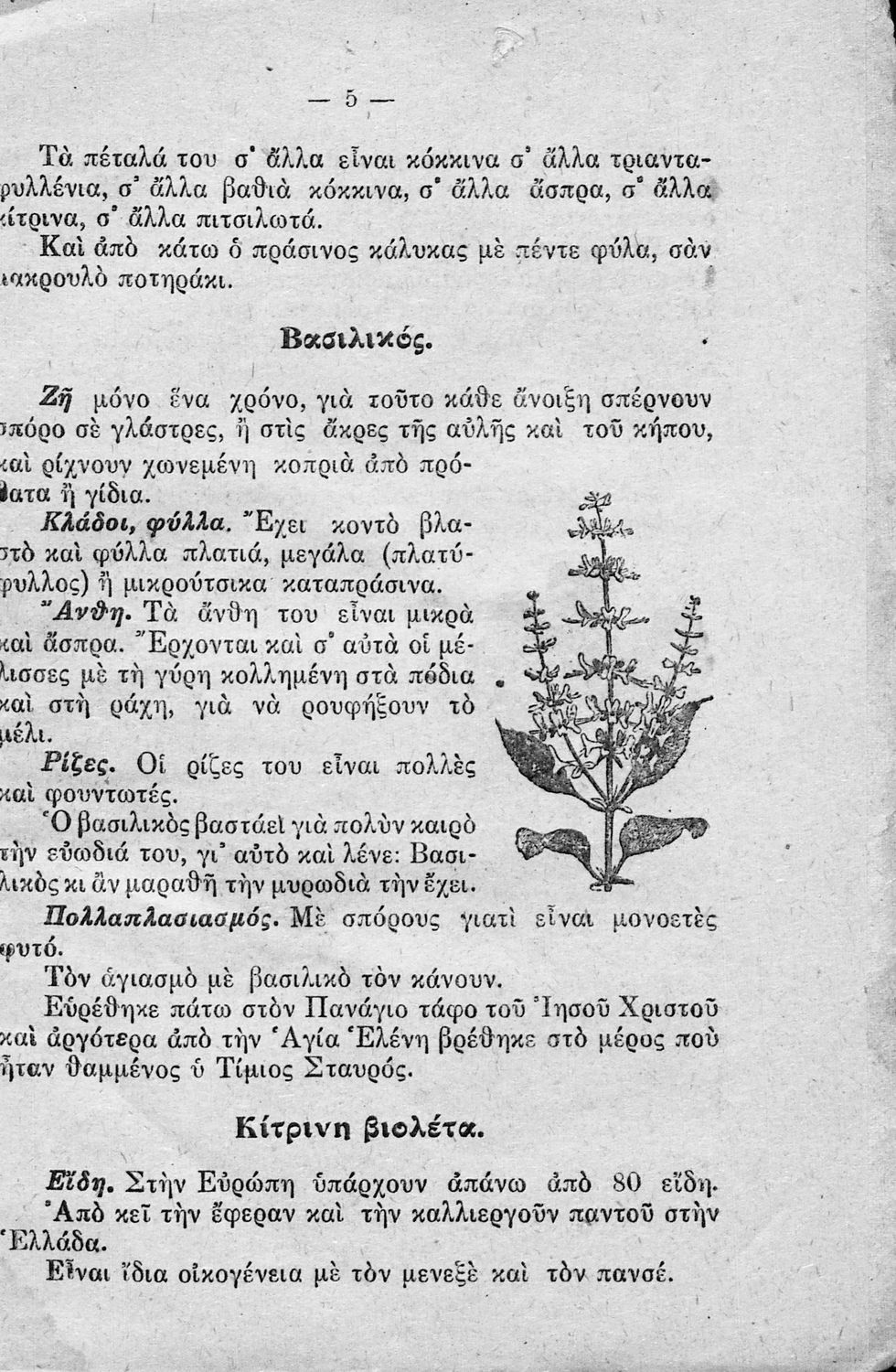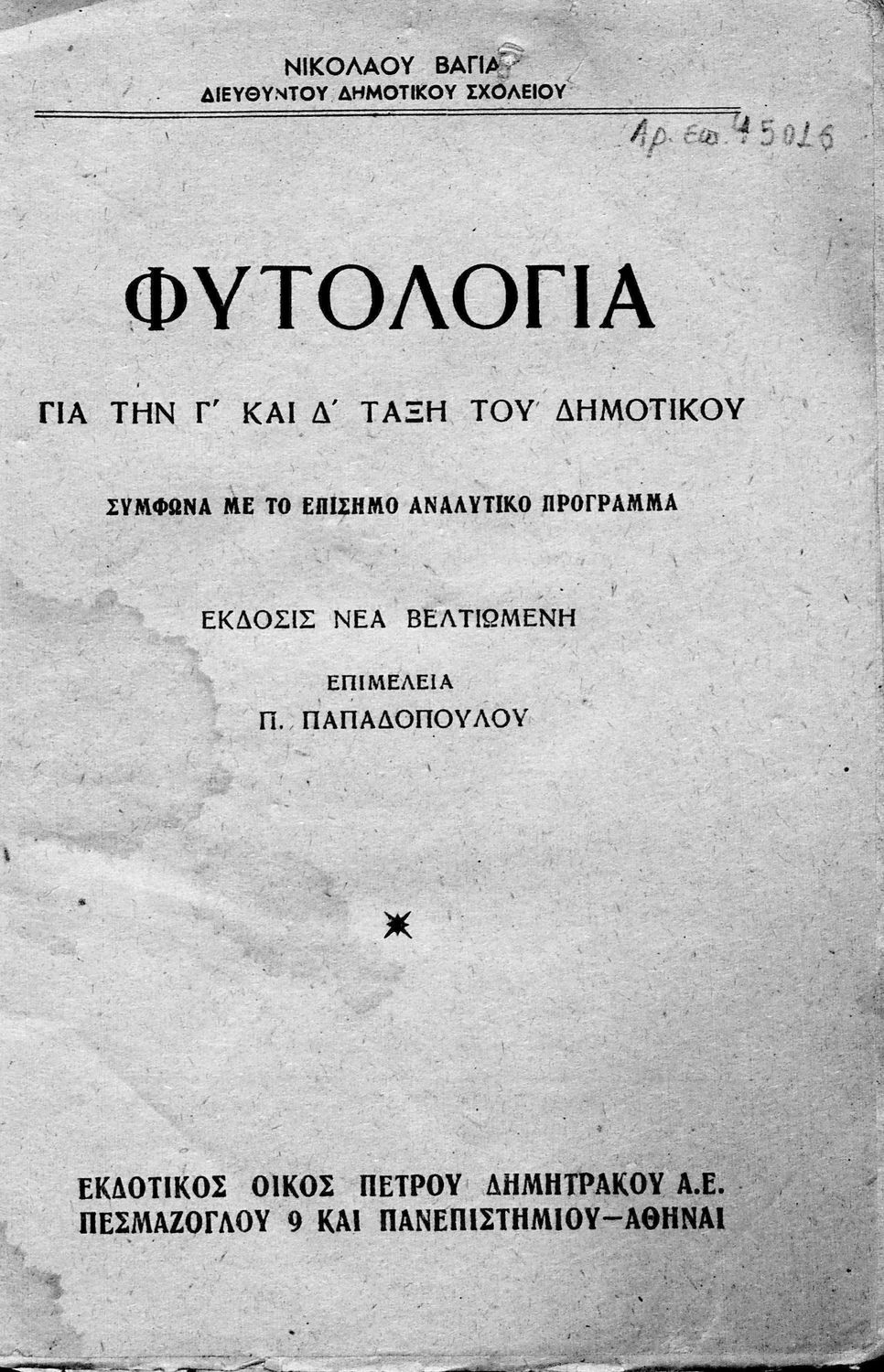 Βαθμίδα εκπαίδευσης: Πρωτοβάθμια Τάξη: Γ' Δημοτικού / Δ' Δημοτικού Μάθημα: Φυτολογία Γλώσσα: Καθαρεύουσα Παρουσίαση περιεχομένου: Μαθητικό βοήθημα Φυτολογίας Γ΄ και Δ΄ Δημοτικού που περιέχει βασικές γνώσεις για τα φυτά, που βρίσκονται στους κήπους των σπιτιών, στους αγρούς και τα φυτά της θάλασσας. |