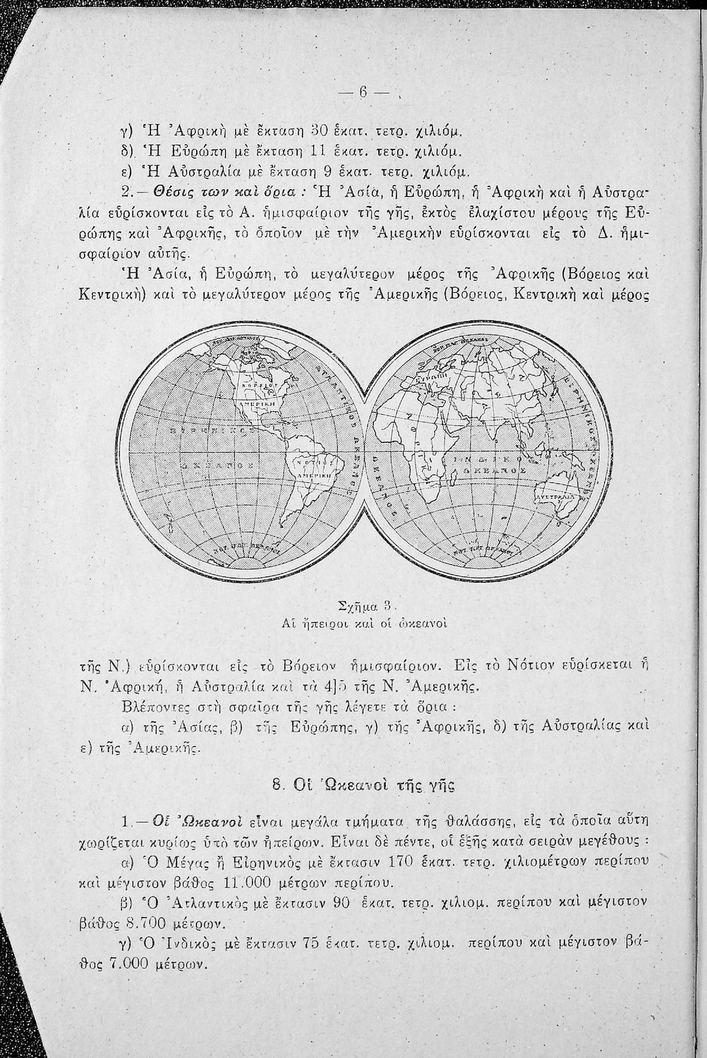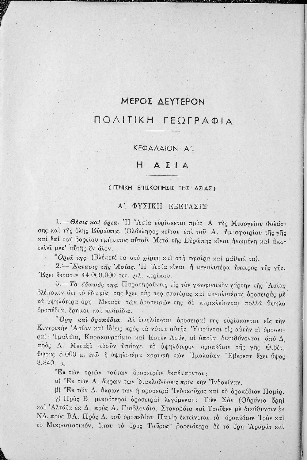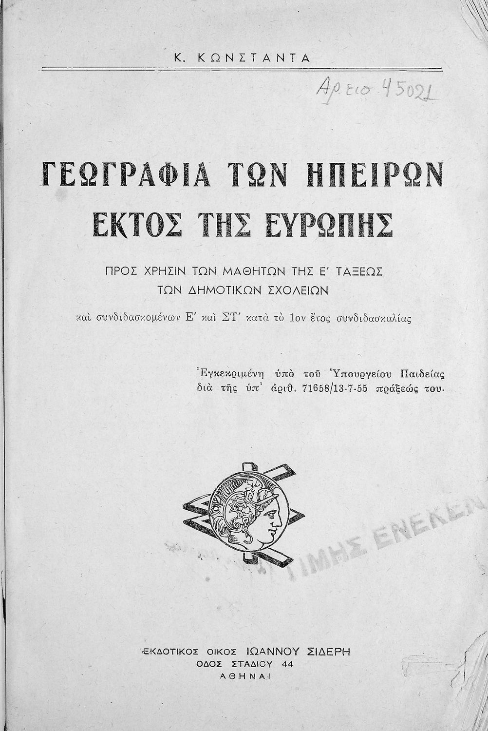 Κωδικός αναγνώρισης: 01-45021 Τίτλος: Γεωγραφία των Ηπείρων εκτός της Ευρώπης, προς χρήσιν των μαθητών της Ε΄ τάξεως των Δημοτικών Σχολείων και συνδιδασκομένων Ε΄ και ΣΤ΄ κατά το 1ον έτος συνδιδασκαλίας Συγγραφέας: Κ. Κωνσταντάς, Π. Παπαδόπουλος Μέγεθος και υπόστρωμα: Μαθητικό βοήθημα, μαλακό εξώφυλλο, 185 σελίδες. Εικόνες (ασπρόμαυρες), χάρτες (ασπρόμαυροι). |