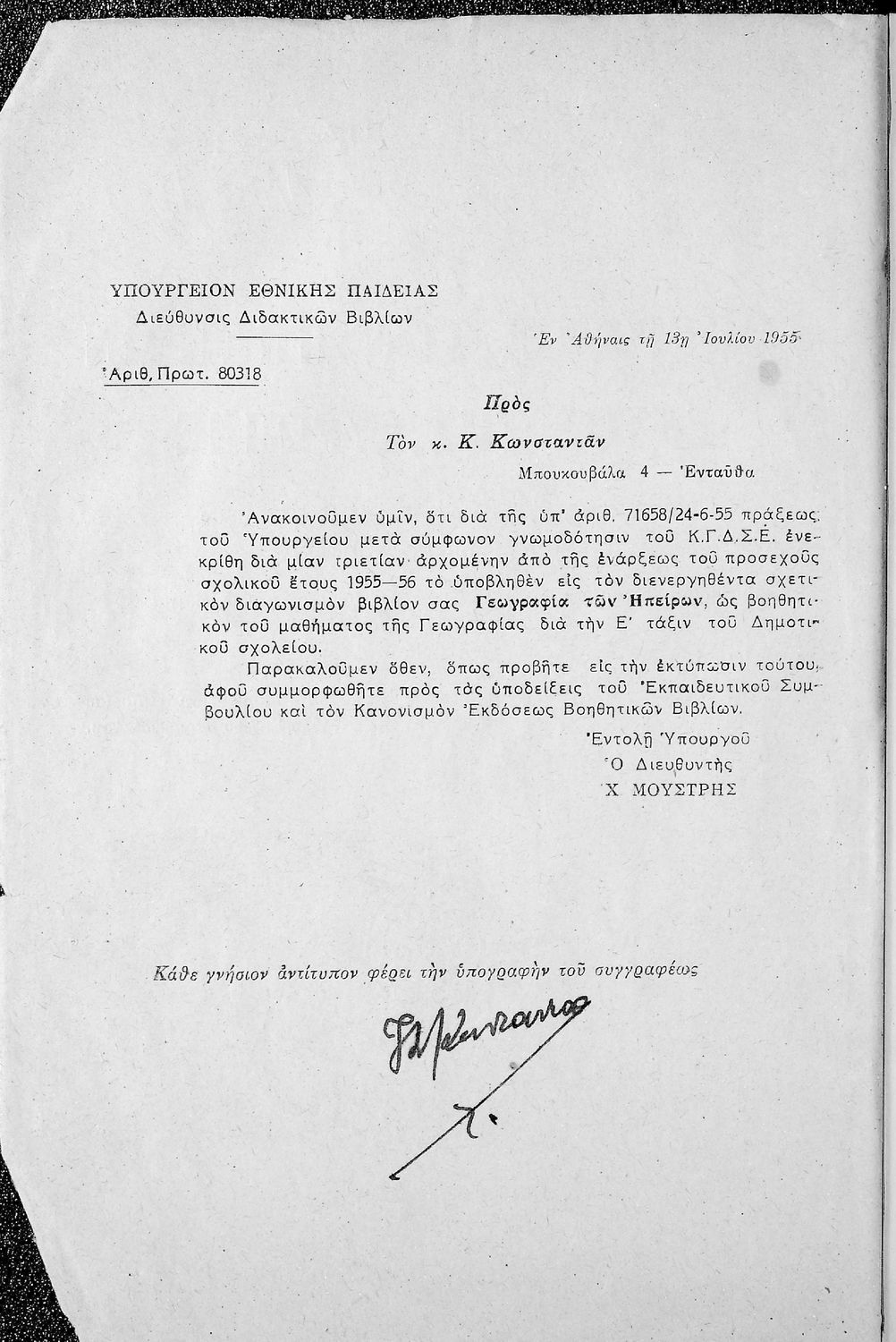 Εκδότης: Ιωάννης Ν. Σιδέρης Τόπος έκδοσης: Αθήνα Υπουργική απόφαση / Σύμβαση: 80318/13-7-1955 Έτος έγκρισης: 1955 |