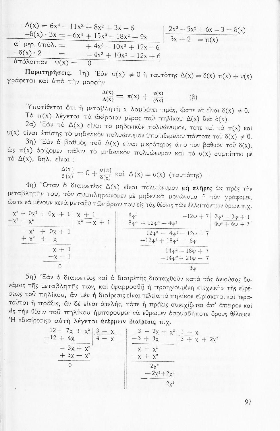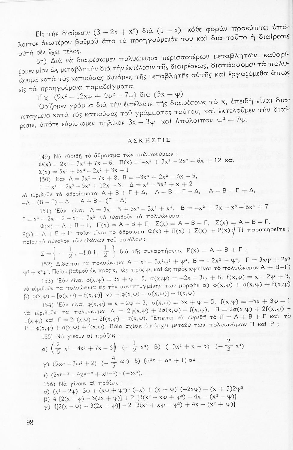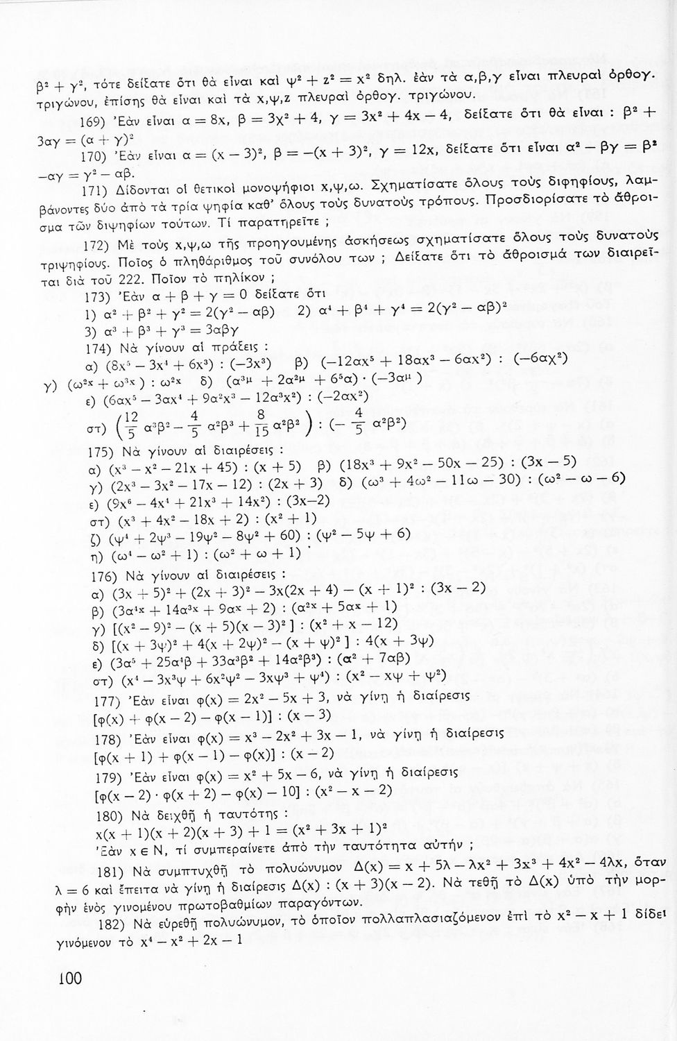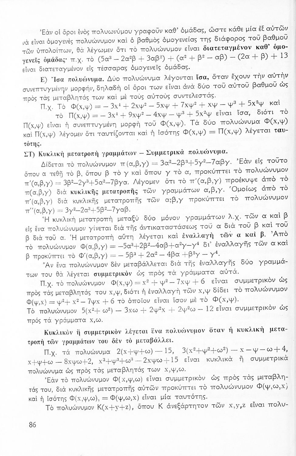 Βαθμίδα εκπαίδευσης: Δευτεροβάθμια Τάξη: Γ' Γυμνασίου Μάθημα: Μαθηματικά Γλώσσα: Απλή καθαρεύουσα Παρουσίαση περιεχομένου: Σχολικό εγχειρίδιο Μαθηματικών Γ΄ Γυμνασίου που περιέχει θεωρία, παραδείγματα και ασκήσεις και περιλαμβάνει Άλγεβρα, Τριγωνομετρία και στοιχεία Περιγραφικής Στατιστικής. Το εγχειρίδιο μεταγλωττίστηκε από τον συγγραφέα και τον Αθ. Ματσούκα. |